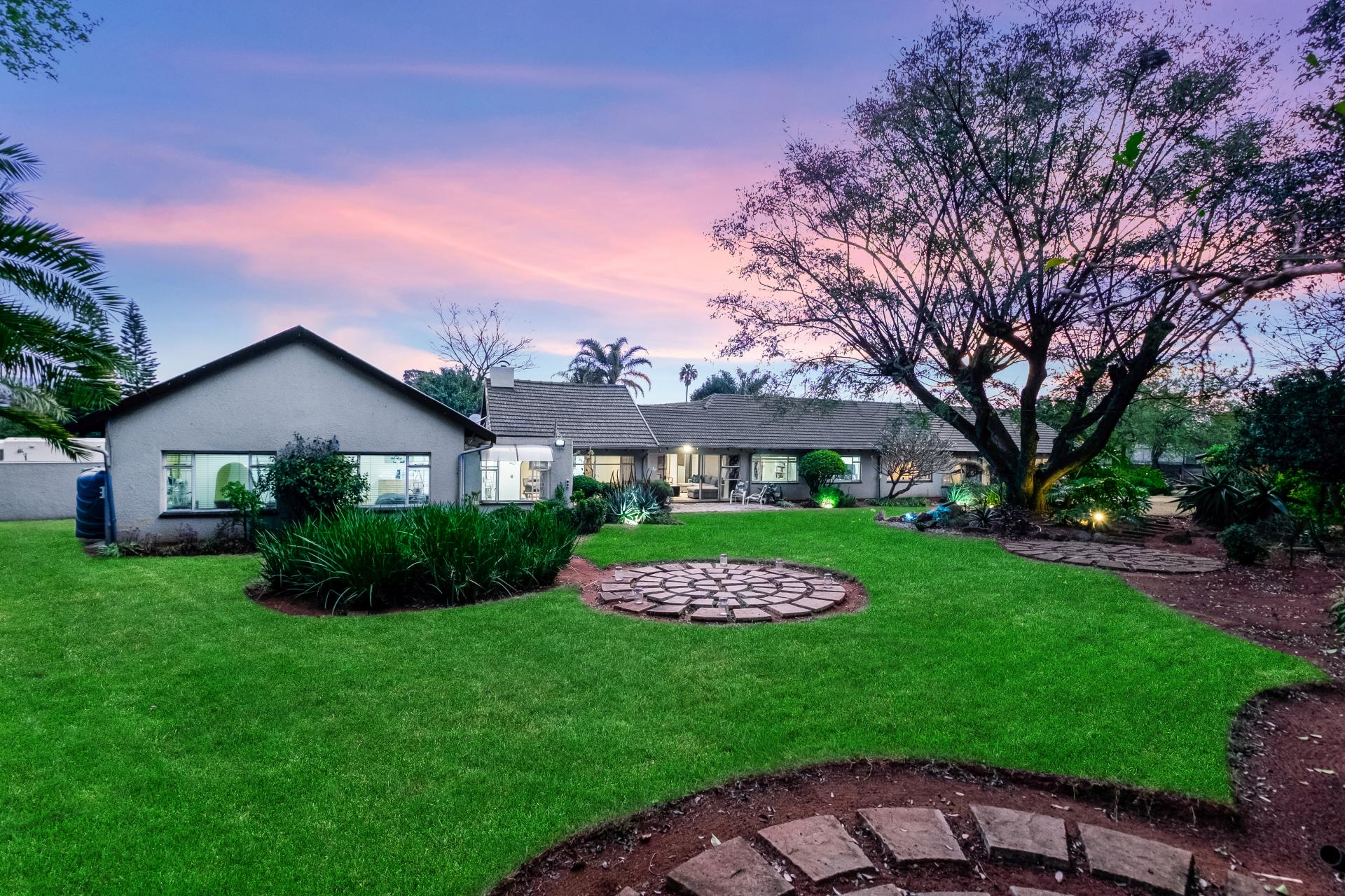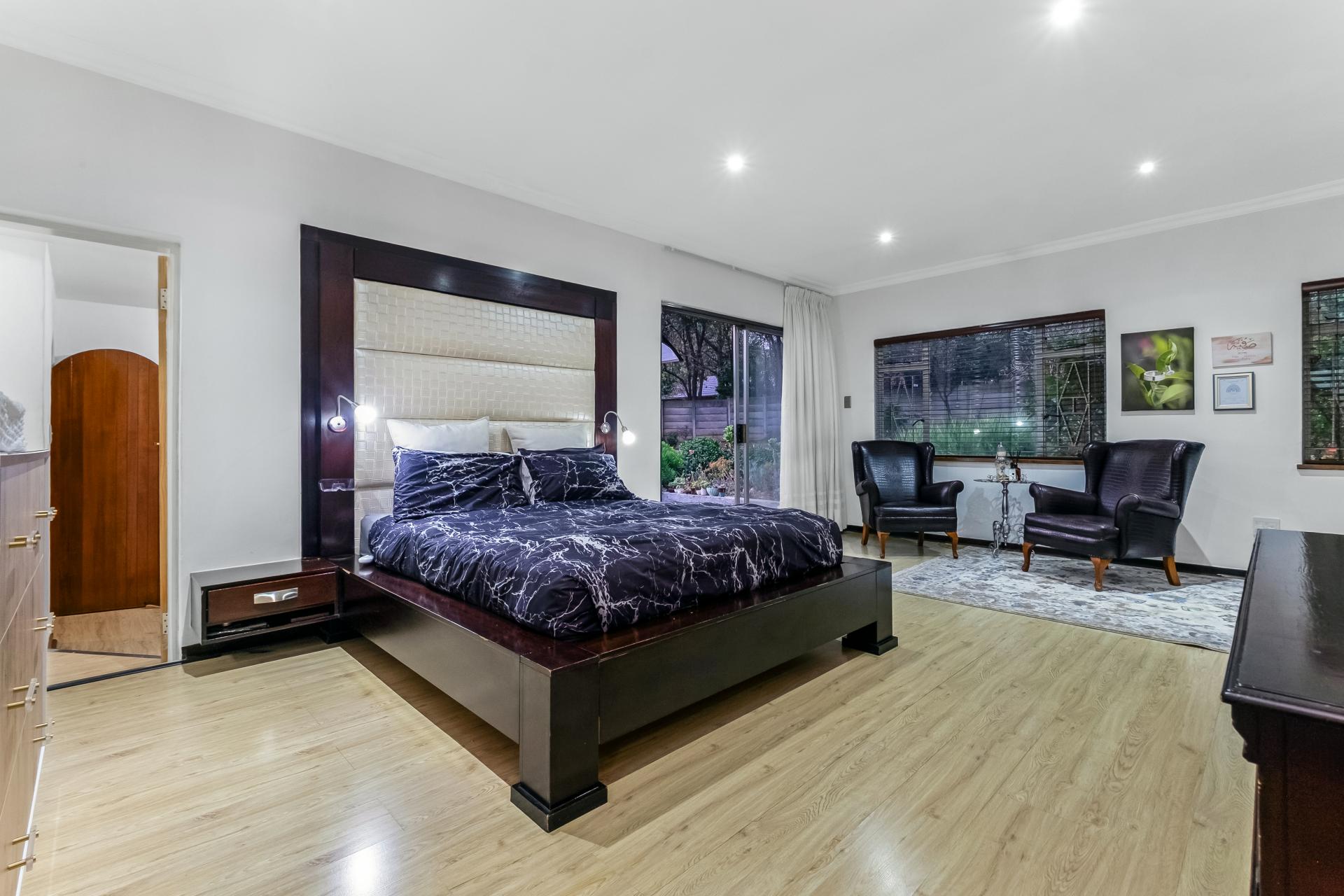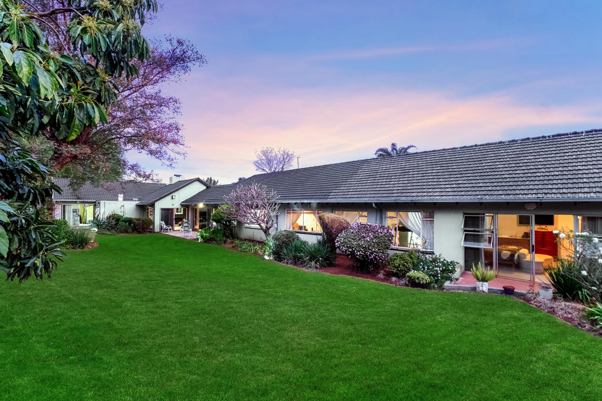 The main house comprises five well-appointed bedrooms, with the primary suite enjoying abundant cupboard space, a walk-in closet, and a luxurious en-suite bathroom that opens onto a private garden retreat. The home includes three bathrooms in total, designed with convenience and elegance in mind. The kitchen, fitted with a gas hob, flows seamlessly into the dining area and four spacious entertainment rooms, providing ample space for both intimate gatherings and large-scale entertaining.