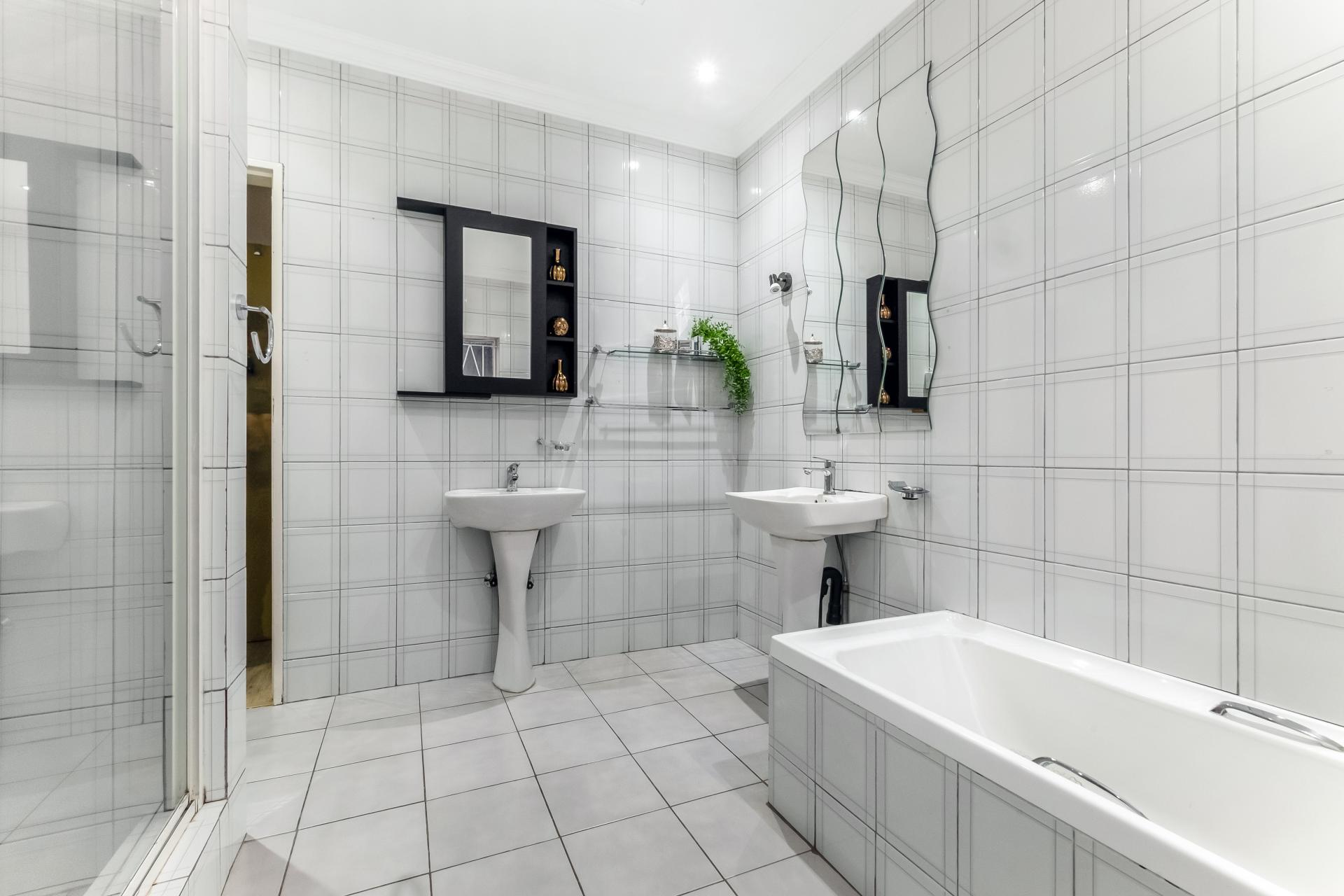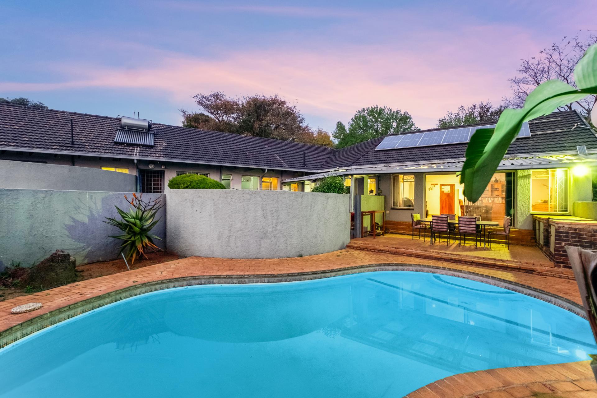 Modern living is enhanced by excellent infrastructure: the home is equipped with a 5kW inverter, 10kWh batteries, and six solar panels, ensuring energy efficiency. Hot water is supplied by a combination of one gas geyser, one solar geyser, and two electrical geysers. Security is paramount, with CCTV coverage via 13 cameras, complemented by Wi-Fi access points throughout the house. A borehole with filtration connects directly to the home, ensuring a reliable water supply.