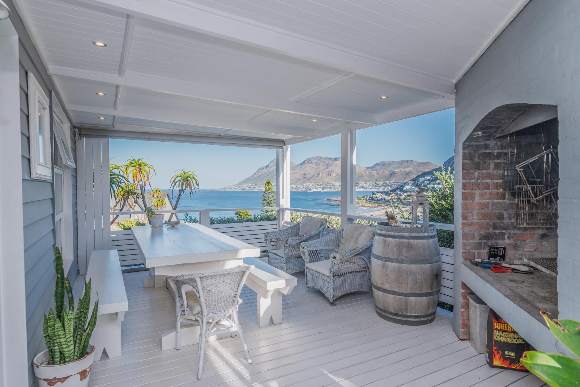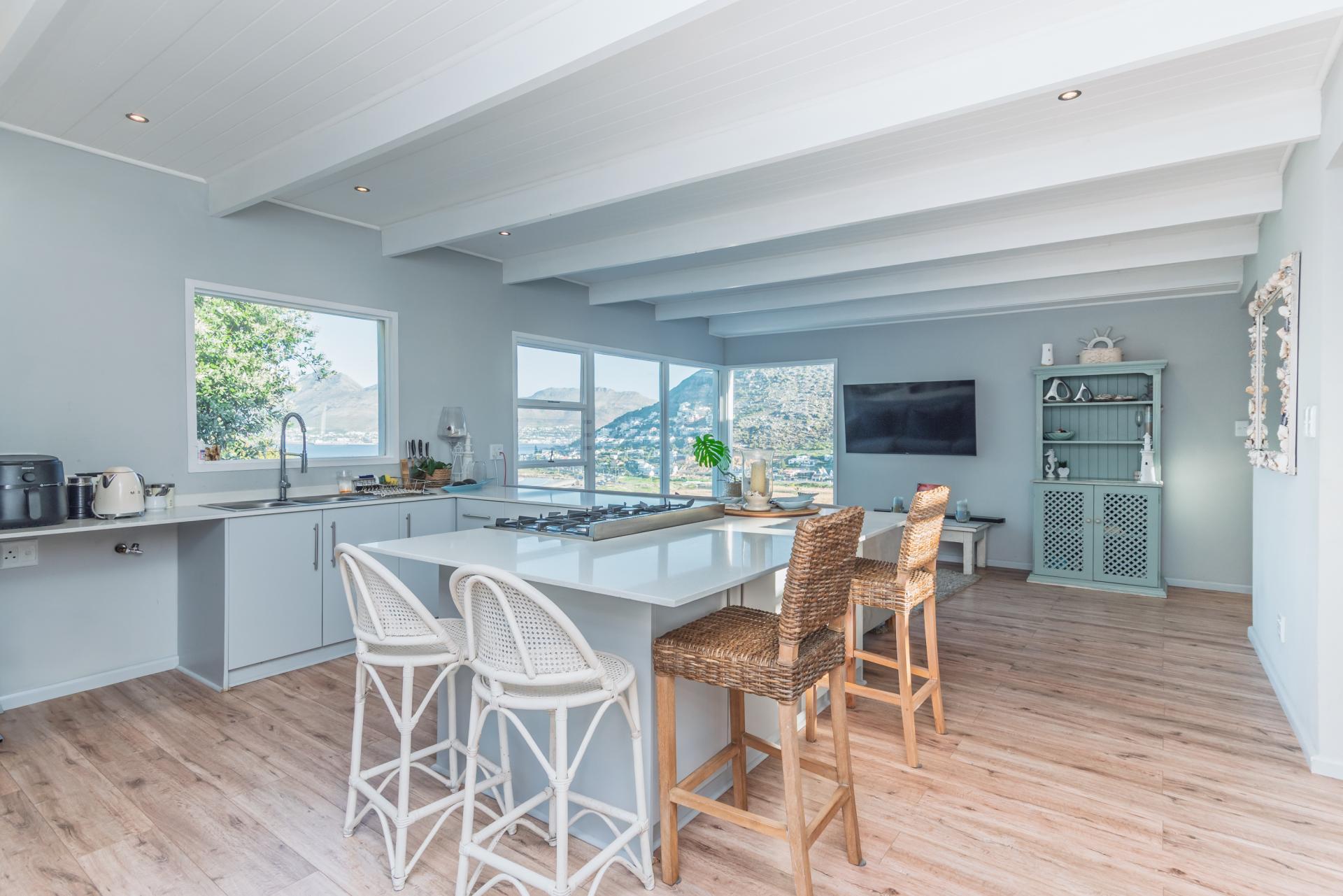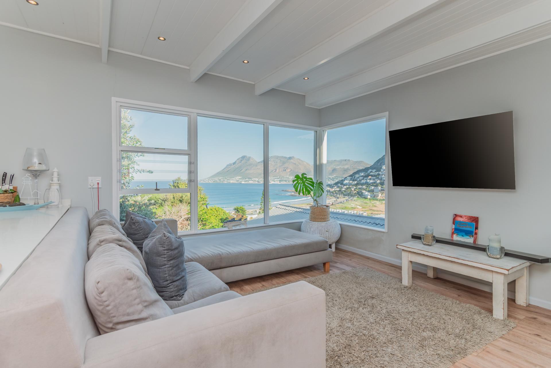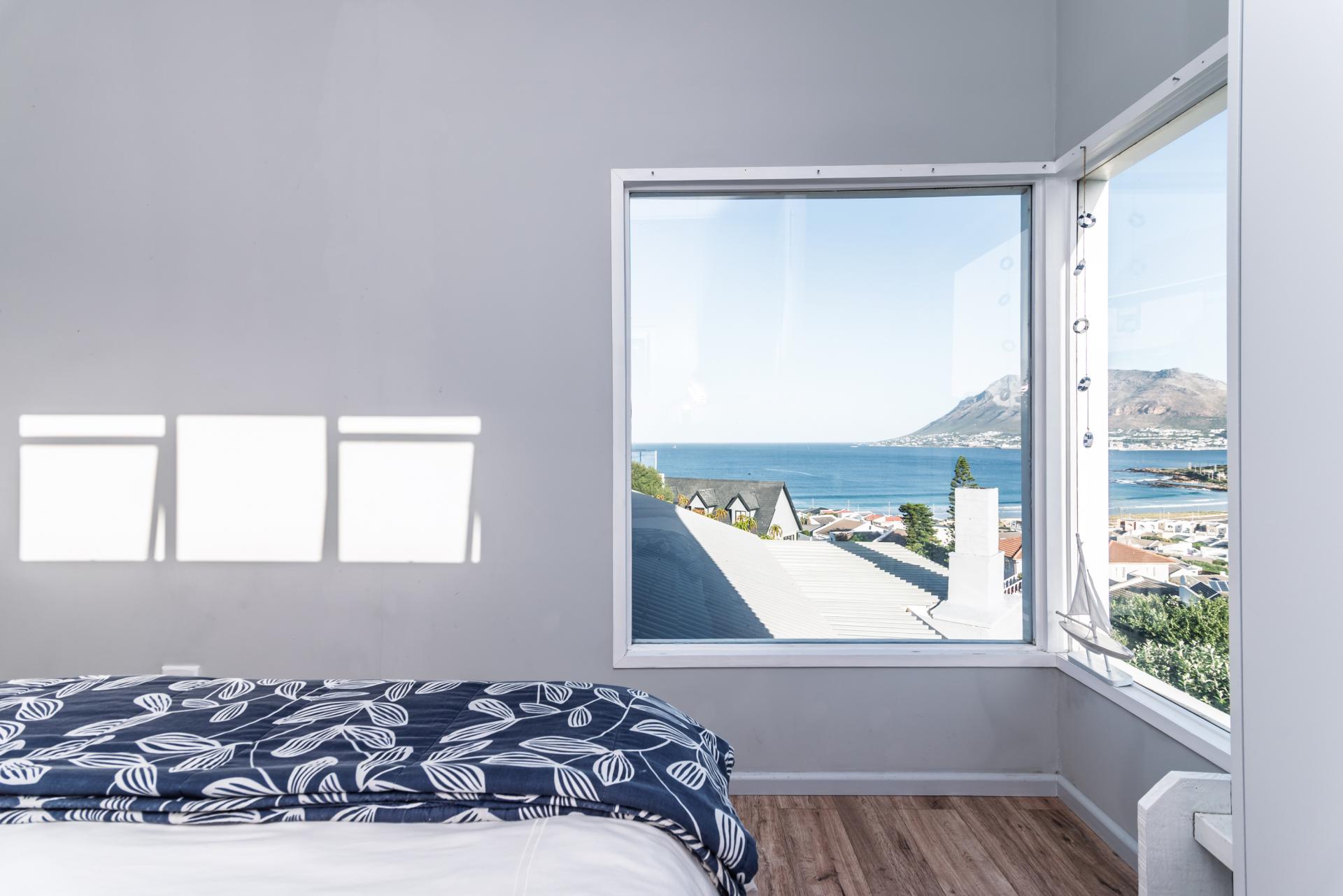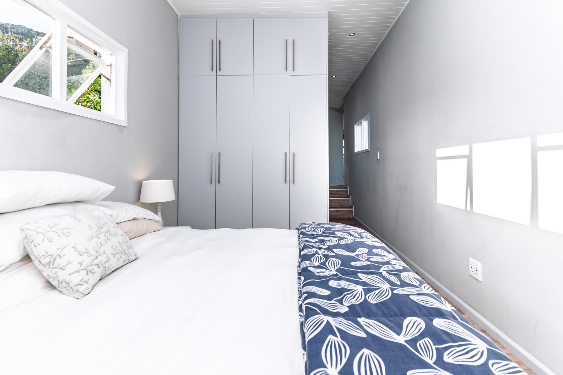 A winding staircase leads you to the front door, upon entering you have a bedroom on either side, both with built in cupboards, a few steps further and you are again greeted by magnificent sea views from the open plan kitchen to the huge corner window in the lounge. A fully fitted kitchen, stone counter tops and stove. A short passage leads you to guest cloakroom, followed by a full family bathroom and master bedroom with lots of cupboards and breathtaking views to wake up to. Sliding doors from the kitchen lead you to a raised wooden deck with a pergola and built-in braai and garden.