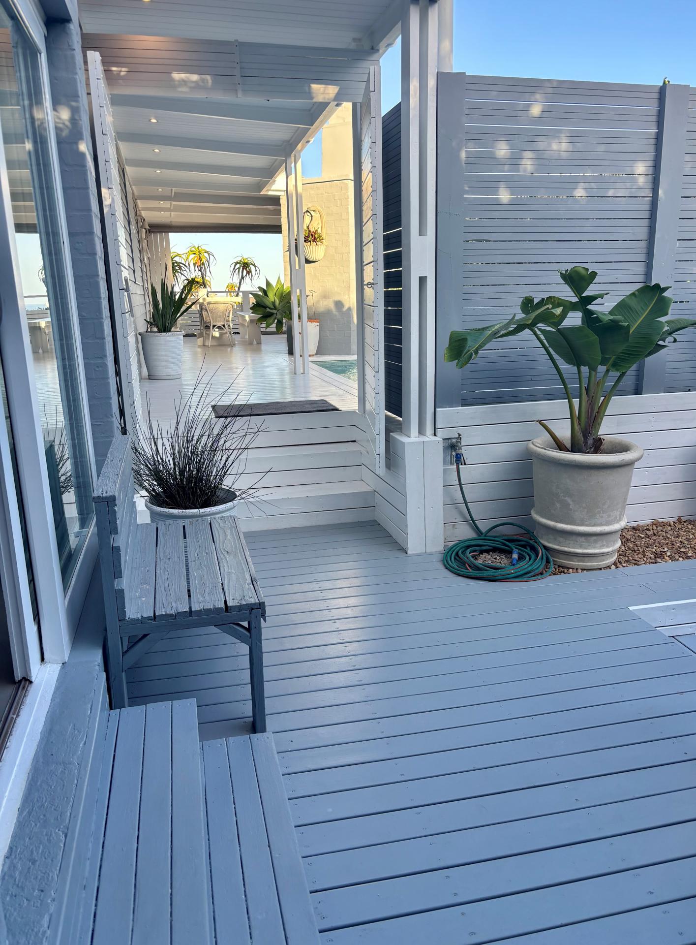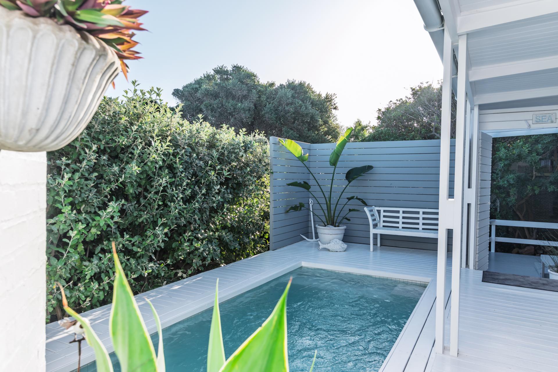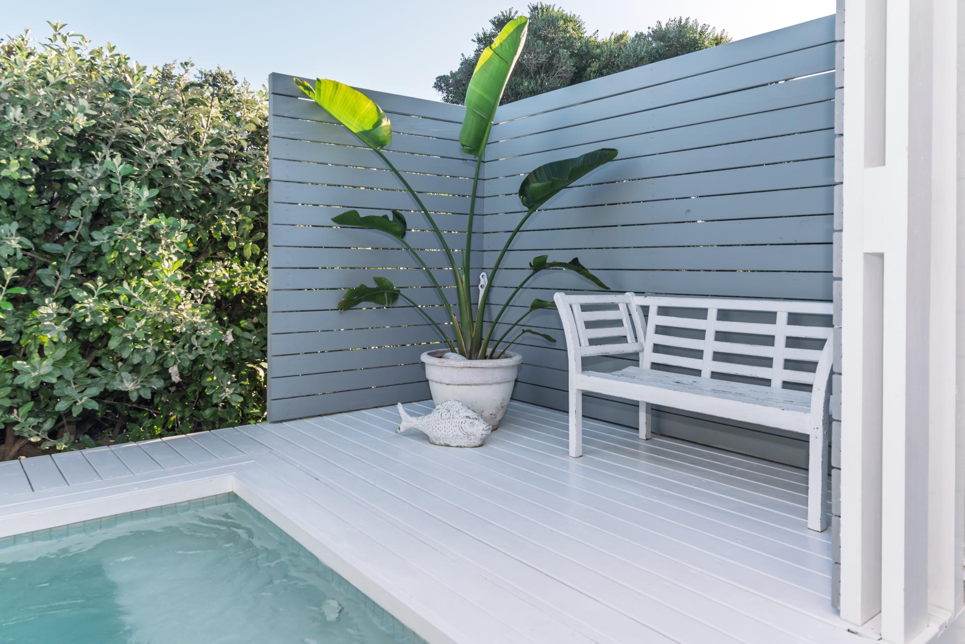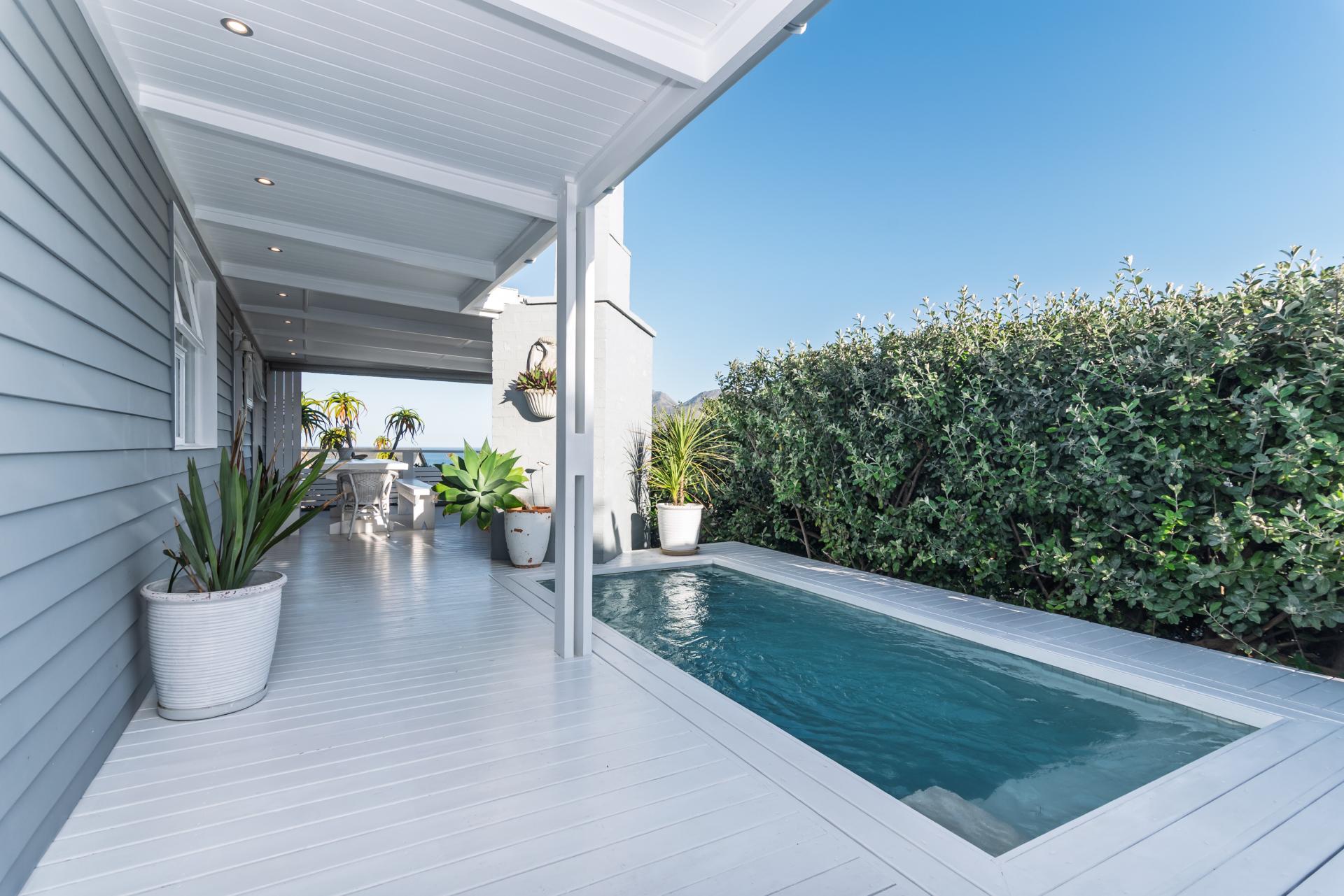 Entering through double doors onto white wooden decks, you are immediately welcomed by the sea views and gorgeous wind protected splash pool. A few steps further covering your front door, is a covered deck with an entertainers size built-in braai. A tranquil lounge open to a beautifully fitted kitchen complete with stone counter tops and stove, seamlessly flows into the dining room which opens to a pretty back garden and outside storeroom. Two double bedrooms, share a full bathroom, the master bedroom has a walk in dressing room.