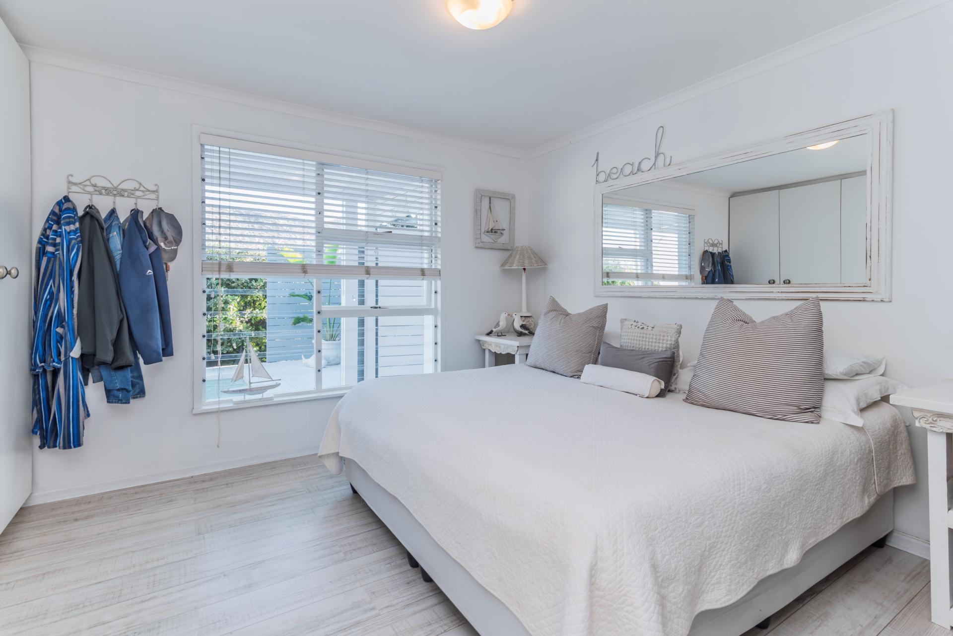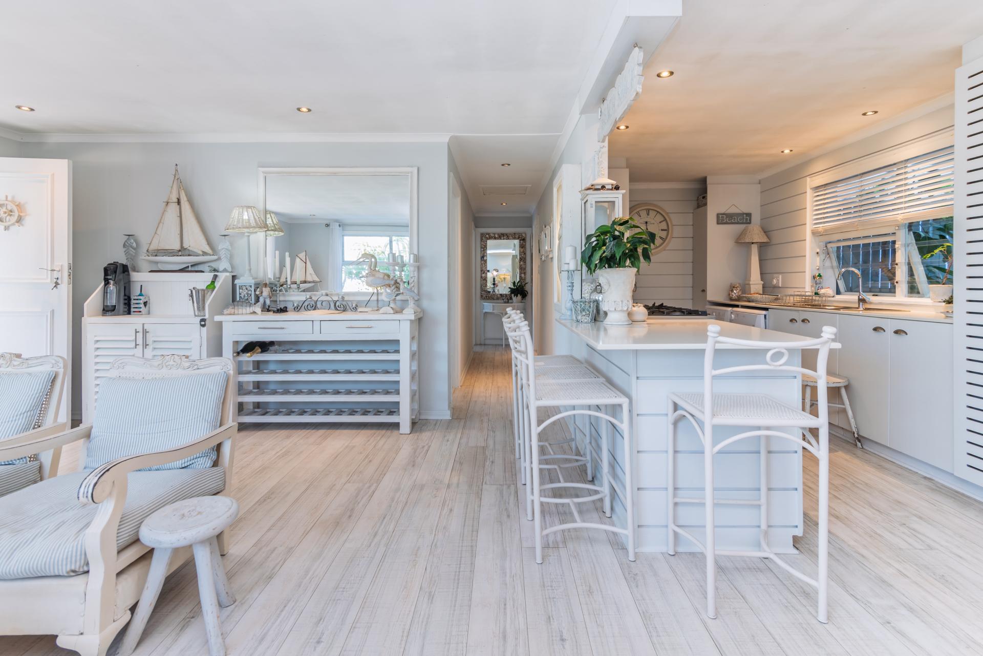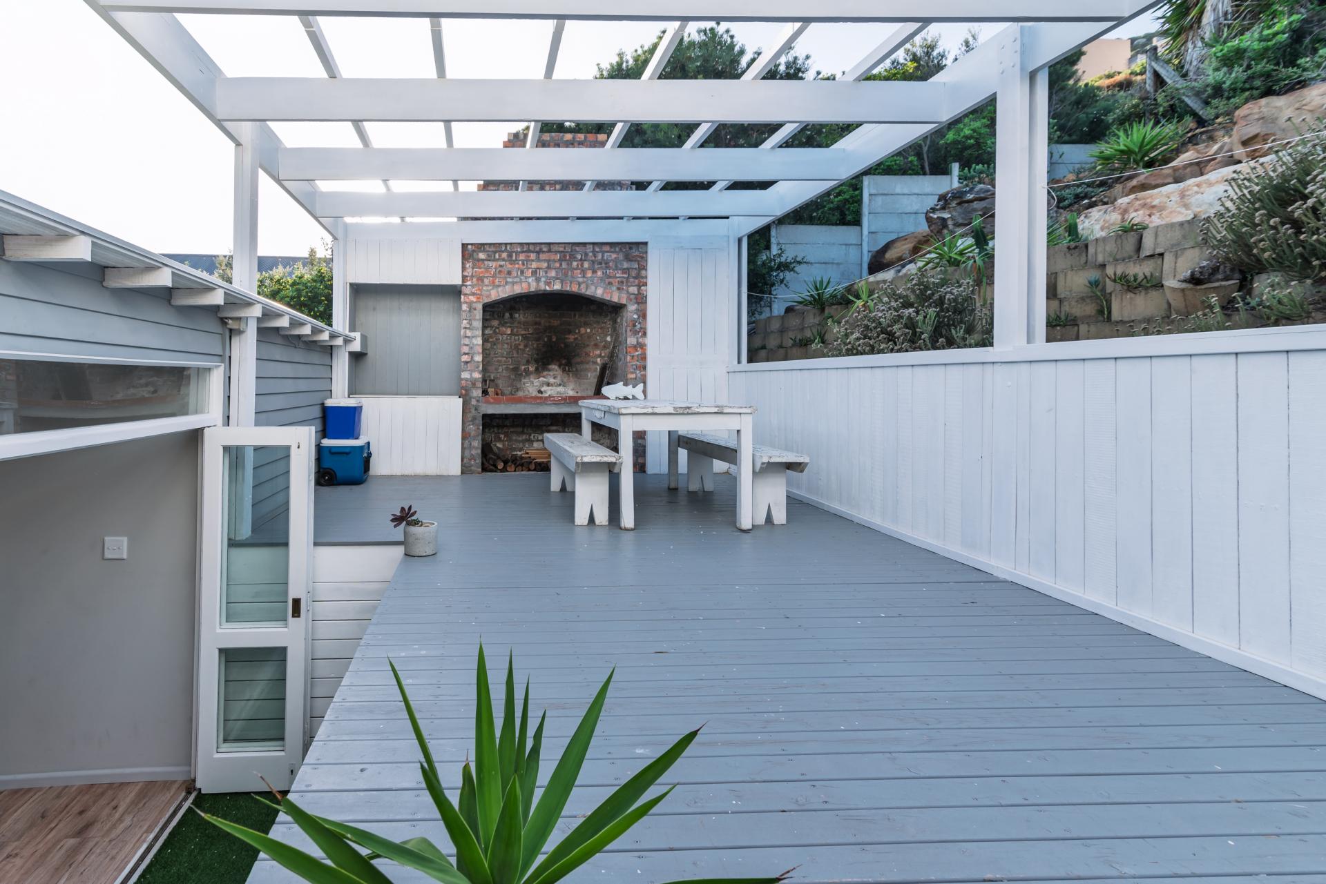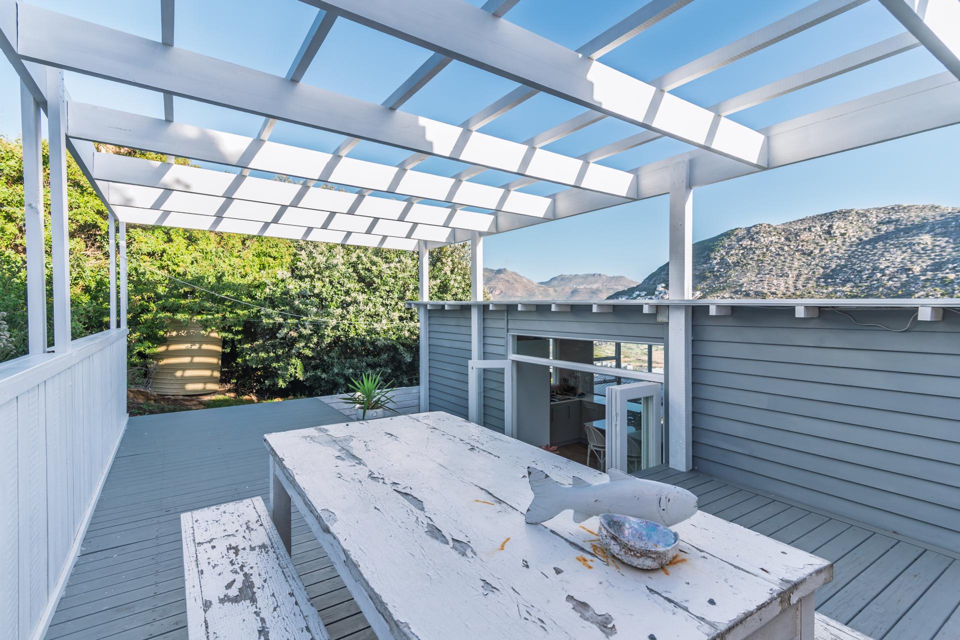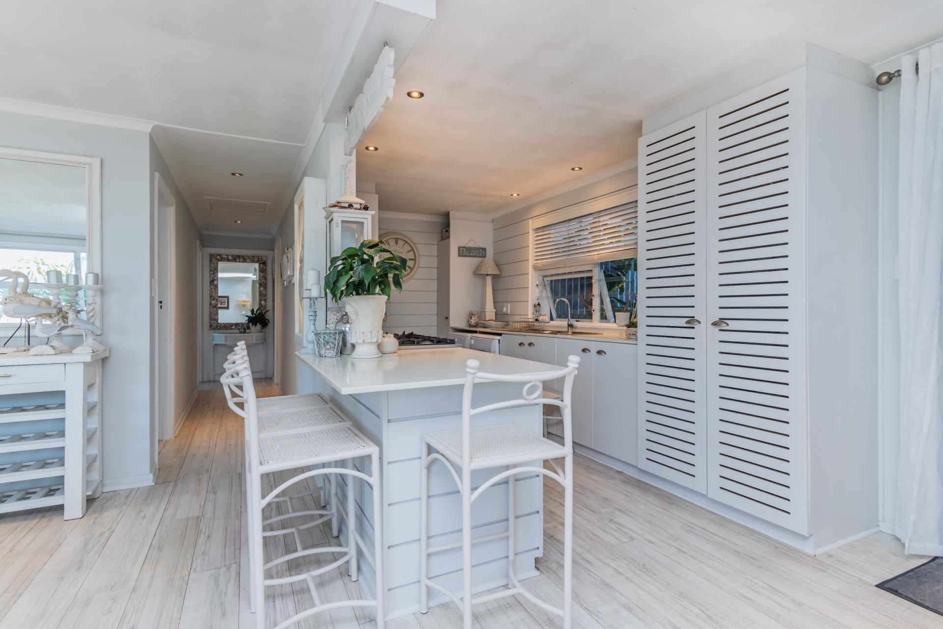 Entering through double doors onto white wooden decks, you are immediately welcomed by the sea views and gorgeous wind protected splash pool. A few steps further covering your front door, is a covered deck with an entertainers size built-in braai. A tranquil lounge open to a beautifully fitted kitchen complete with stone counter tops and stove, seamlessly flows into the dining room which opens to a pretty back garden and outside storeroom. Two double bedrooms, share a full bathroom, the master bedroom has a walk in dressing room.