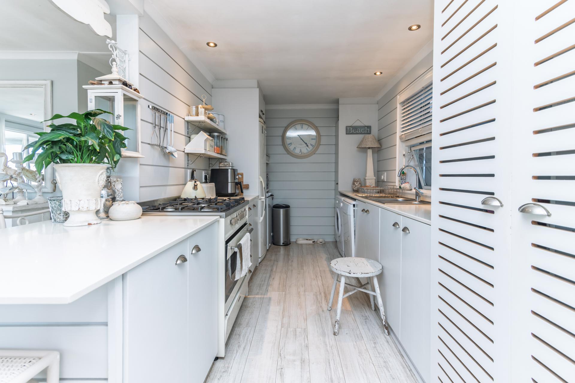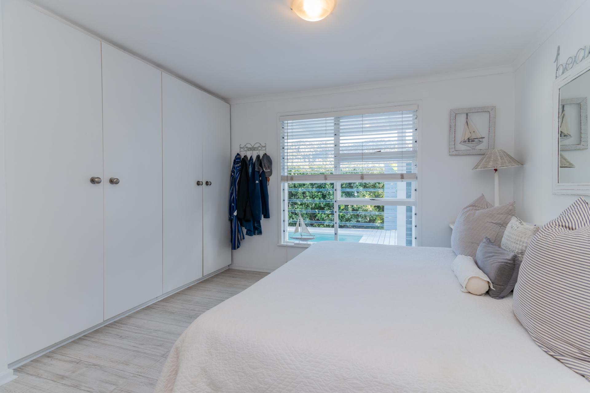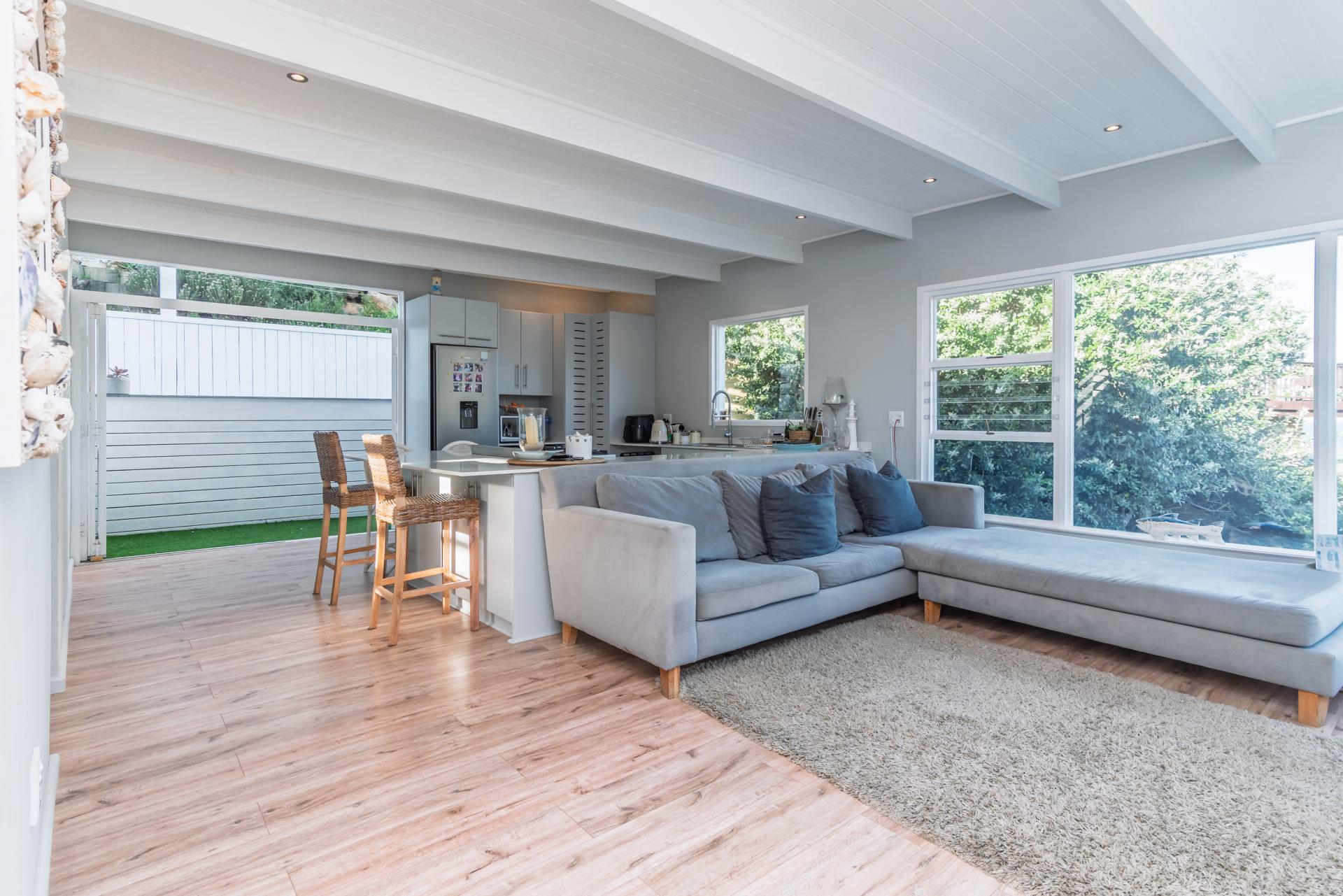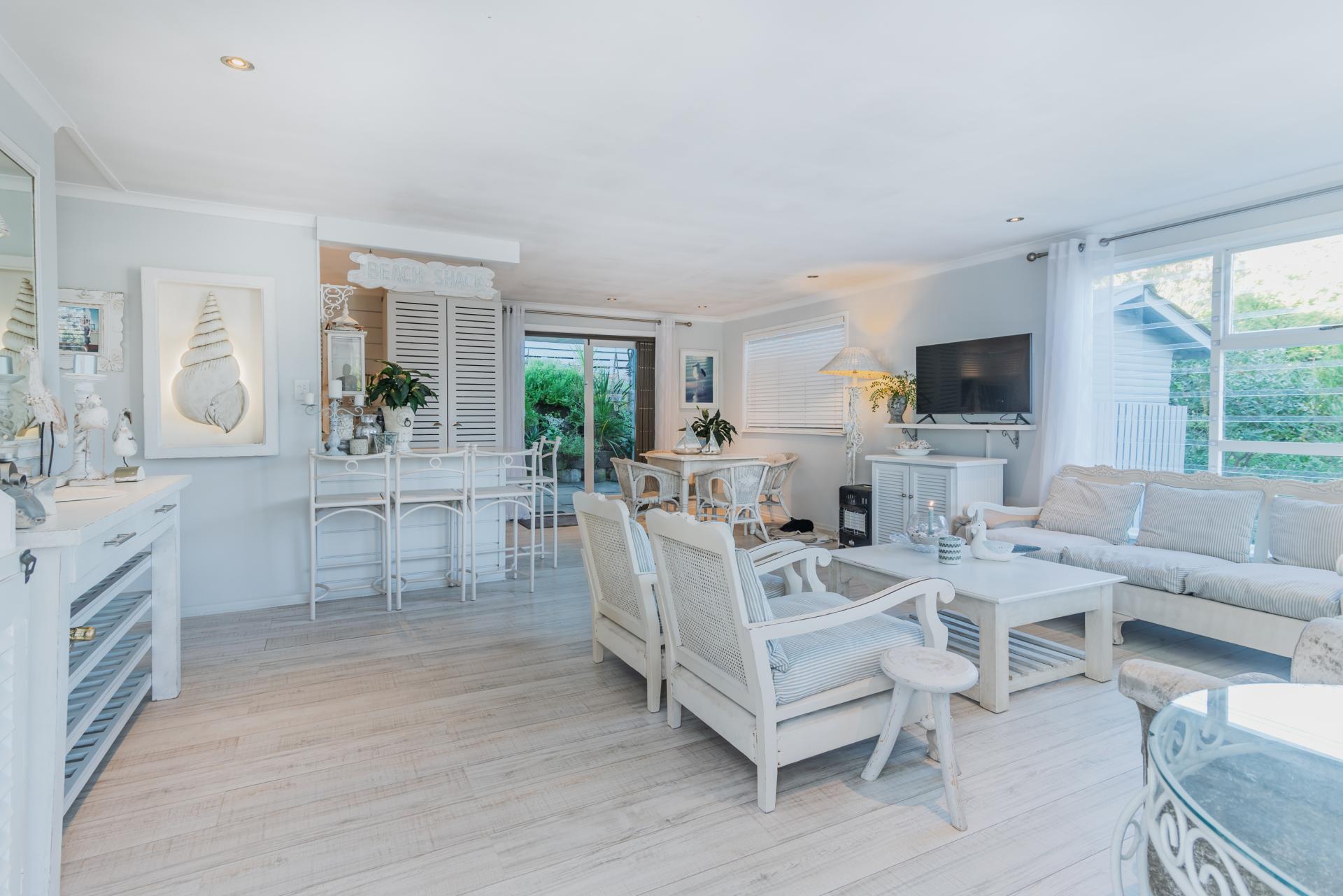 Entering through double doors onto white wooden decks, you are immediately welcomed by the sea views and gorgeous wind protected splash pool. A few steps further covering your front door, is a covered deck with an entertainers size built-in braai. A tranquil lounge open to a beautifully fitted kitchen complete with stone counter tops and stove, seamlessly flows into the dining room which opens to a pretty back garden and outside storeroom. Two double bedrooms, share a full bathroom, the master bedroom has a walk in dressing room.