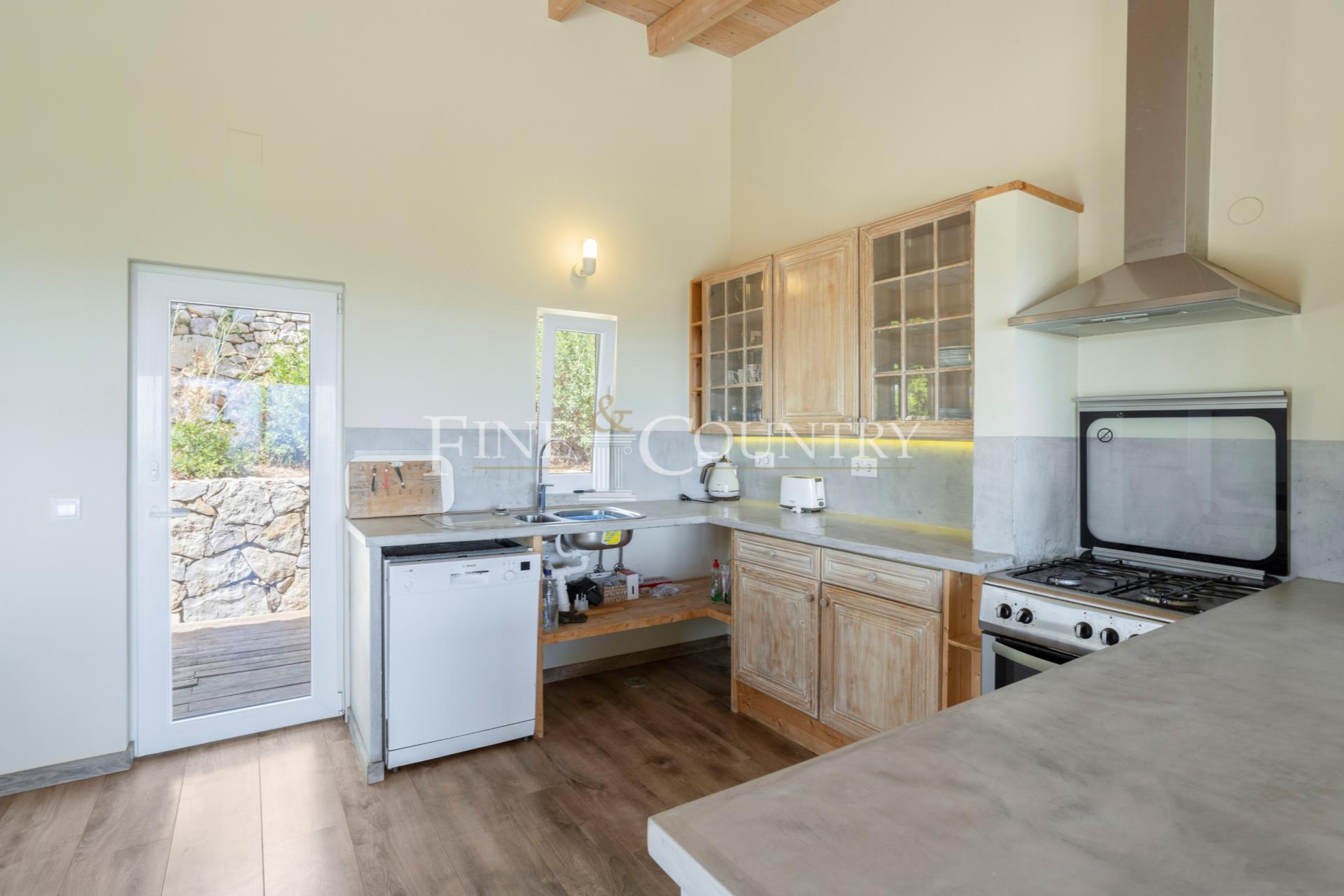 The upper floor hosts two additional bedrooms, each with access to its own bathroom. The master suite benefits from a private terrace, offering stunning views. A charming wooden cottage, perfect for guests or a housekeeper, sits adjacent to the main house. This unregistered annex includes an open-plan living space, kitchen, two bedrooms, and two bathrooms, ensuring ample accommodation options.