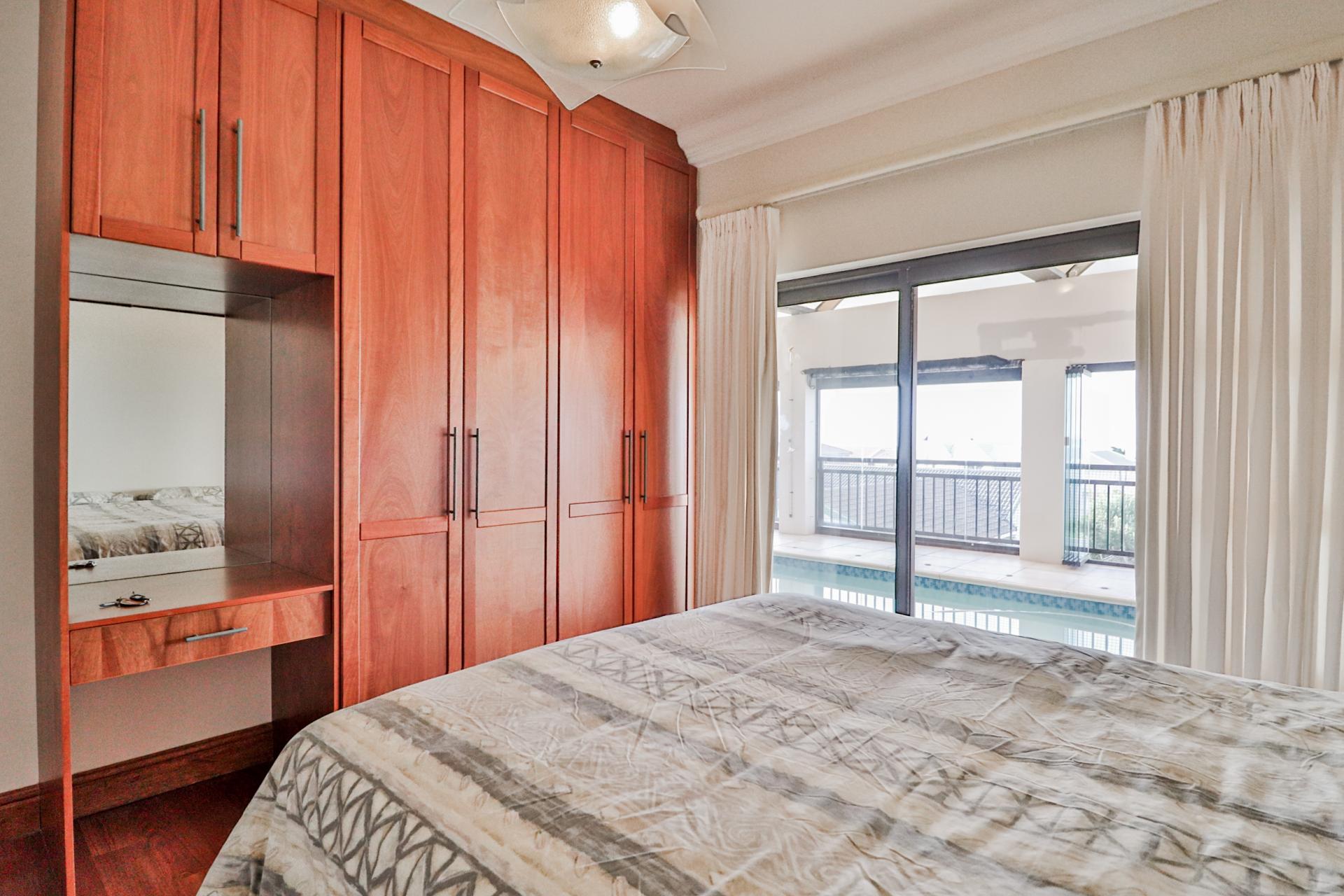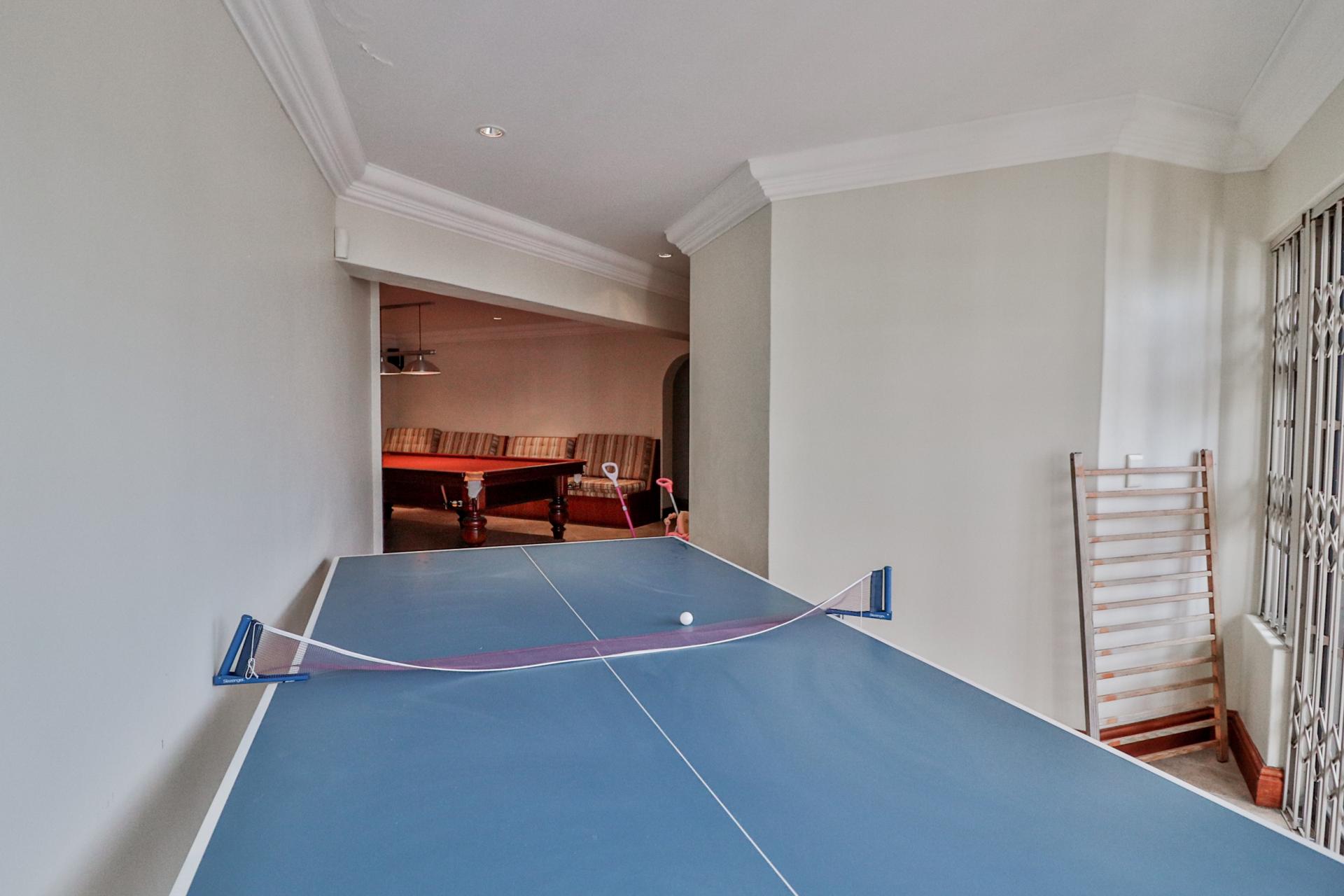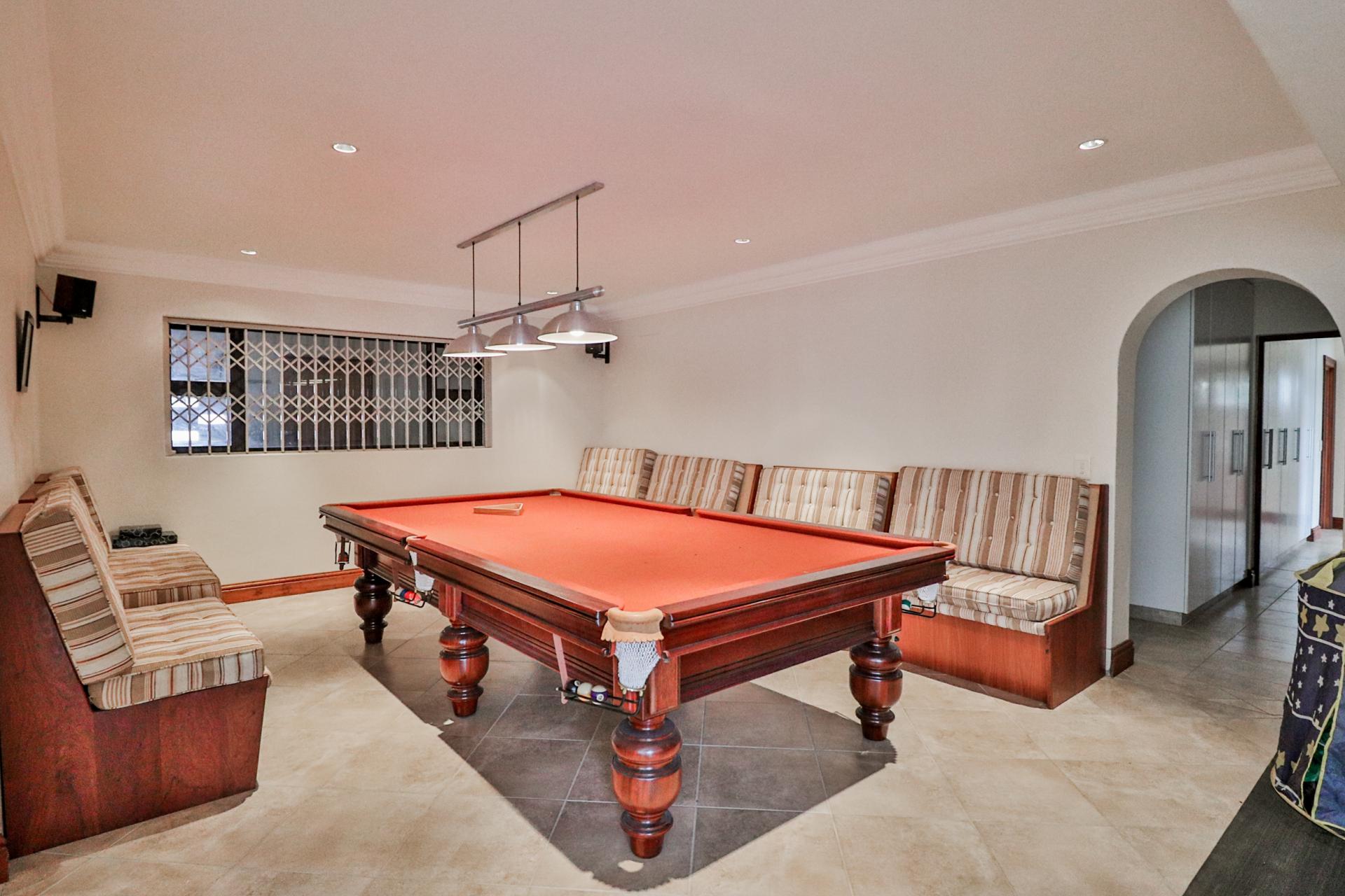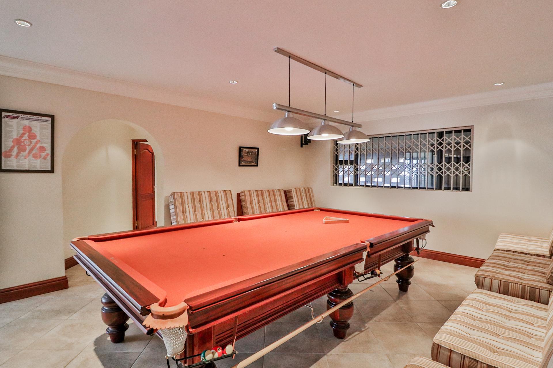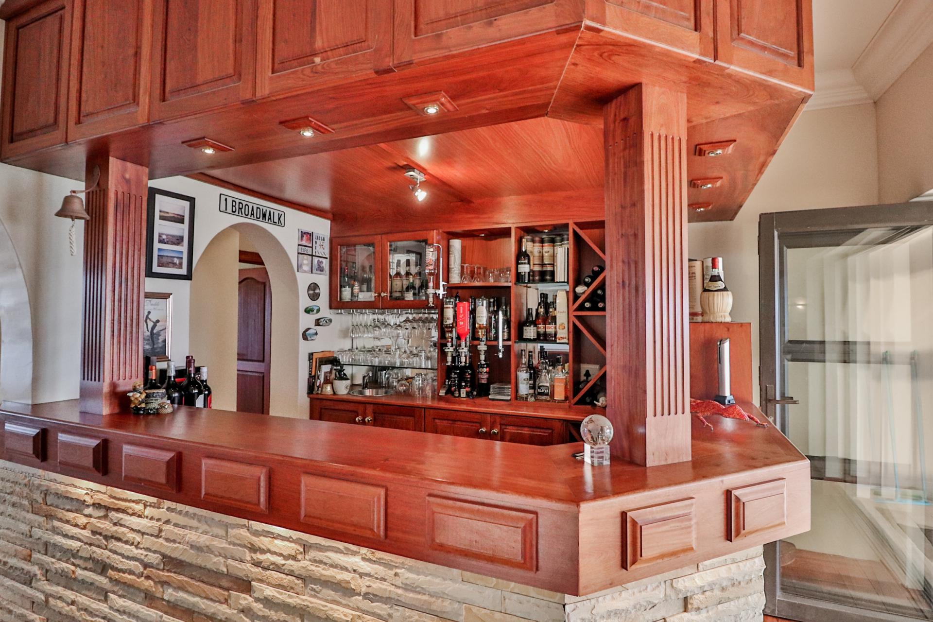 Designed for entertaining, the home features an impressive playroom large enough for both a billiard and tennis table, a sparkling pool, jacuzzi, pizza oven, and a purpose-built braai area. The highlight is a custom bar, beautifully crafted from imported Jatoba Rosewood, creating a warm and inviting social hub.