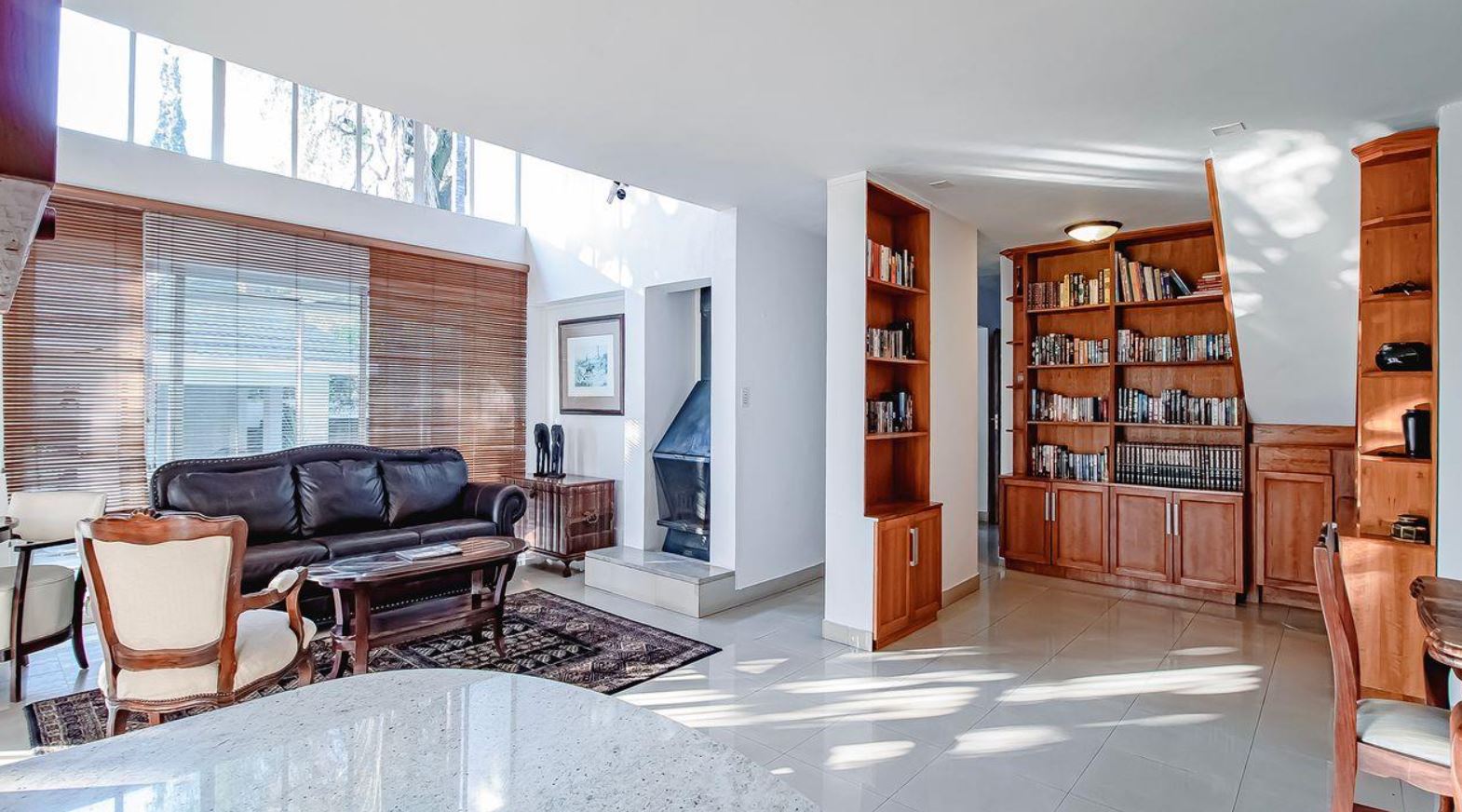 • A spacious and inviting living and dining area, featuring a fireplace and a built-in library bookshelf—ideal for cozy reading nooks or showcasing treasured collections. This space flows into a glass-enclosed