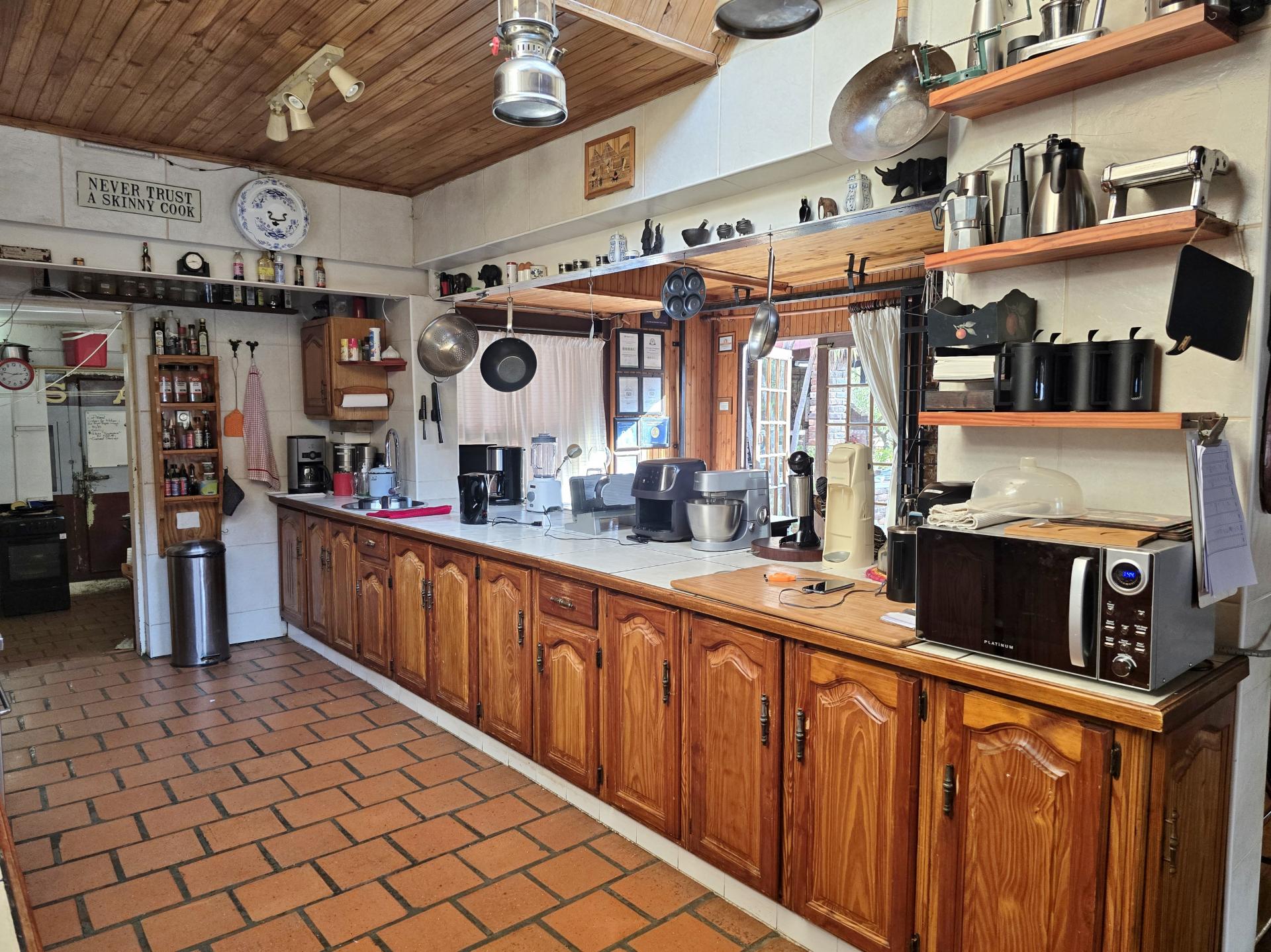 • Upper Level: This floor boasts 3 luxurious bedrooms, each with its own en-suite bathroom, ensuring privacy and comfort for guests. A spacious dining area with a cozy fireplace sets the scene for memorable meals. The heart of this level is an open kitchen, featuring a 90cm gas stove, a scullery equipped with a walk-in fridge, two ovens, three fridges, and a large chest freezer. A prep station, two washing machines, and a dryer complete this fully equipped culinary hub. Ample storage is provided by a dedicated pantry with numerous shelves. Additionally, there's a self-contained 1-bedroom apartment with a full bathroom, two private terraces, and a small garden, perfect for an owner's suite or extended guest accommodation.