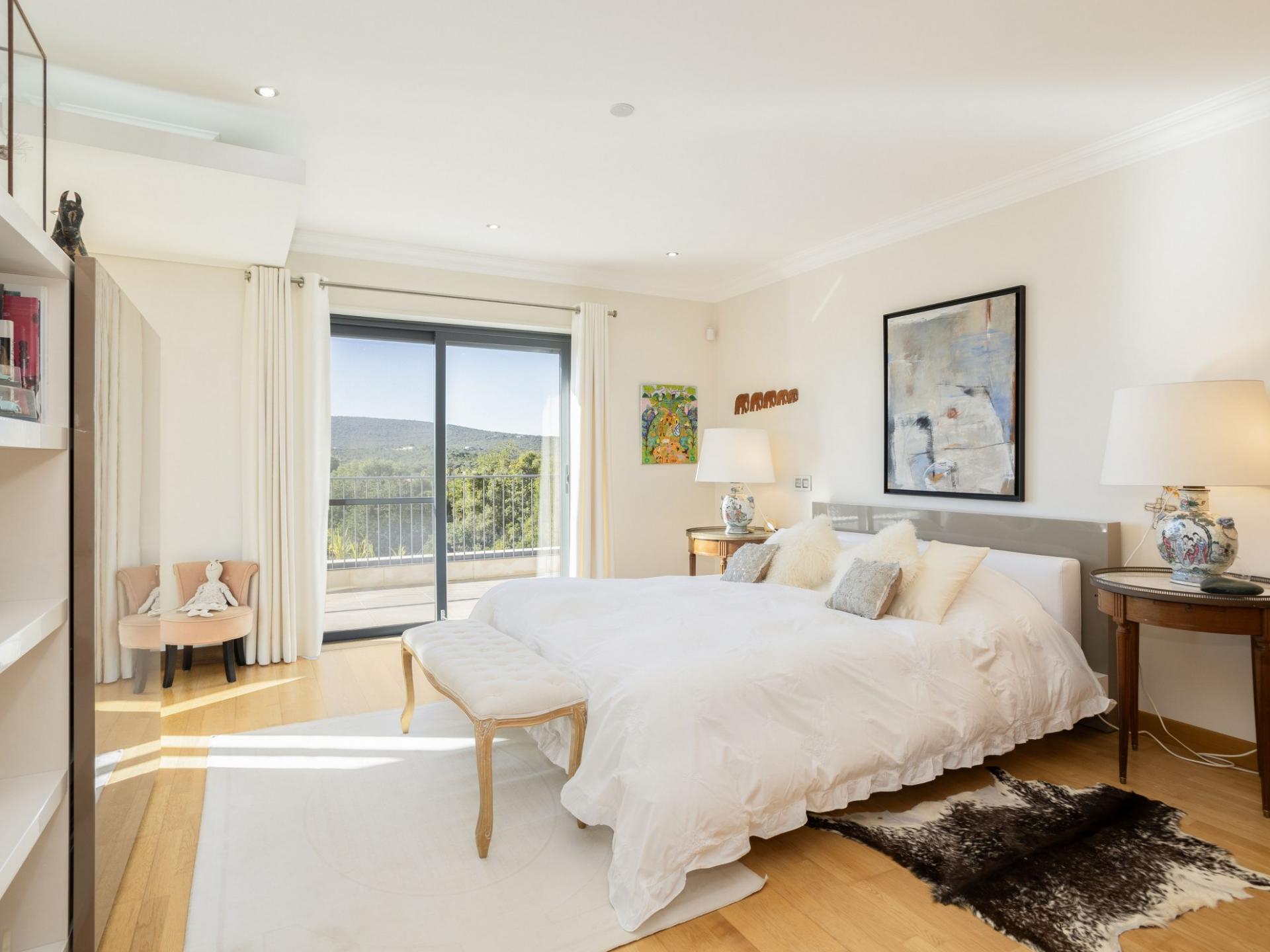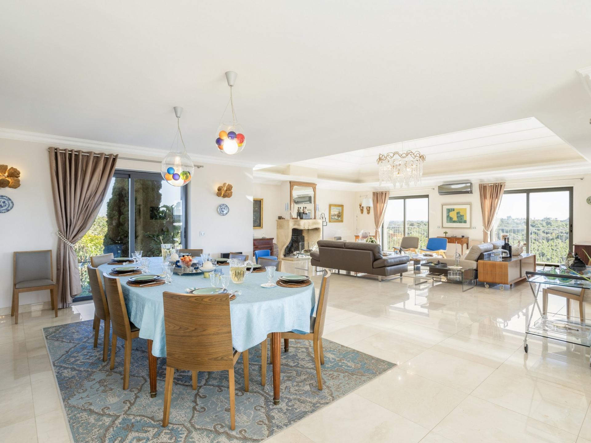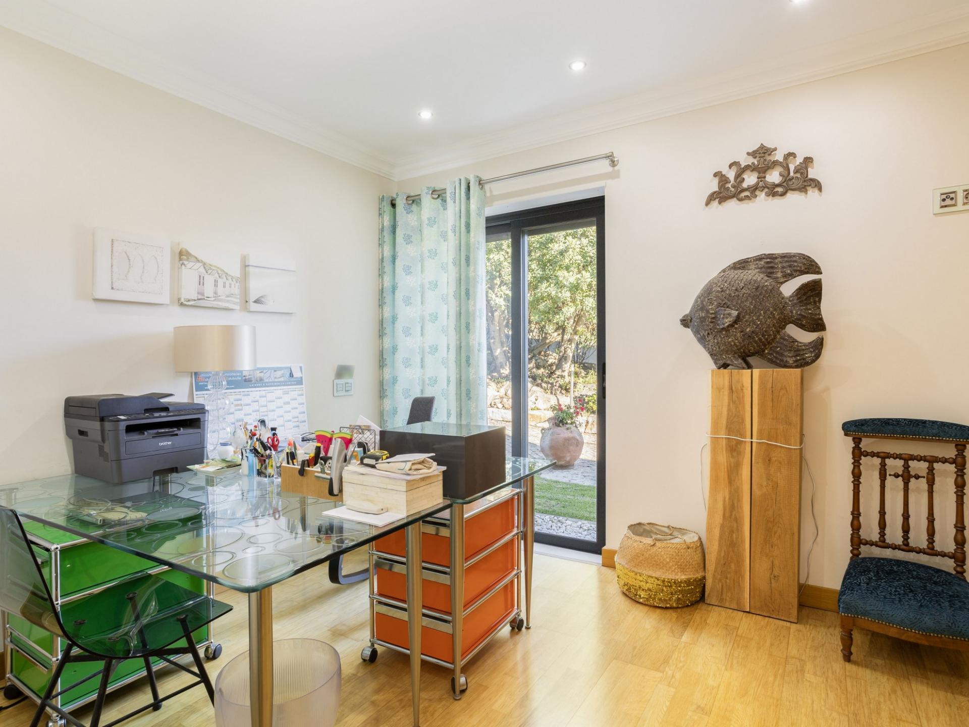 The main house, spanning three levels, is a harmonious blend of elegance and practicality. The ground floor welcomes you with an imposing entrance hall leading to a spacious 90 m² living area. Featuring vaulted ceilings, a fireplace, and expansive glass doors, the living-dining room is awash with natural light and boasts breathtaking views. The fully equipped kitchen is both modern and functional, designed to meet all your culinary needs. Additionally, this level includes two refined suites with private terraces and a study, ensuring every comfort is catered to.