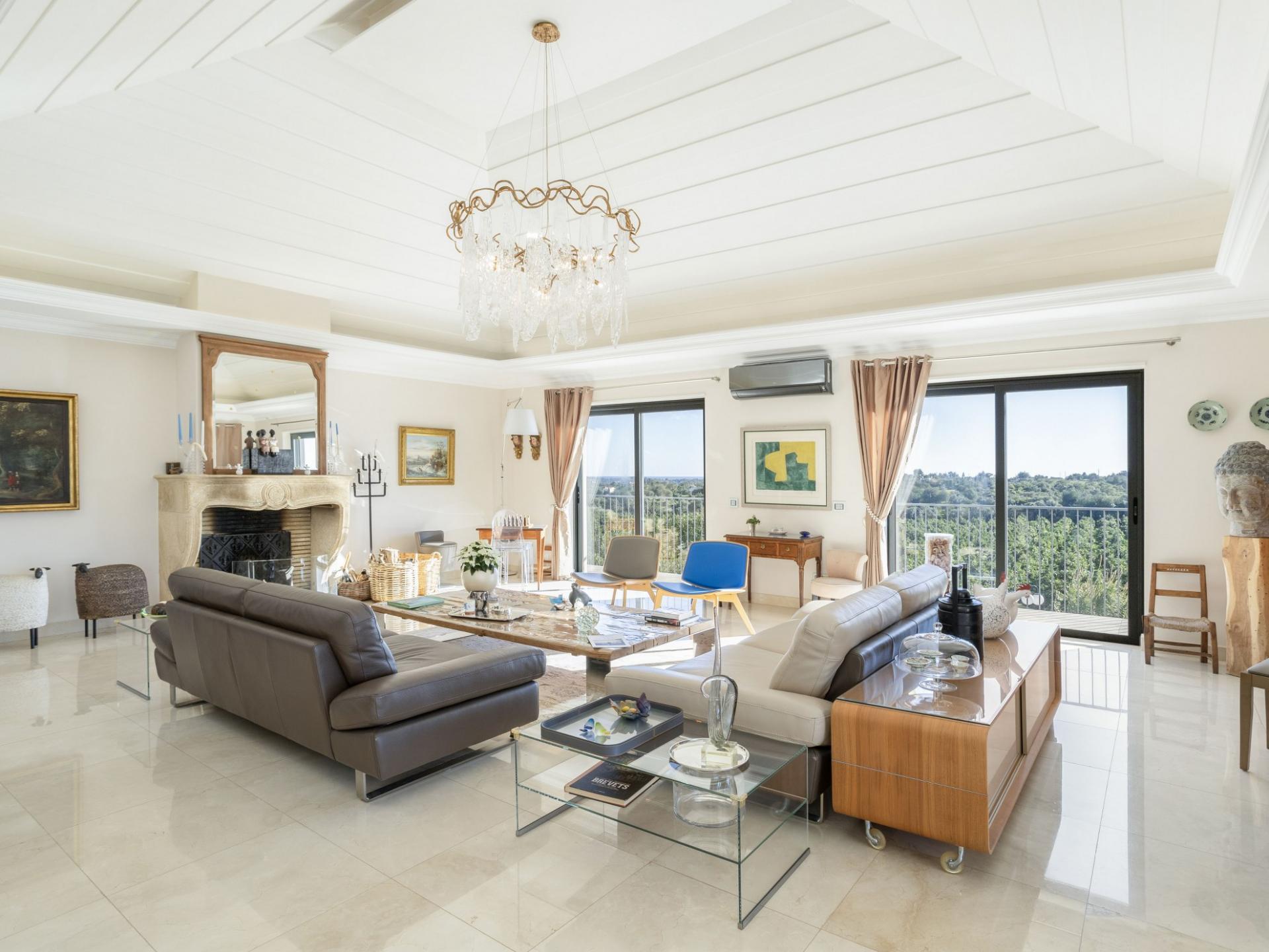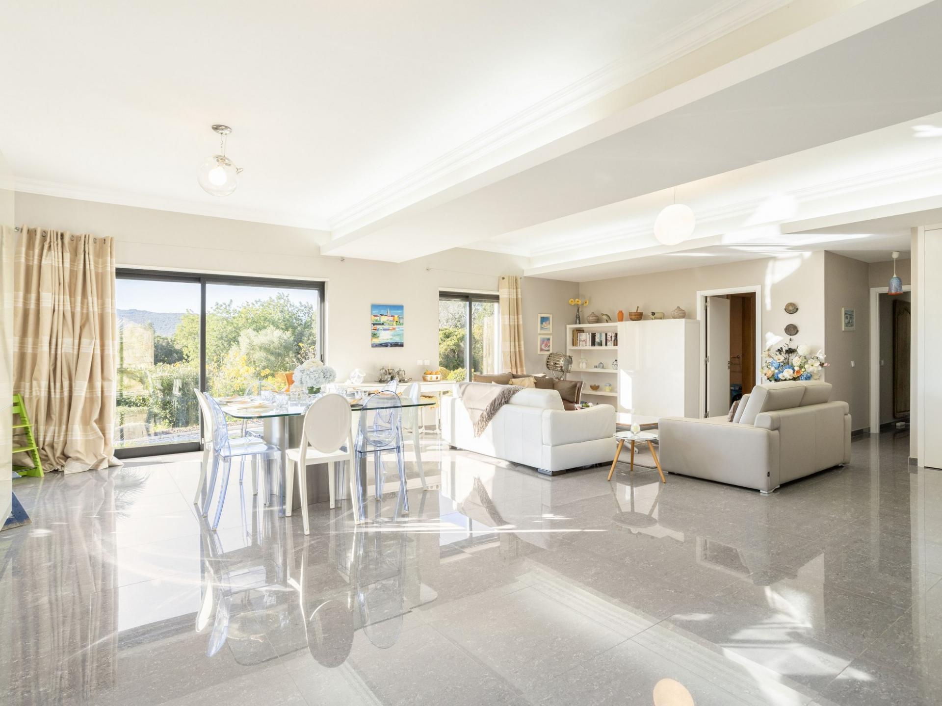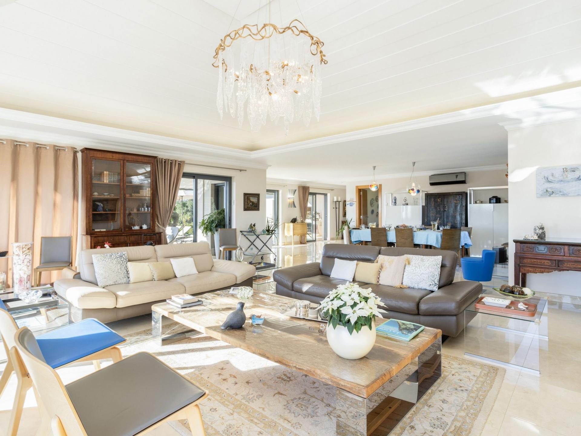 The main house, spanning three levels, is a harmonious blend of elegance and practicality. The ground floor welcomes you with an imposing entrance hall leading to a spacious 90 m² living area. Featuring vaulted ceilings, a fireplace, and expansive glass doors, the living-dining room is awash with natural light and boasts breathtaking views. The fully equipped kitchen is both modern and functional, designed to meet all your culinary needs. Additionally, this level includes two refined suites with private terraces and a study, ensuring every comfort is catered to.