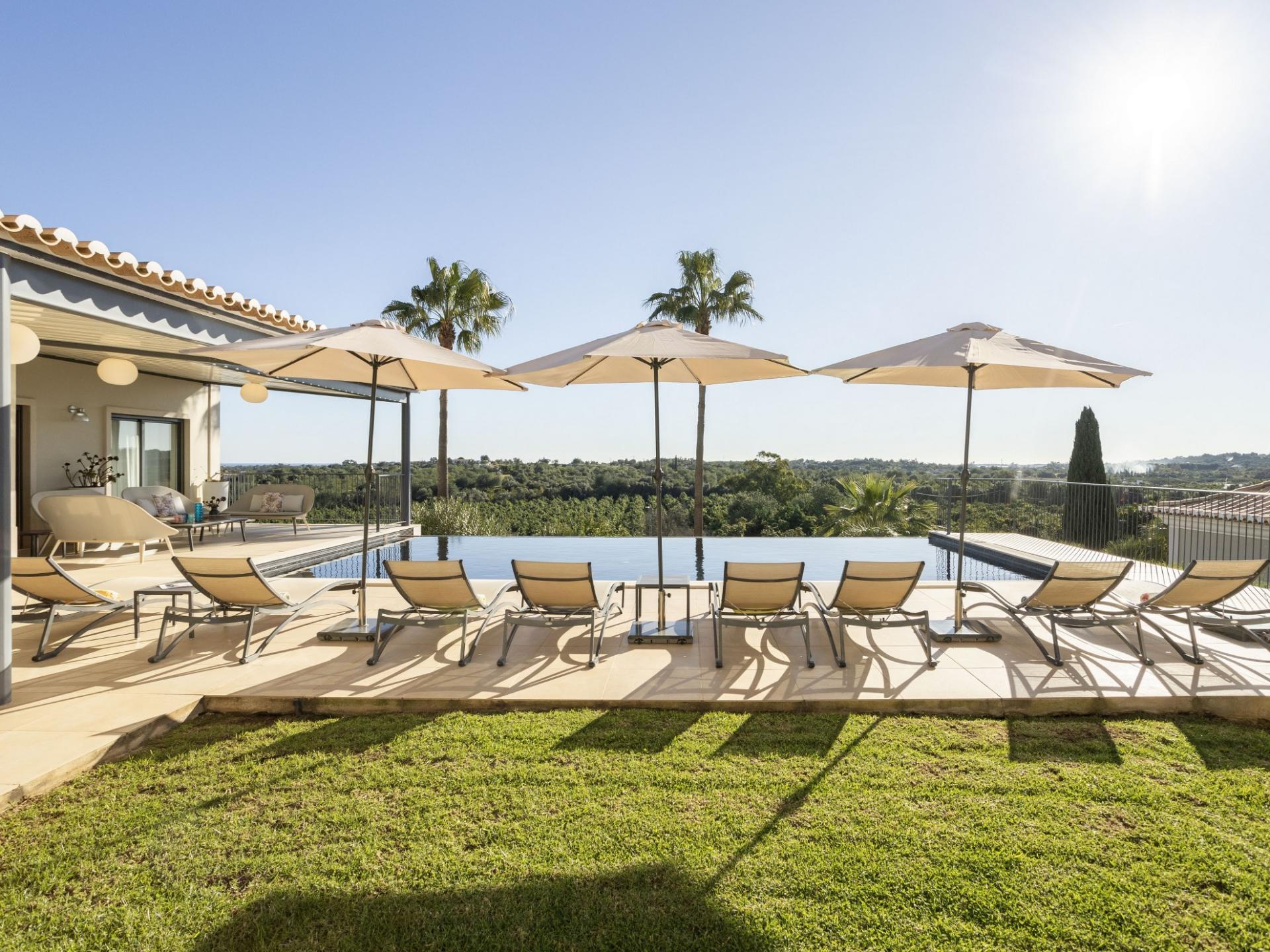 The beautifully landscaped outdoor spaces invite relaxation and entertaining. With expansive terraces, a saltwater pool, and lush gardens, the property also boasts a meticulously maintained orange grove, adding an authentic touch to this private oasis.