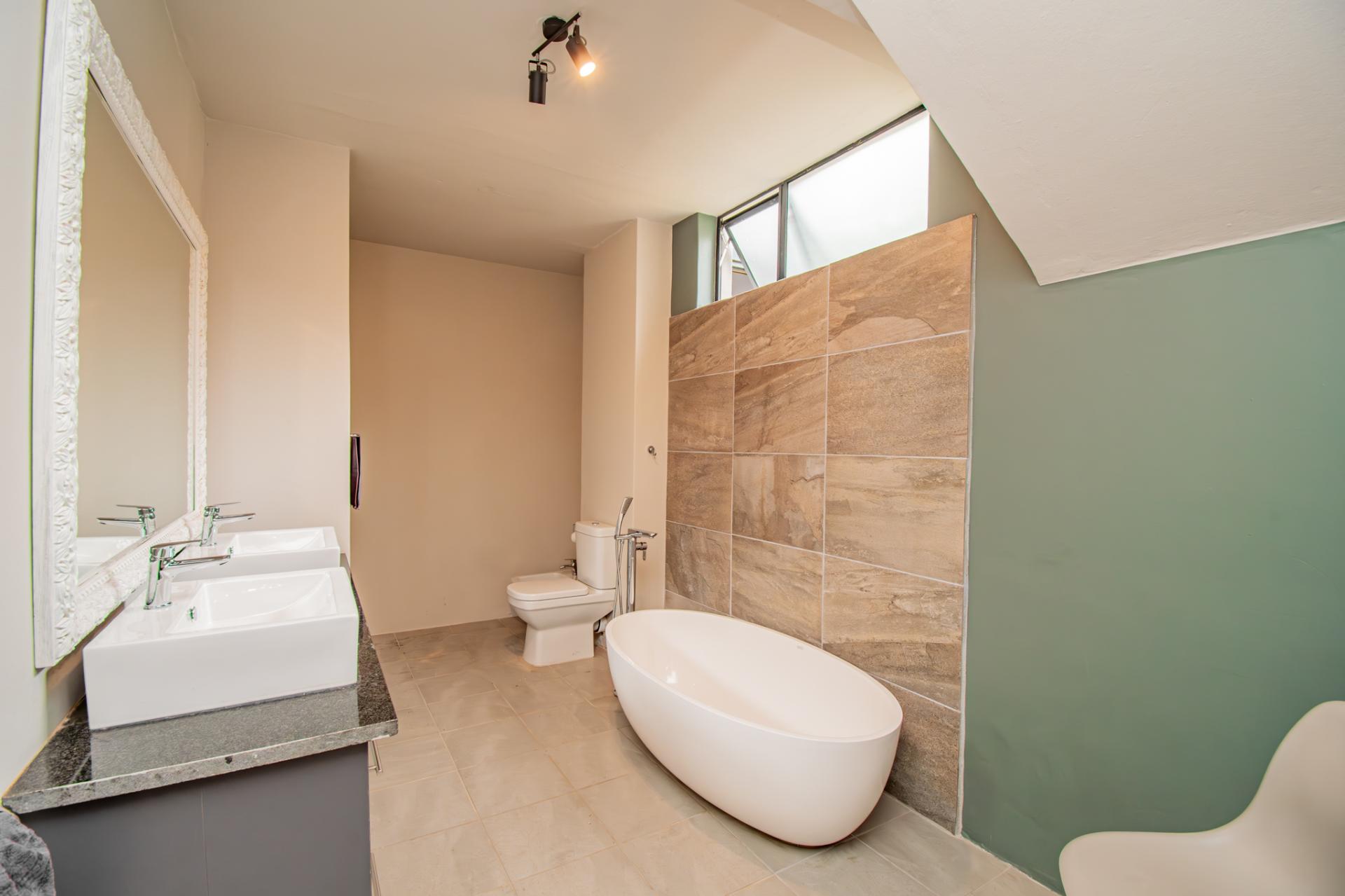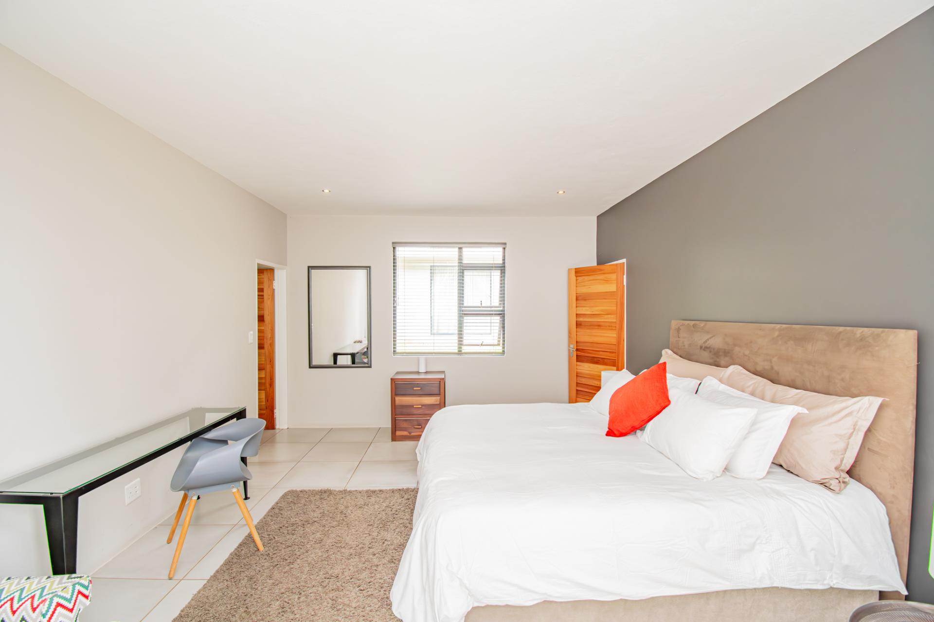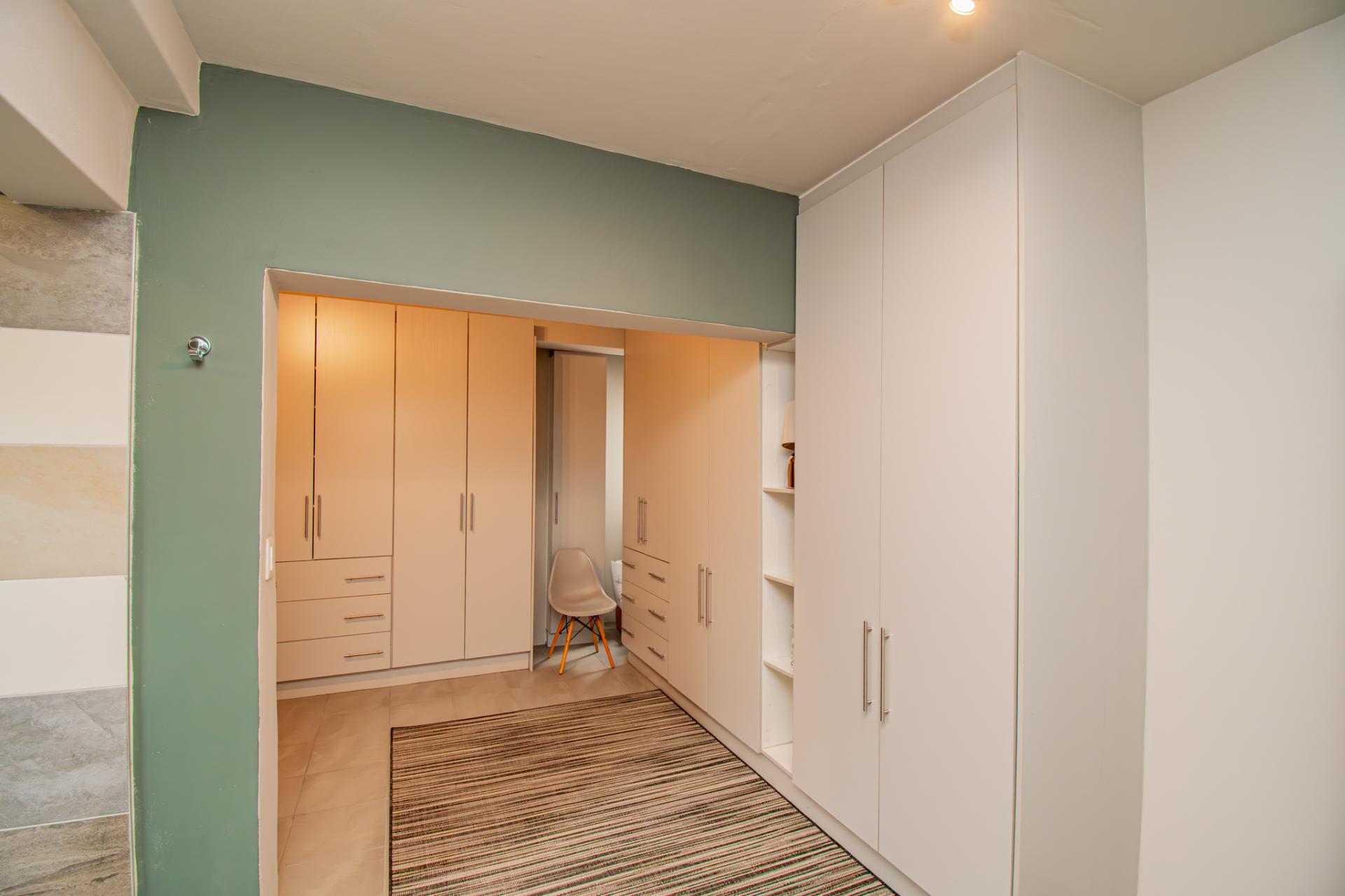 At the heart of the home lies a sleek double open plan living area with double sliding doors opening on to a balcony with green views. The designer kitchen—generously proportioned and impeccably appointed with ample cabinetry, a central island, and space for all your appliances, it is a culinary haven equally suited to gourmet entertaining and intimate family gatherings. A large adjacent scullery and laundry area makes everything convenient and practical.