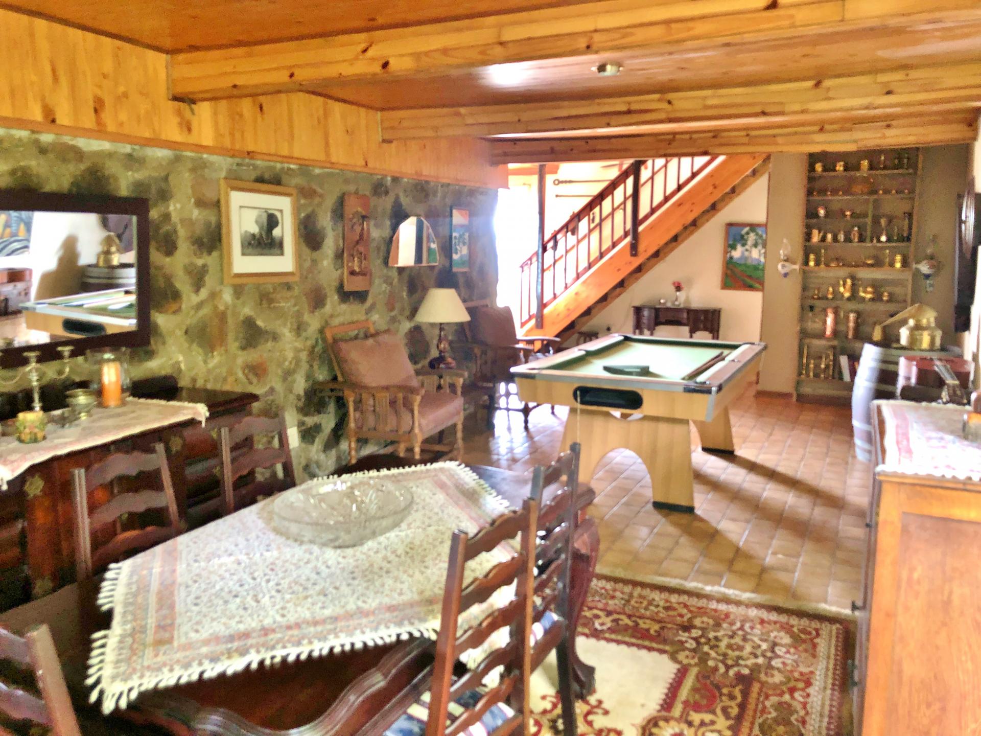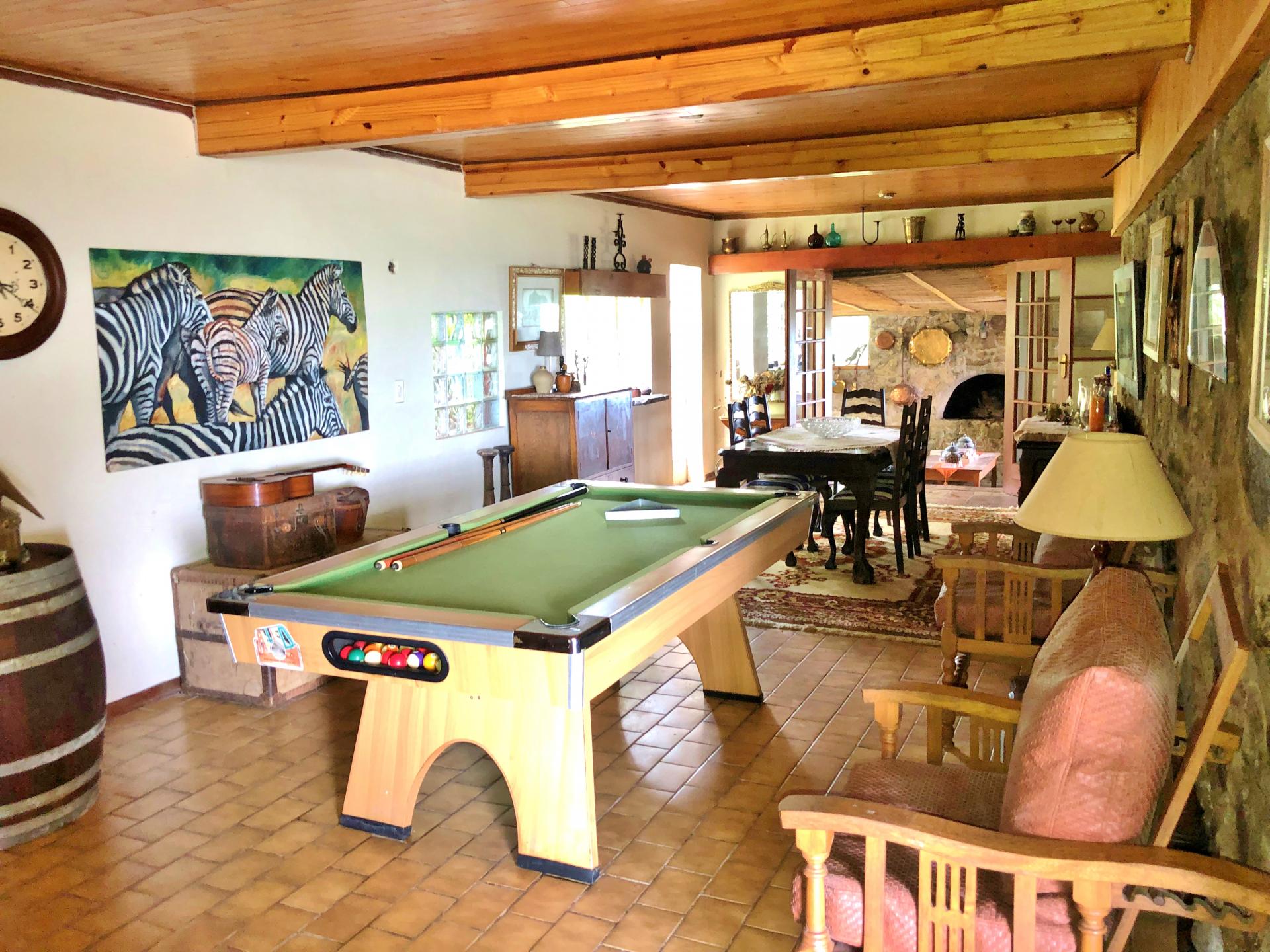 The spacious entertainment area comes with a pool table and flows into a cozy lounge with a fire place, an open plan dining room and a built in bar. The kitchen is equipped with a gas stove and a spacious pantry. Guests can relax and cool off in the pool.
