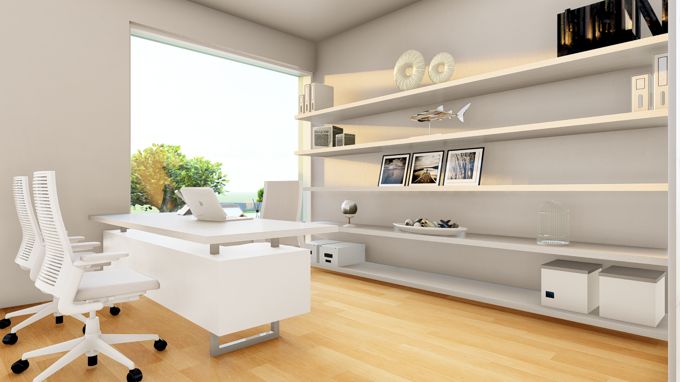 Ground floor: large living/dining room with double height, kitchen, laundry room and suite/office