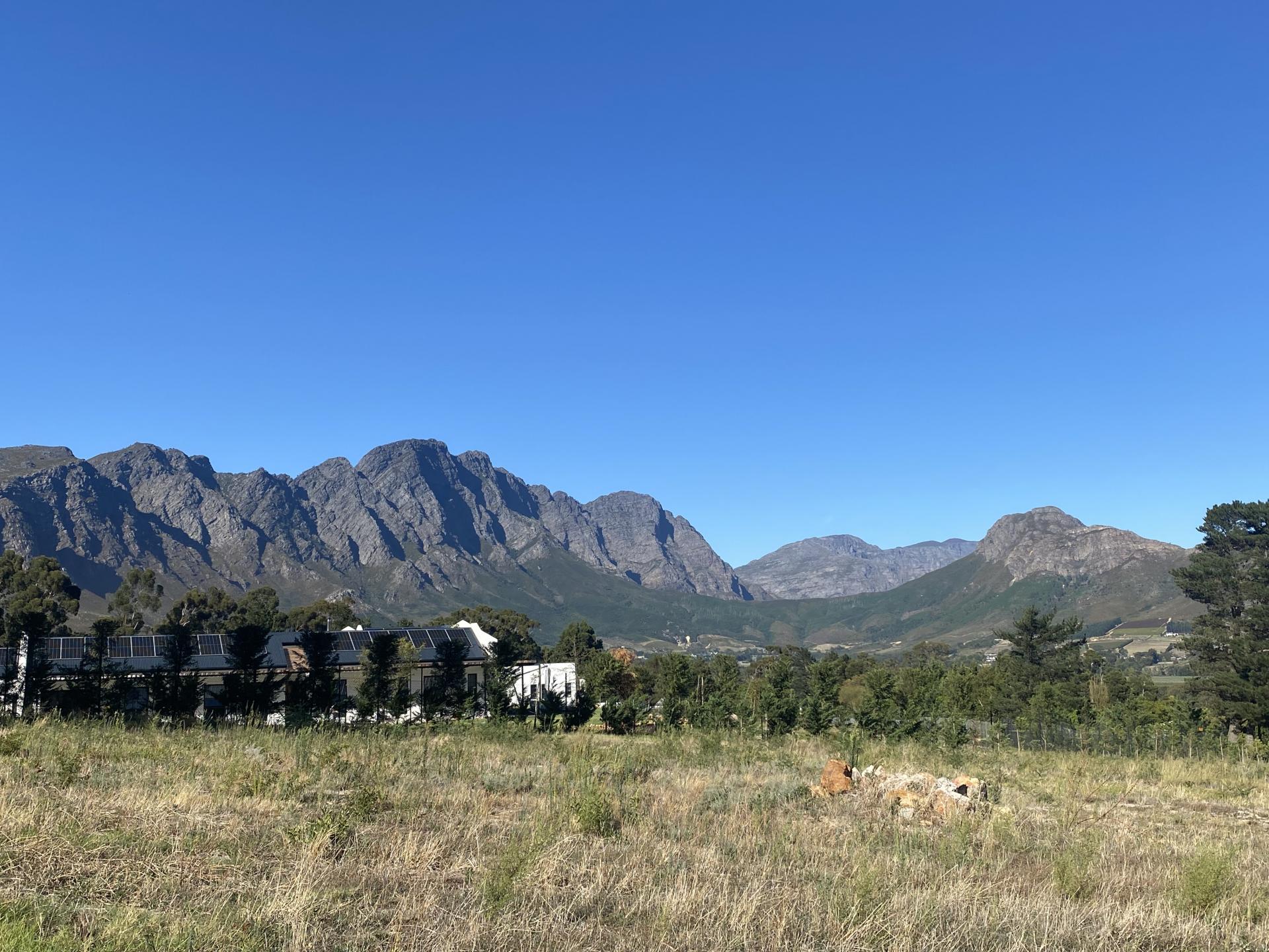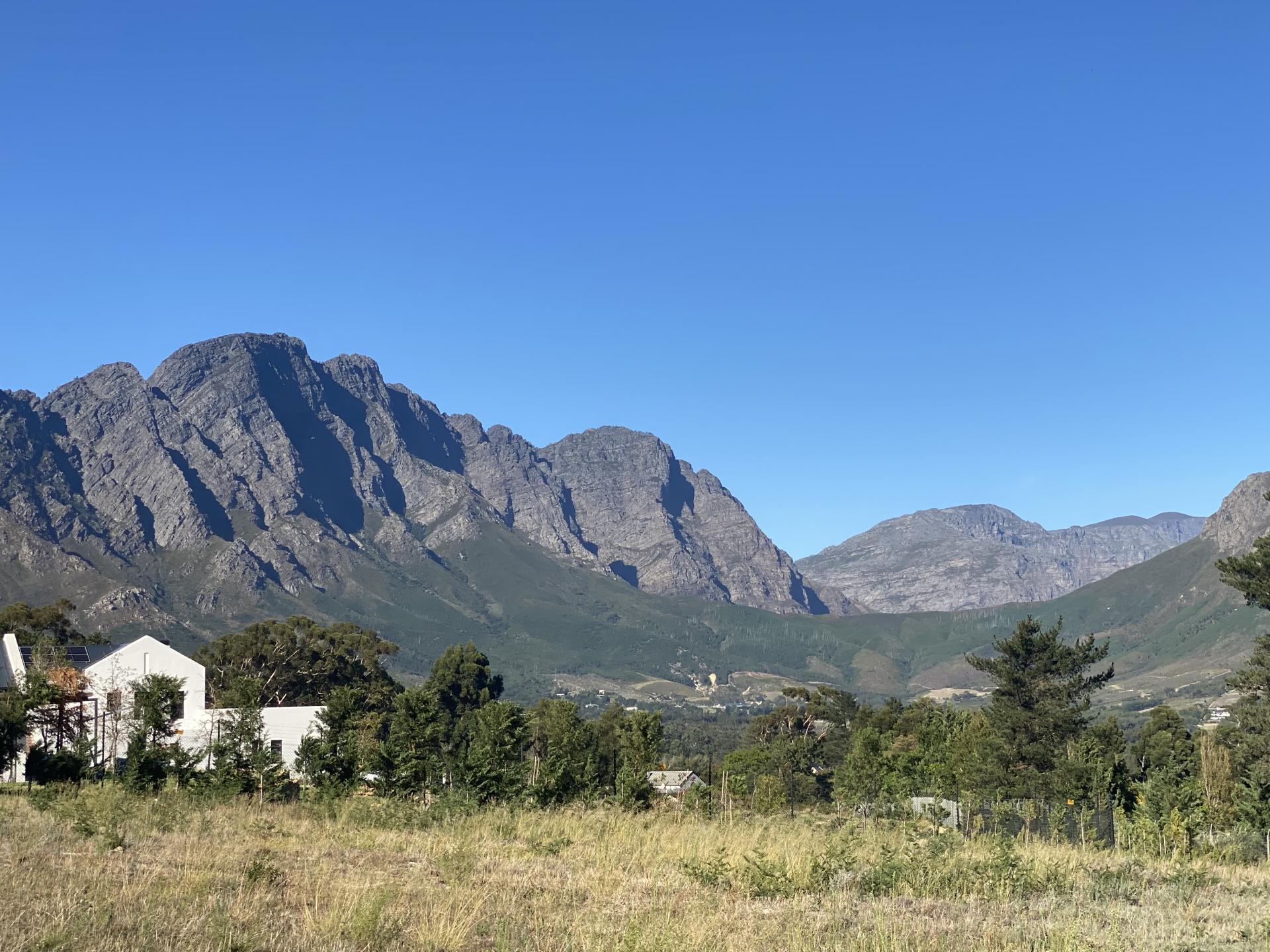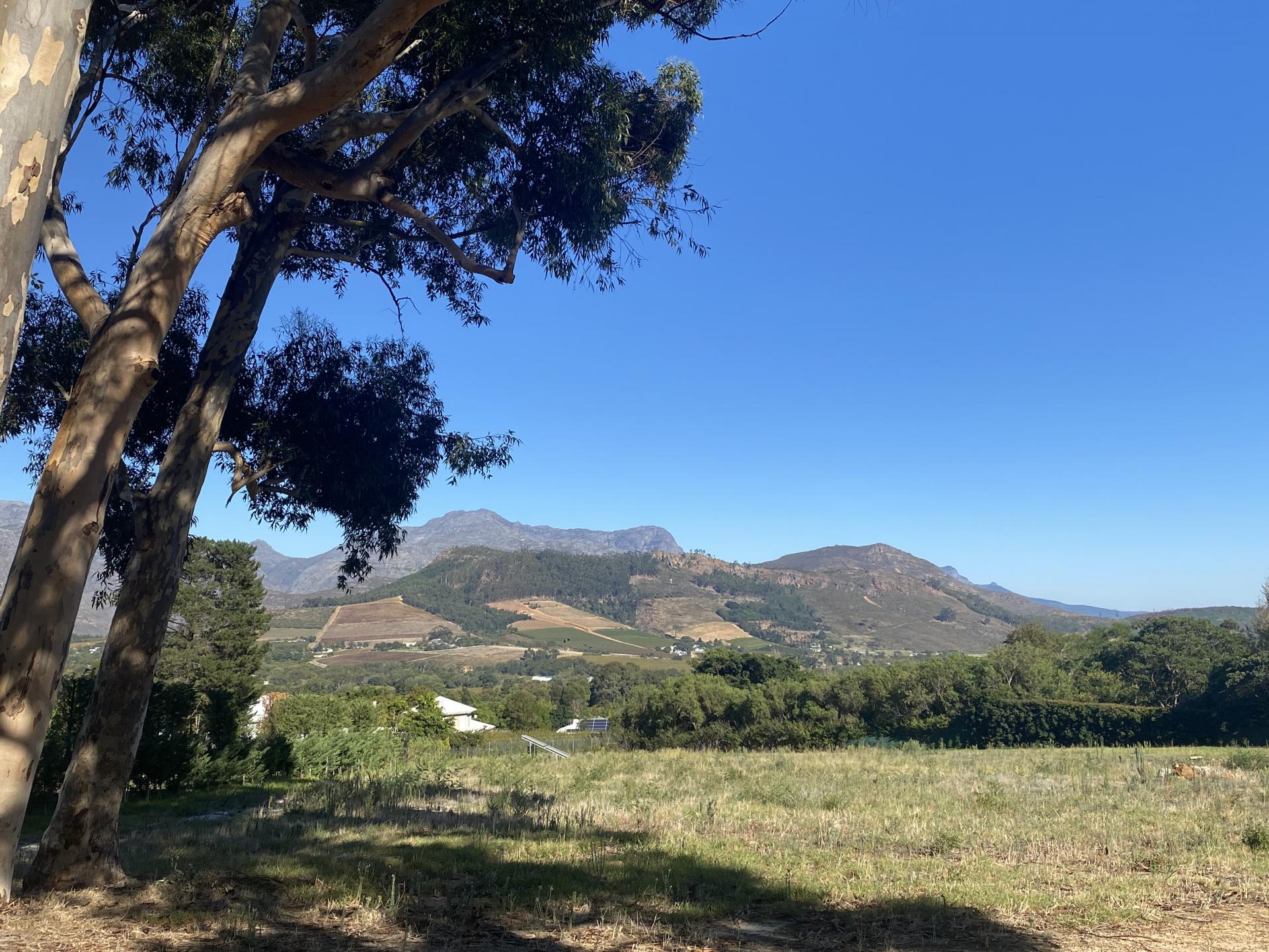 Views, views and Location. A unique opportunity to own a rarely available elevated one hectare plot with breathtaking views across the valley and gorgeous mountains as a backdrop. Nestled on the lower slopes of the Franschhoek Mountains with smallholdings and wine farms as neighbours this beautiful portion of land offers a rural secluded but secure lifestyle within easy walking distance to Franschhoek village. The ideal canvas on which to build one or two dwellings. Includes fully fenced boundary and borehole.