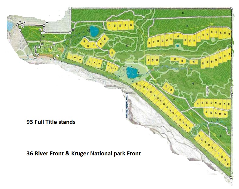 Free titles (in extent of up to 2500 square meters, to a little less than half a hectare) are available from as low as R 2,8 million to R 5,5 million. This option features either natural, private bush environment with wildlife and small game left to roam a short distance from the riverfront, or Kruger Park and riverfront.