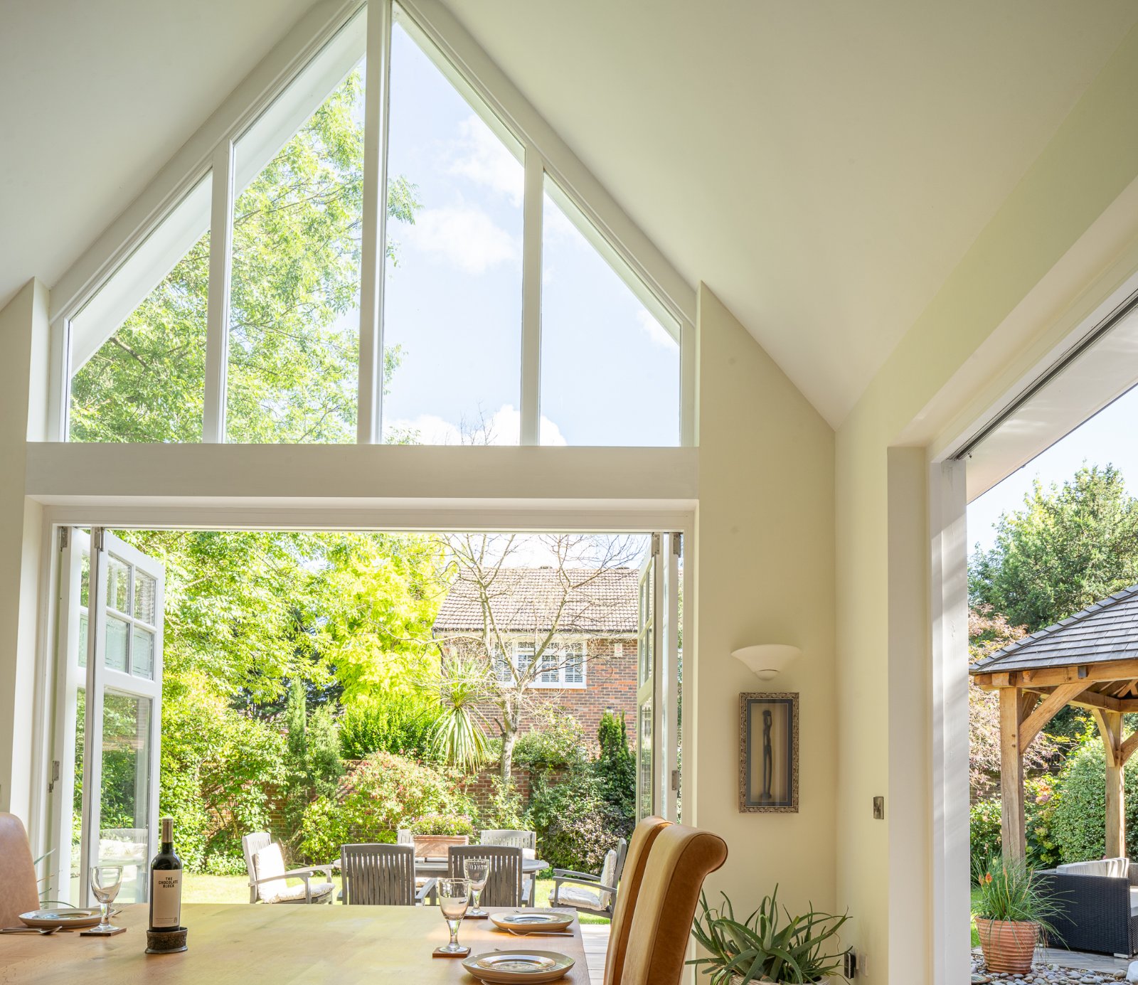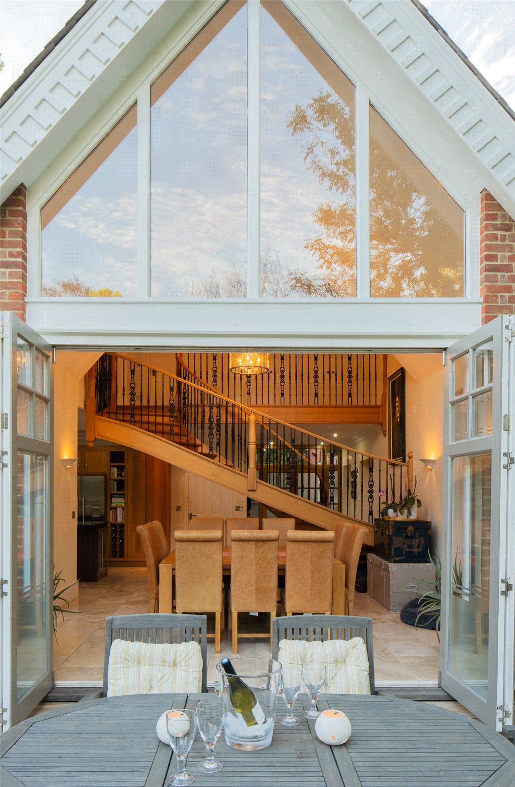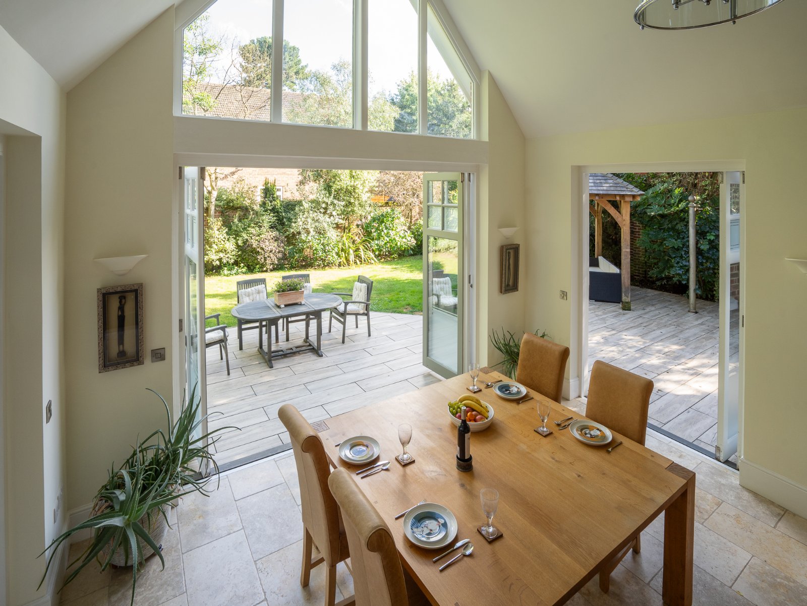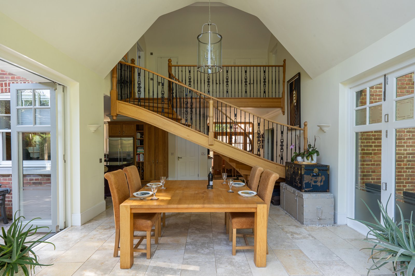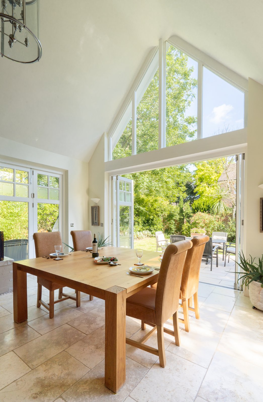 Dining: Stunning double height ceiling and triple aspect floor to ceiling glass doors opening onto the rear garden. Natural limestone tiled flooring with underfloor heating.