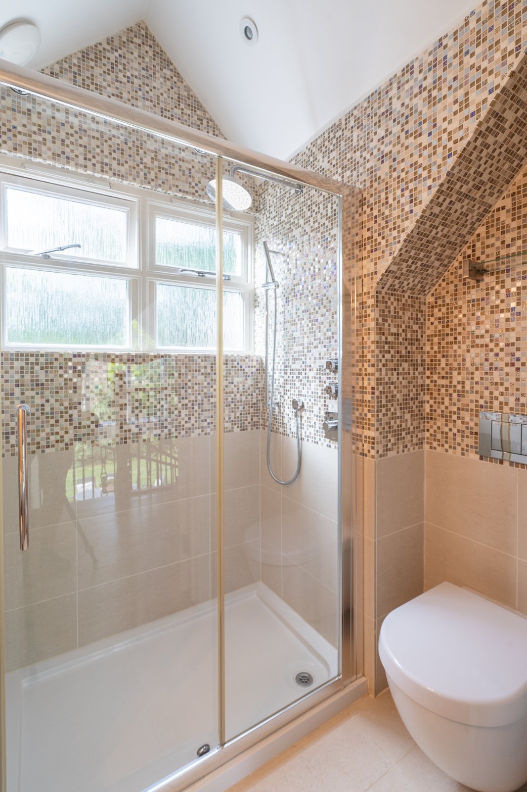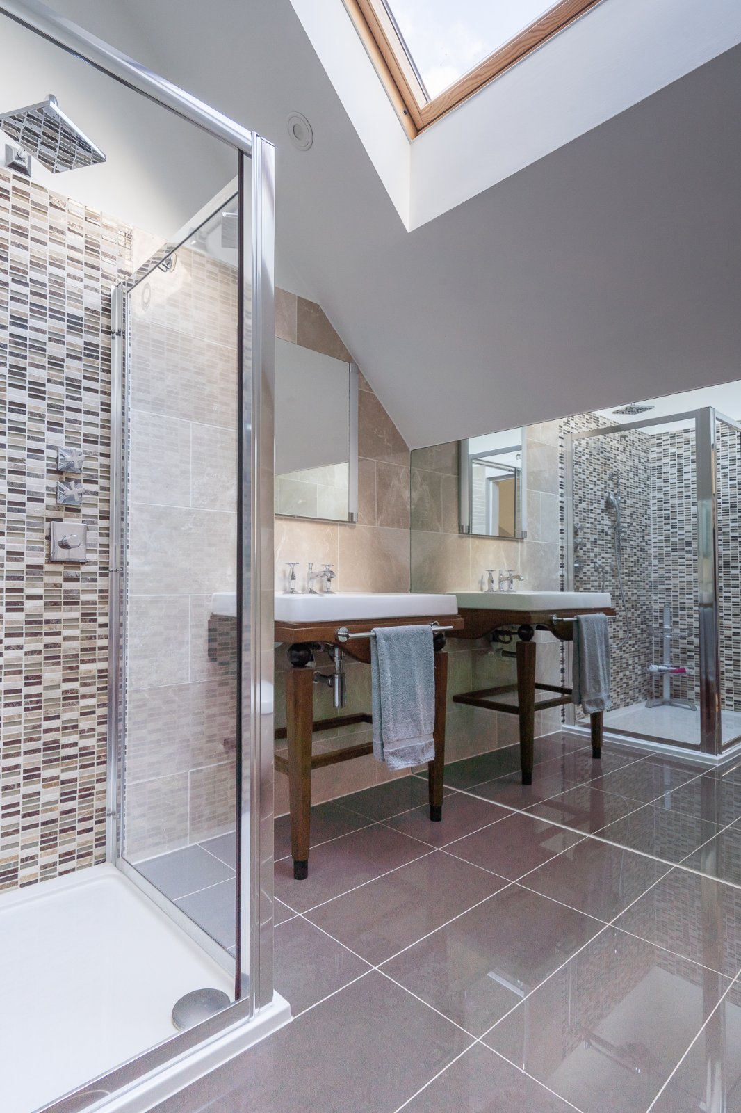 Ensuite: Skylight over Italian suite of large shower, hand built unit with wash hand basin. Low level WC. Heated towel rail. Travertine stone tiled floor. Marble tiled & mirrored walls. Recessed lights.