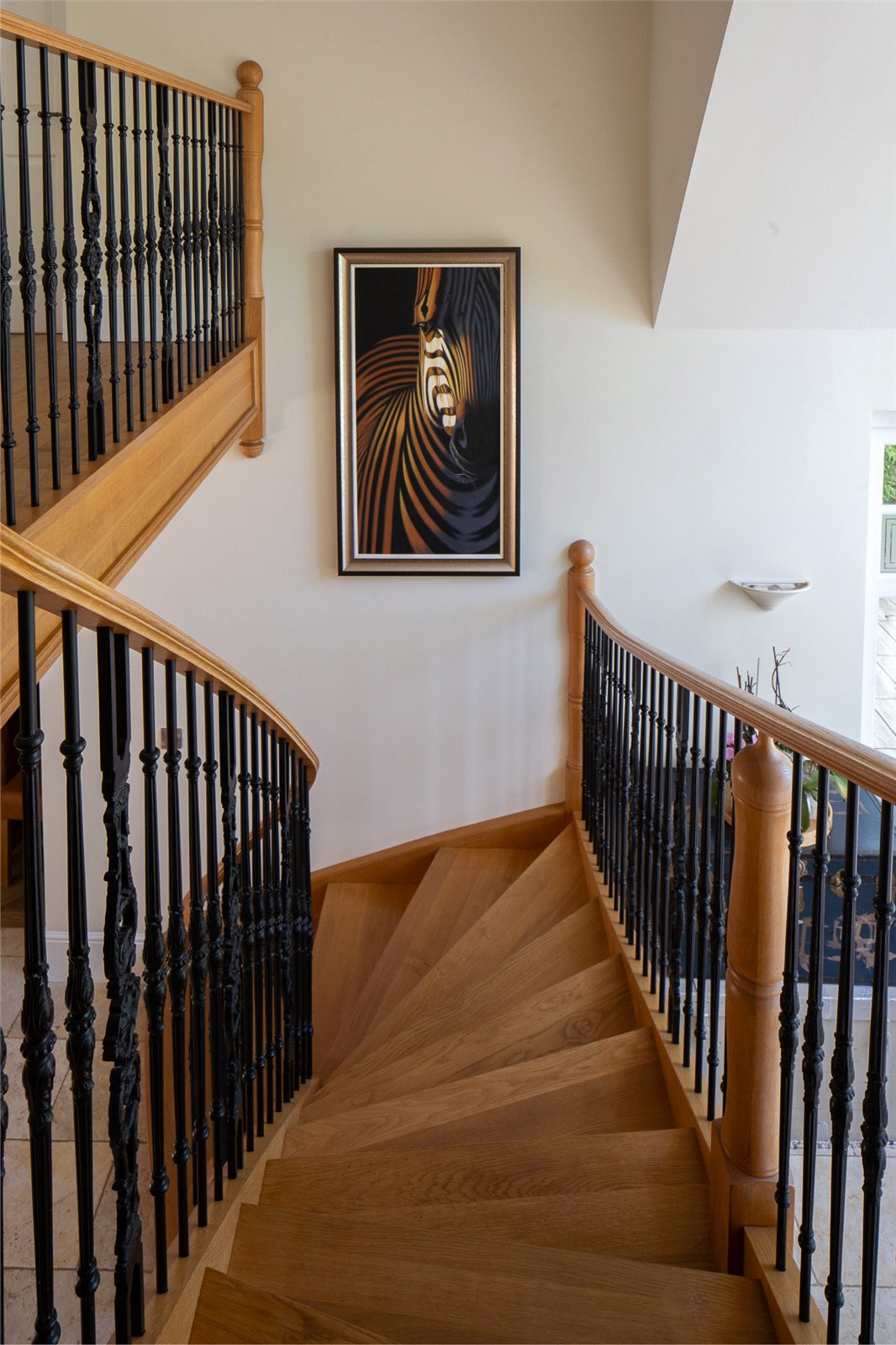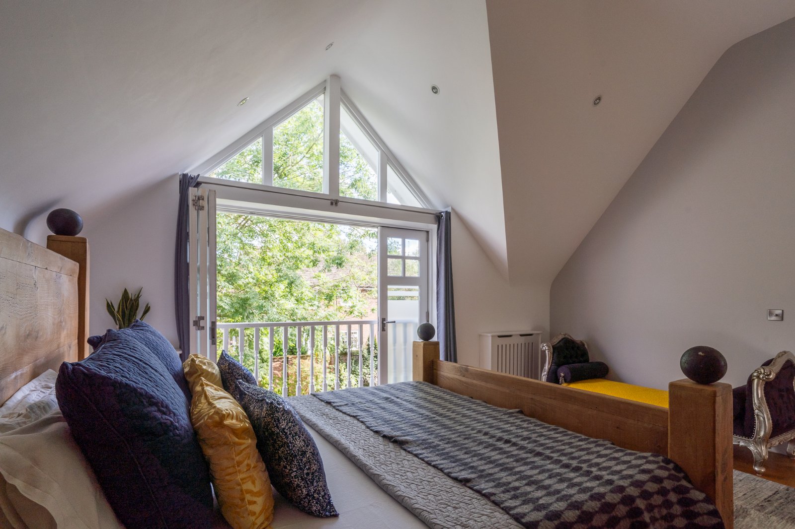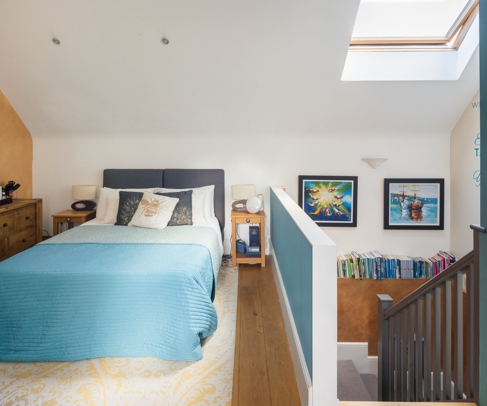 Generous, light and airy landing overlooking double height dining area. Full wall of bespoke fitted storage cupboards. Solid oak floor.