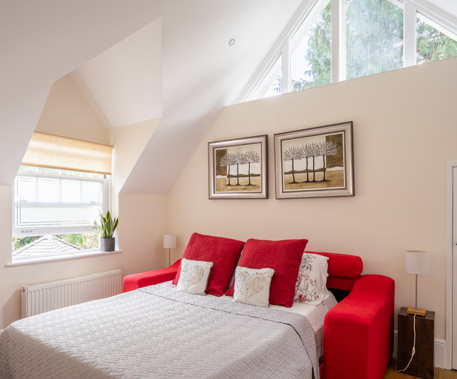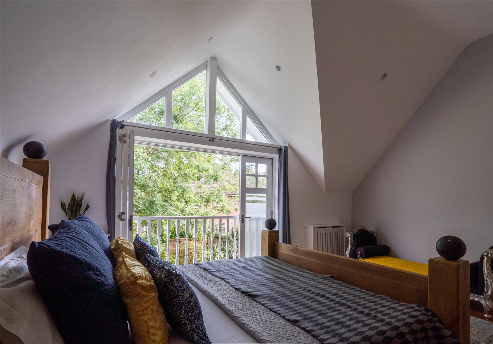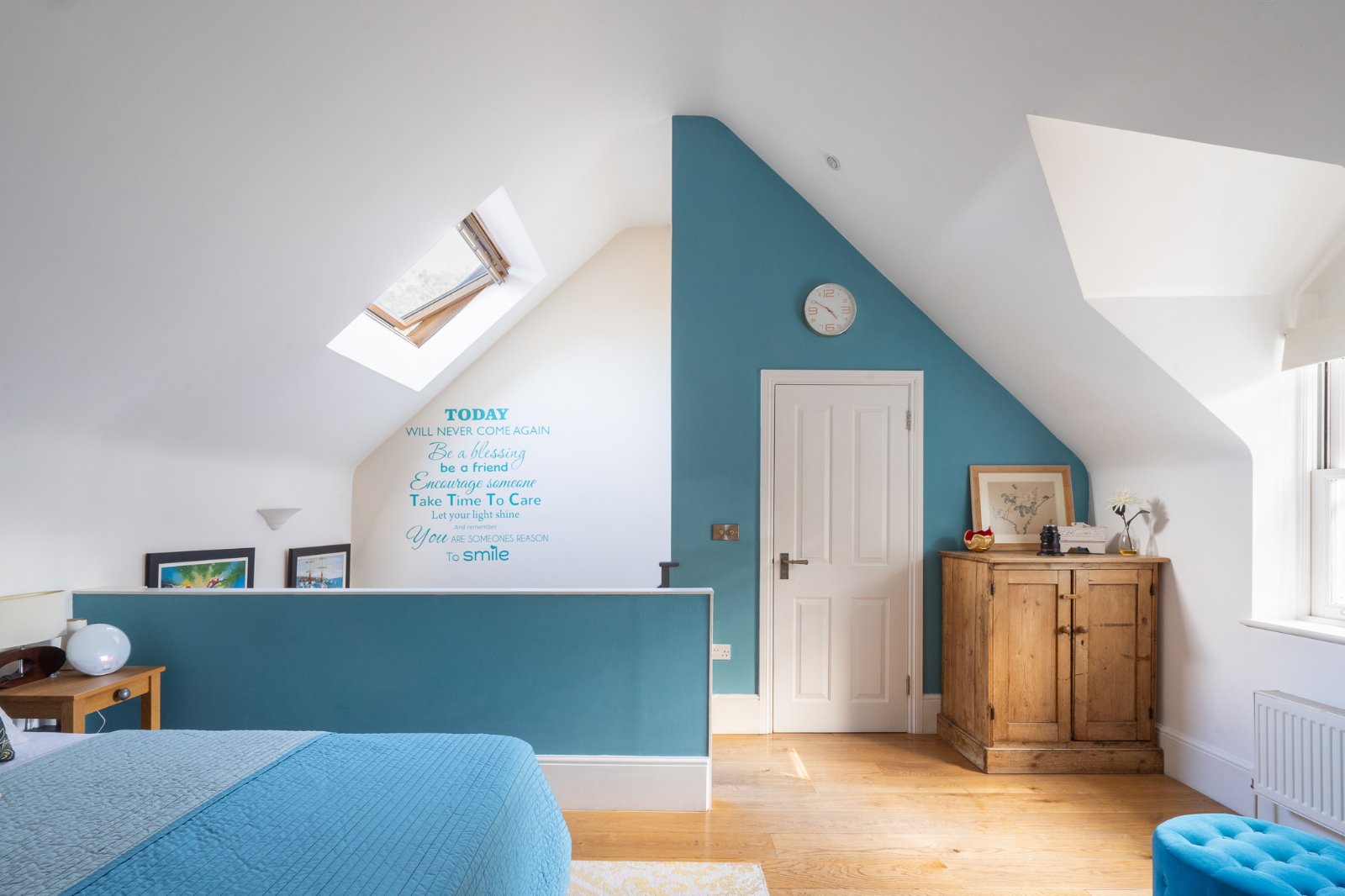 Bedroom: Double aspect. Full wall of bespoke fitted cupboards including concealed laundry chute to utility room. Eaves storage cupboard. Solid oak floor.