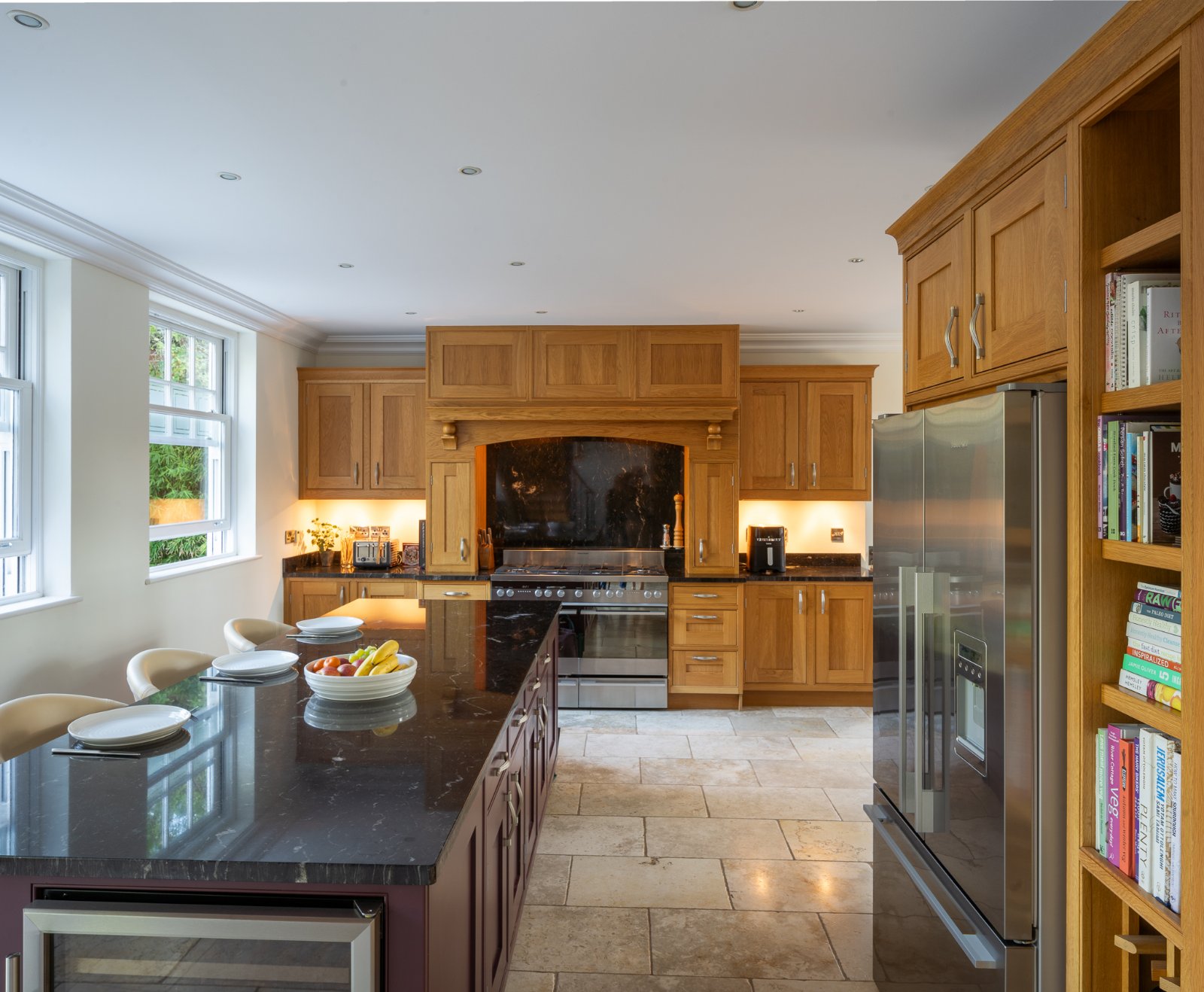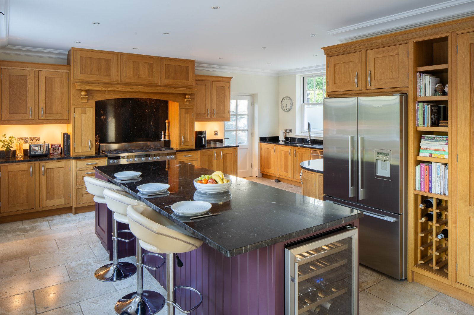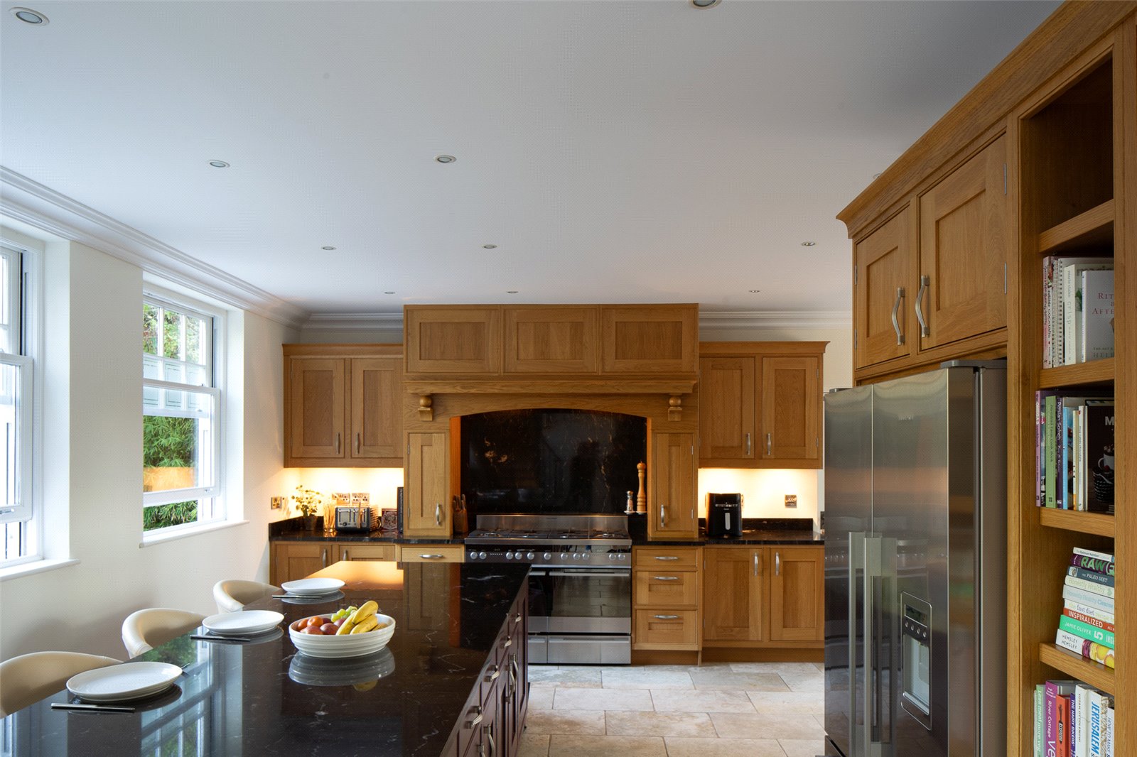 Flooded with natural light from windows on all sides. Fully fitted with hand made, bespoke solid oak base and wall cabinets with granite worktops. Double width range cooker including 6 x hob and 2 ovens. Double bowl sink unit with Qooker tap for instant hot water. Integrated appliances including double door fridge/freezer with drawers and dishwasher. Natural limestone floor tiles with underfloor heating. Spacious kitchen island with seating on one side and integrated wine fridge.