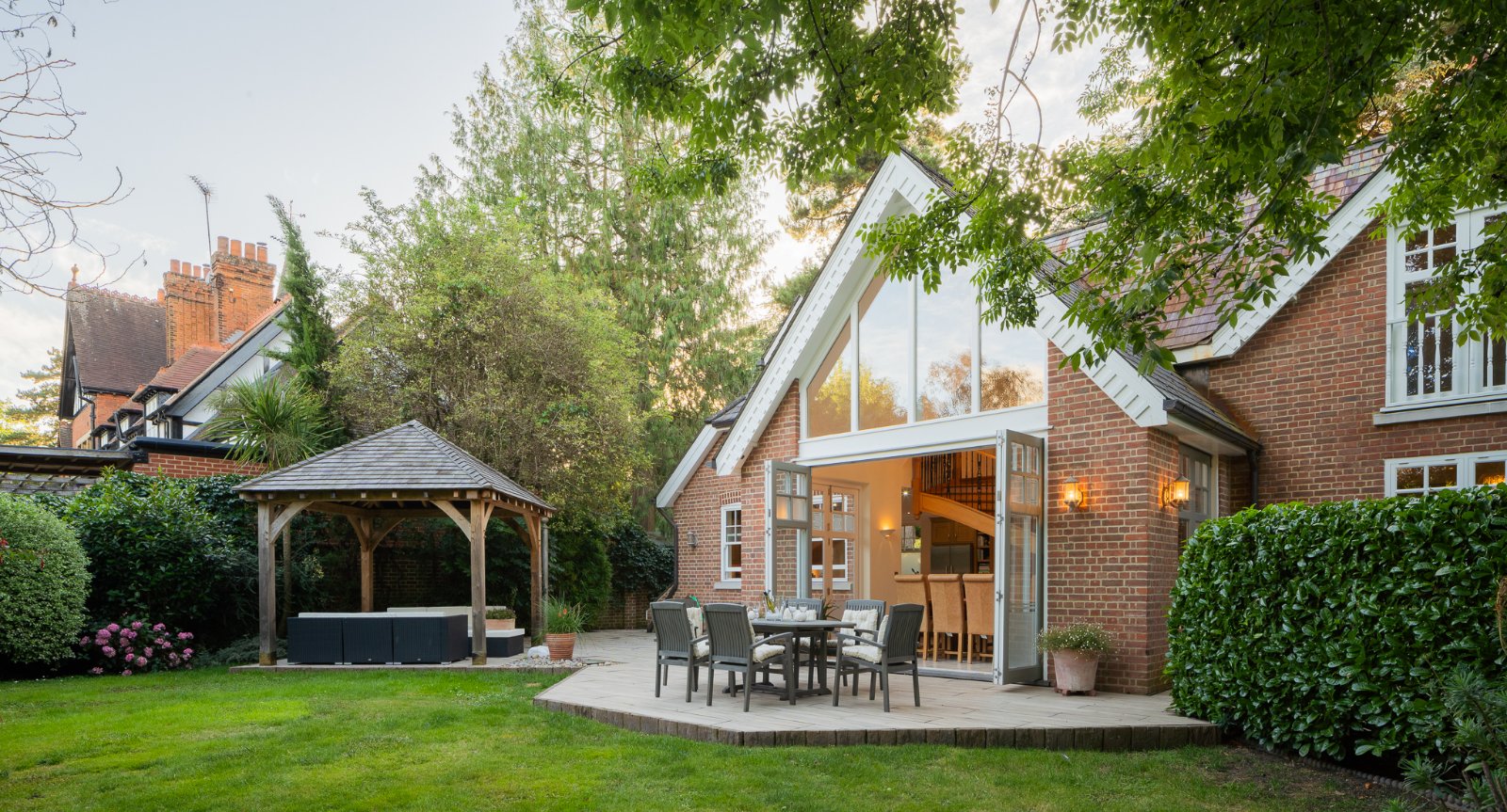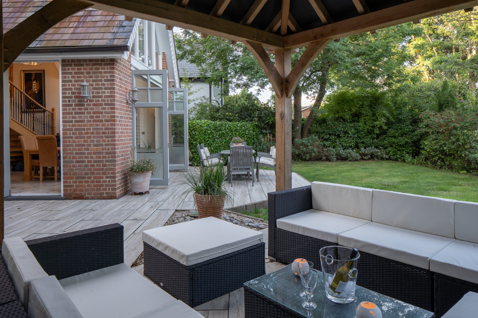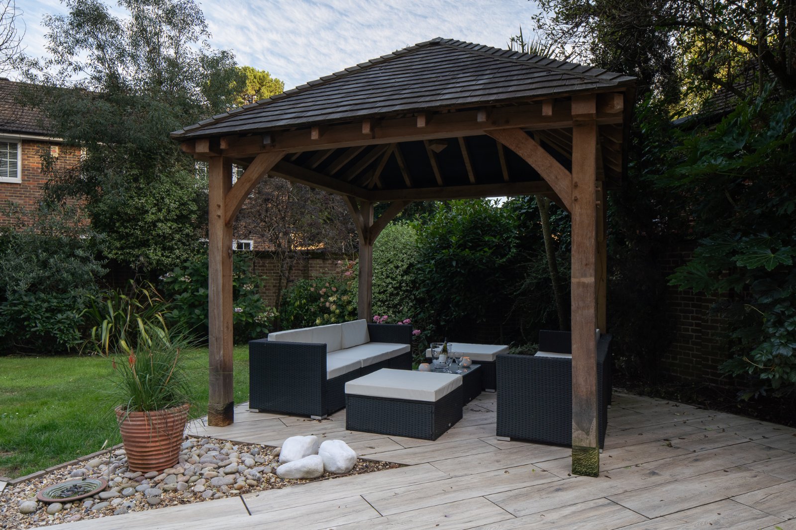 Garden: Large patio dining area. Hand built solid oak gazebo seating area with cedar tiles. Original stable fitting repurposed as a screen. Laid to lawn and mixed beds of shrubs and flowers.