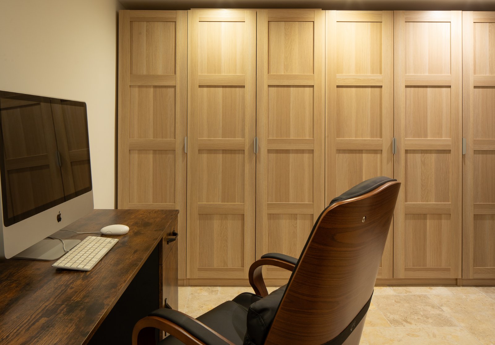 Study: Limestone floor tiles. Large storage cupboard. Recessed lighting. Power points for IT equipment etc.