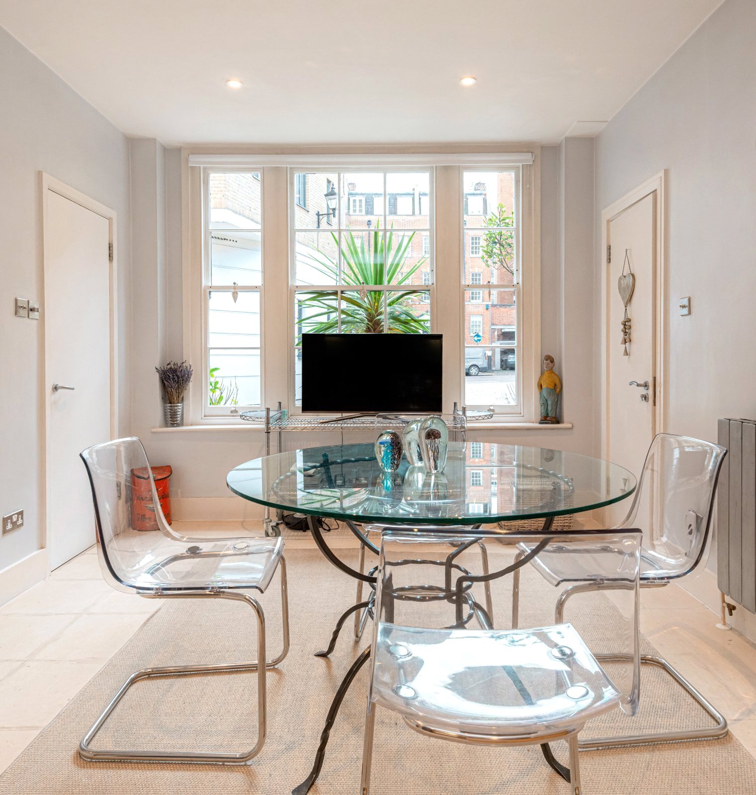 The ground floor presents a cleverly designed open plan kitchen with dining area. There is also a spacious garage which is quite unusual for a mews house.