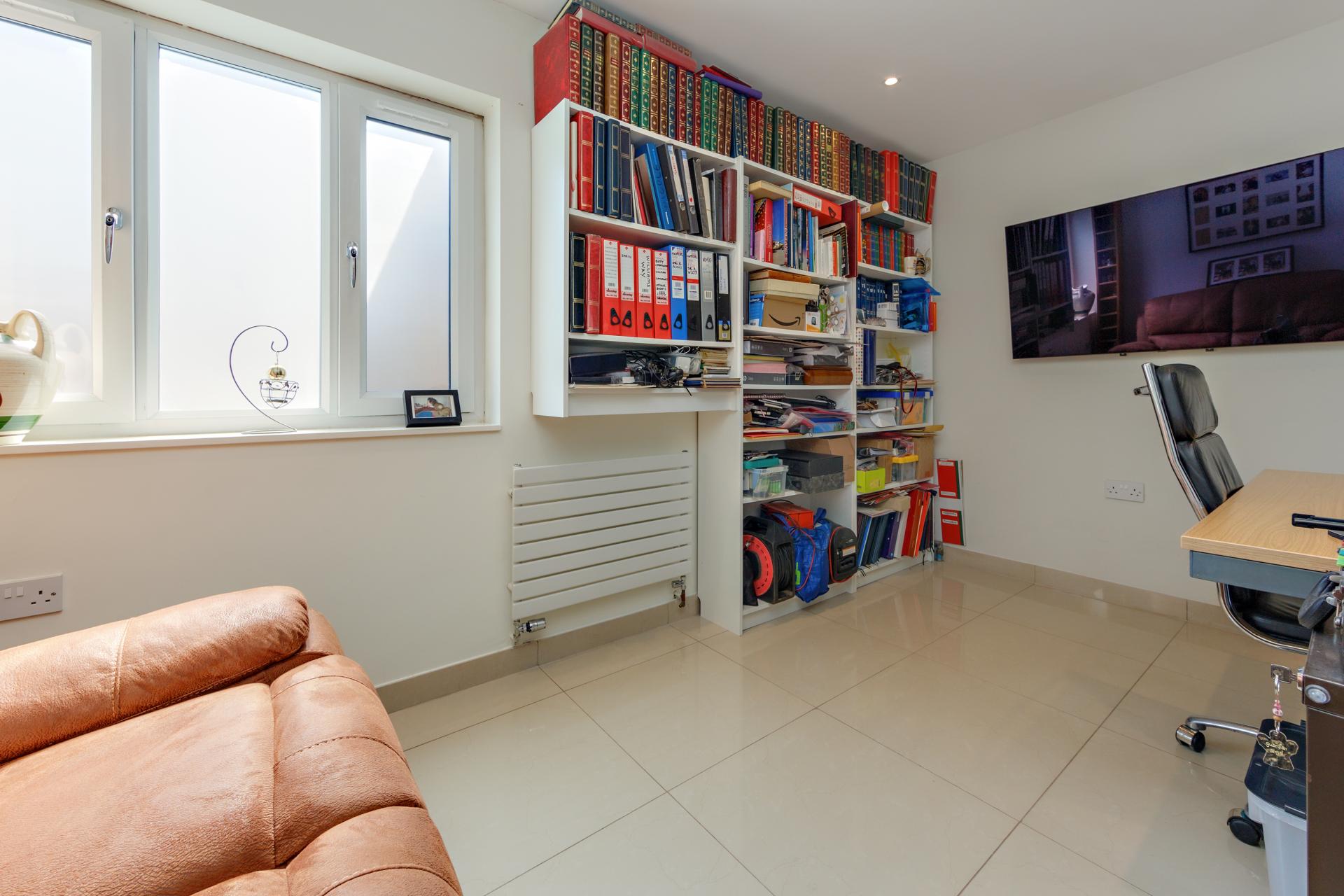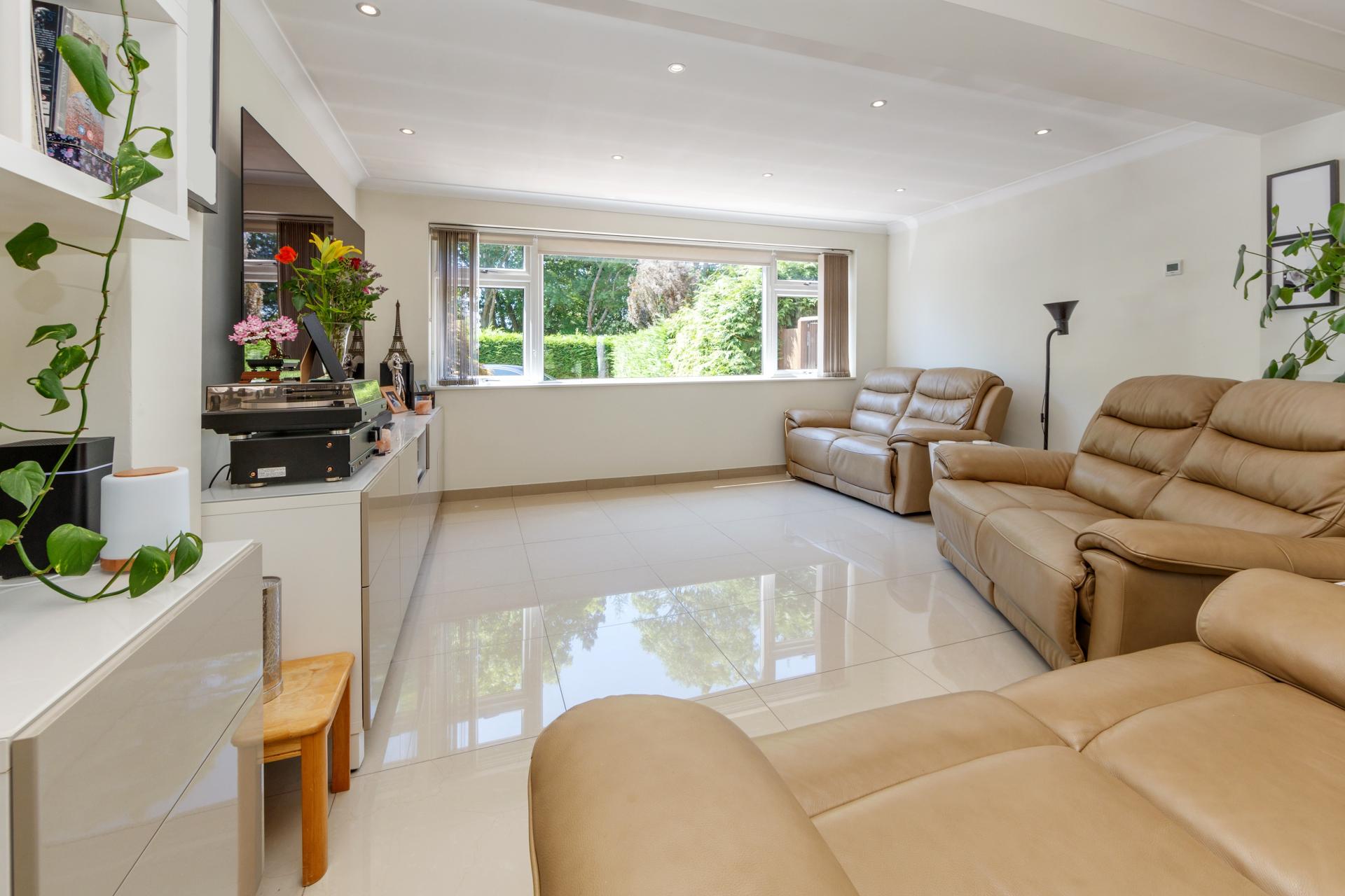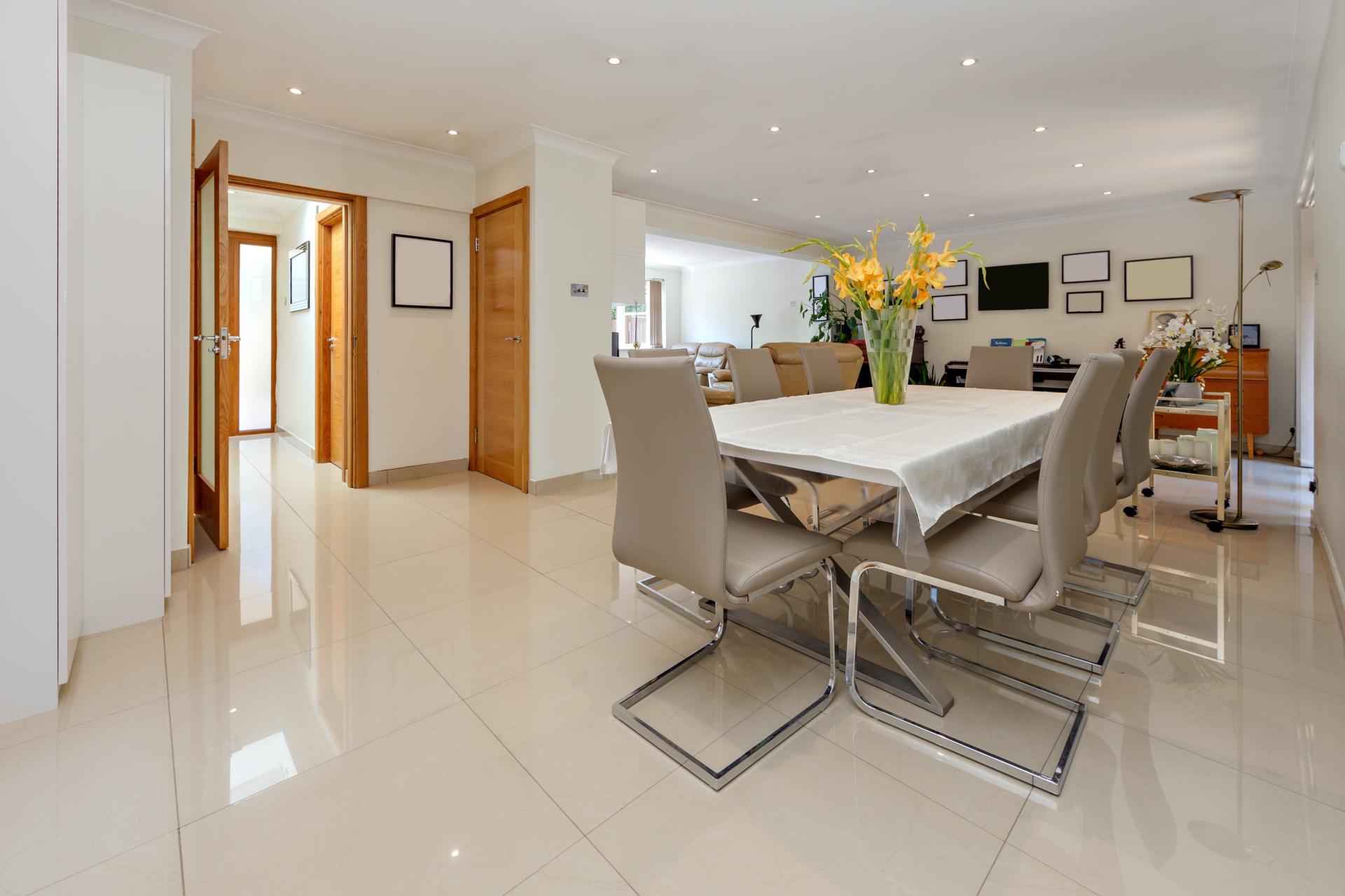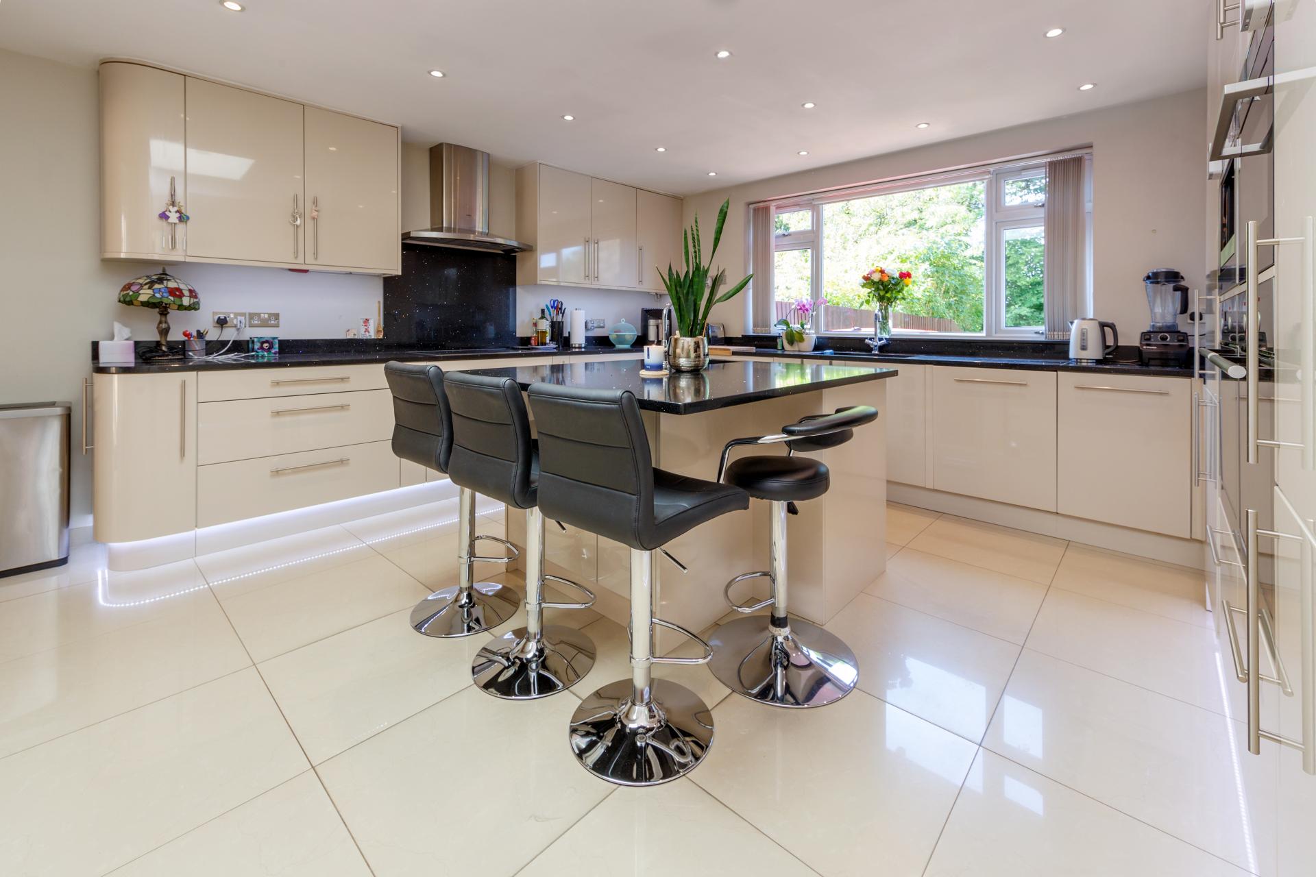 The residence features a welcoming entrance hallway that includes a guest WC/shower room, leading to a fully equipped kitchen/breakfast room complete with a substantial central island and a separate utility room that provides access to the rear garden. The centrepiece of the home is the expansive 25' x 25' living/dining room, which opens directly onto the picturesque rear garden. Additionally, a further reception room or fifth bedroom (which is currently used as a home office/study) can be accessed from the living room. A separate hallway leads to four additional bedrooms and the family bathroom.