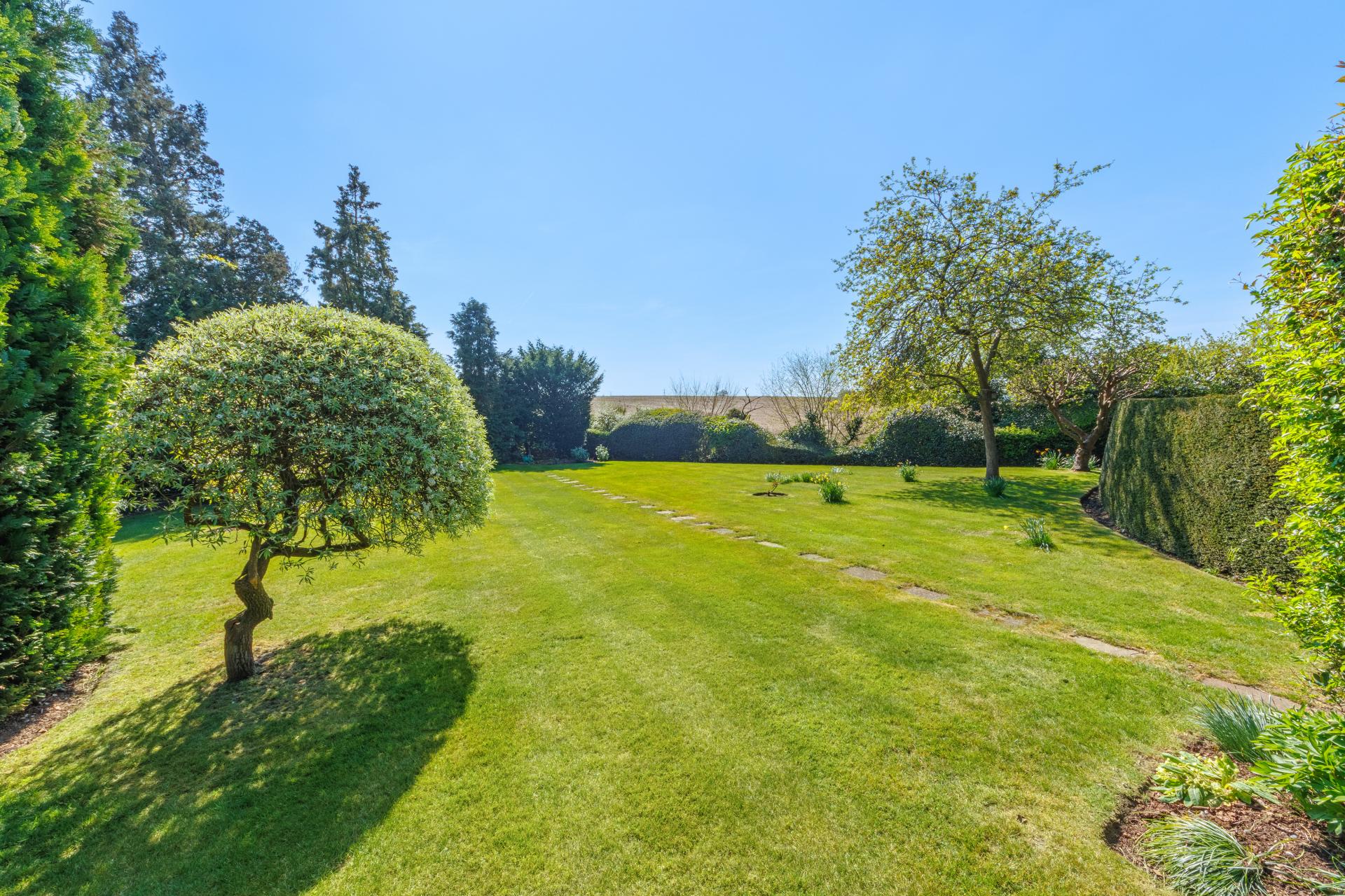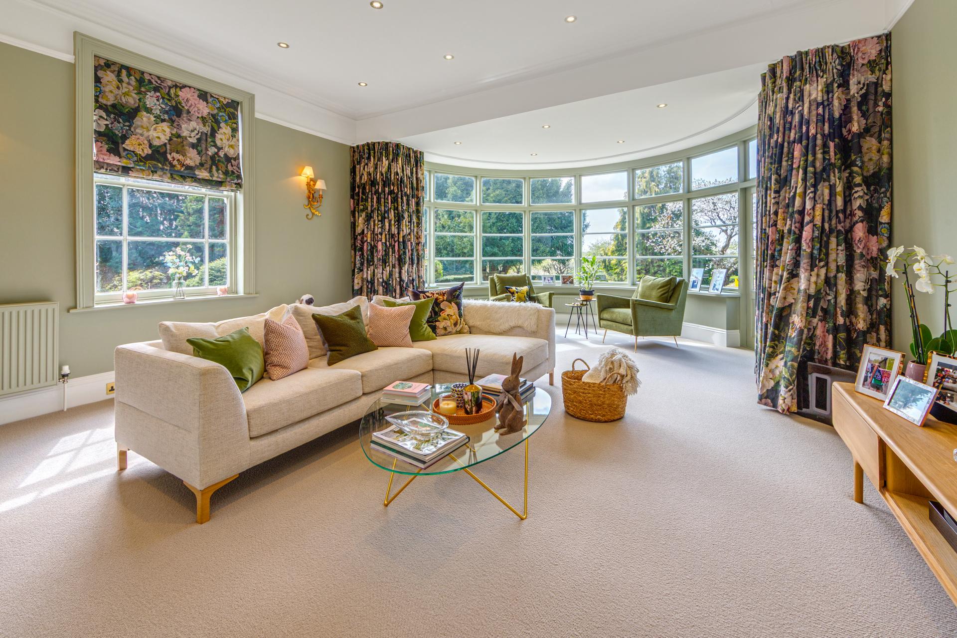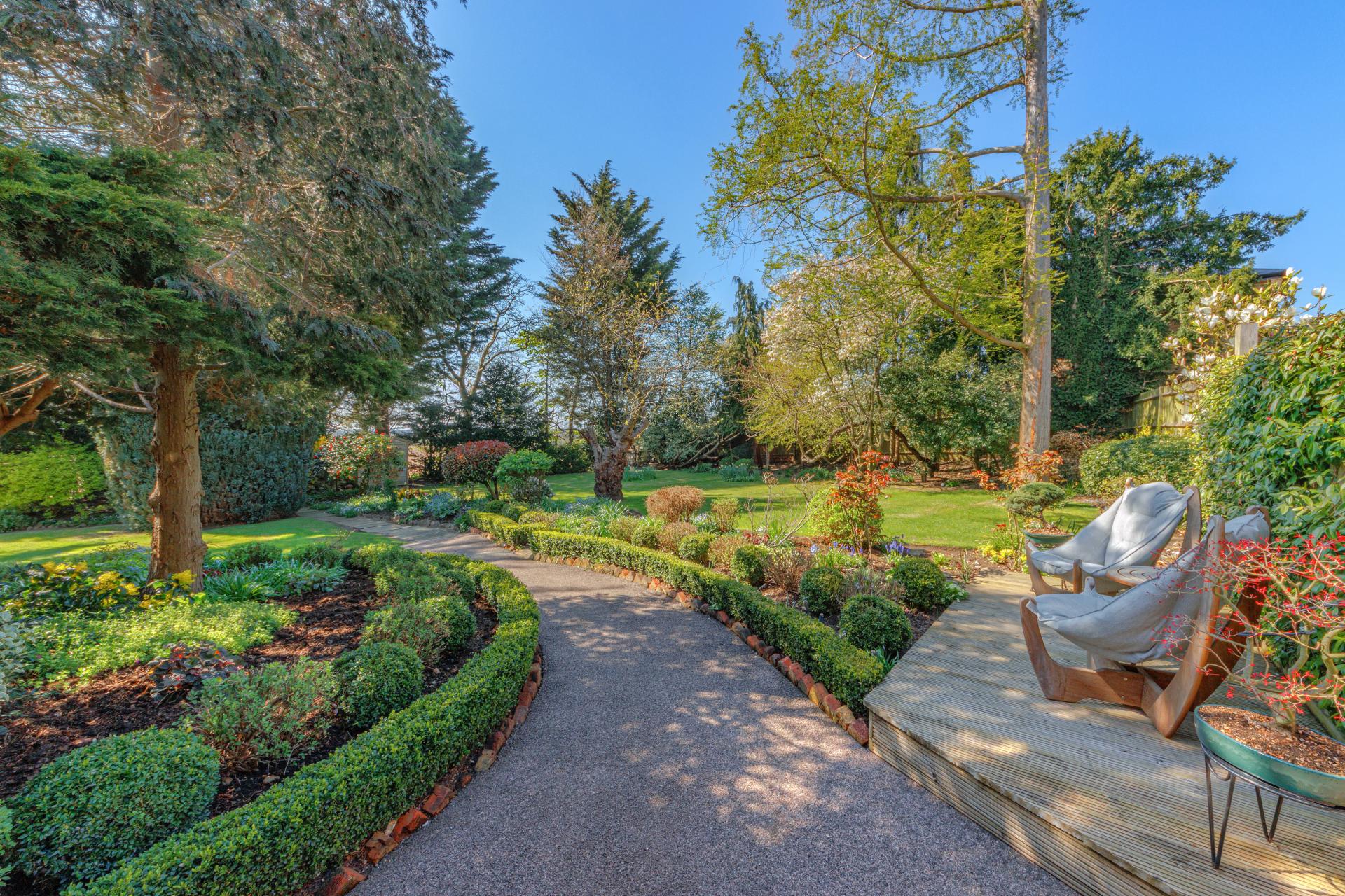 One of the standout features of Roundbush is its stunning, landscaped gardens. A series of vibrant planting beds, lush lawns, and mature trees provide a serene and private haven, perfect for outdoor entertaining or simply relaxing and enjoying the tranquillity. A charming garden studio and a detached garage further enhance the functionality of the home, offering versatile additional spaces.
