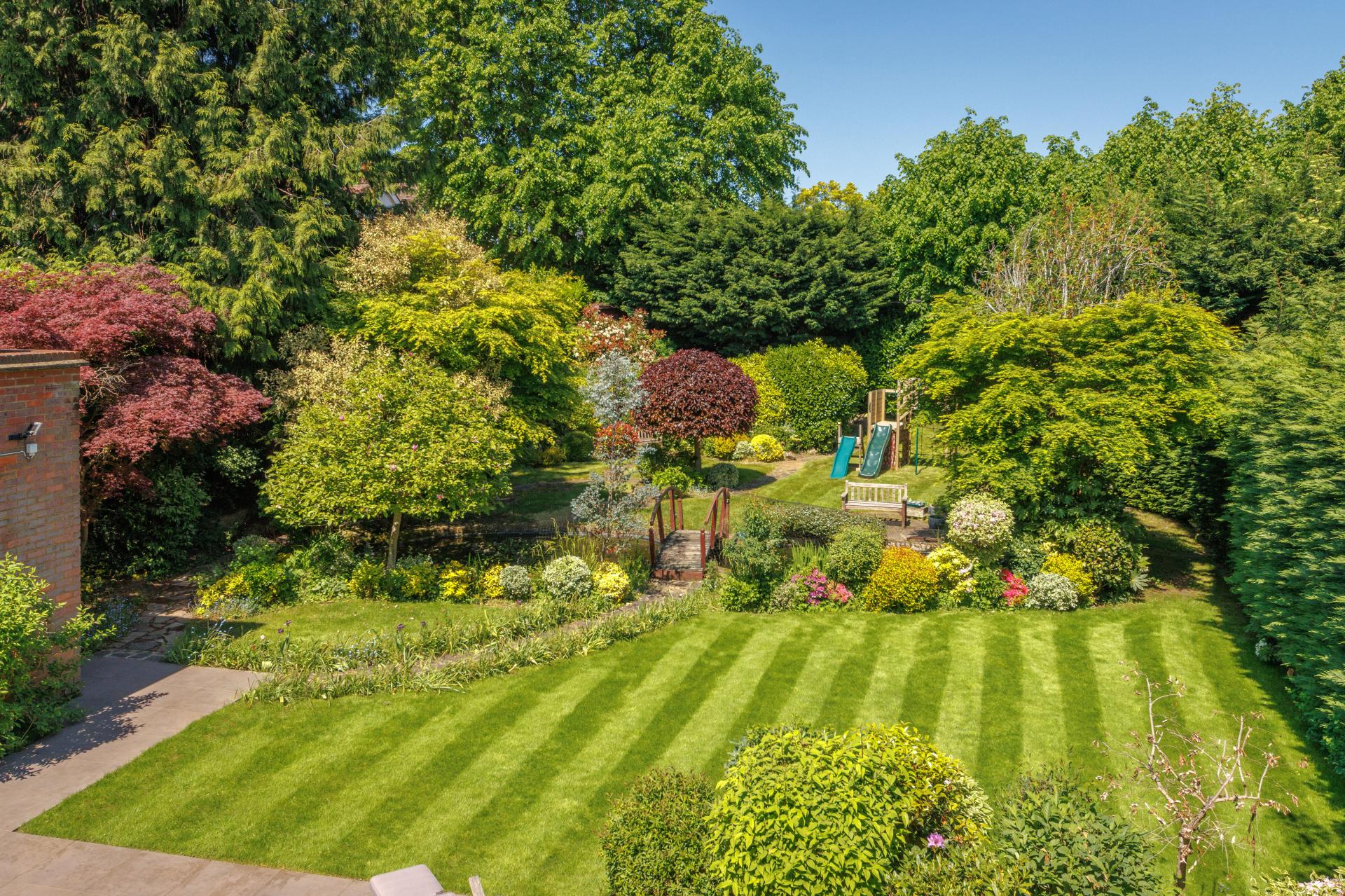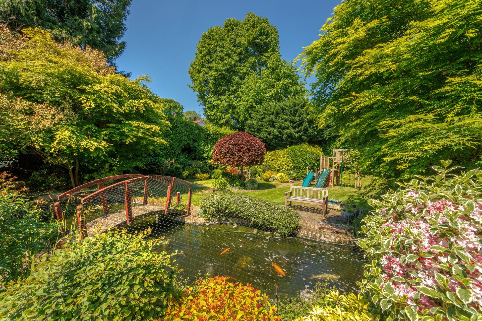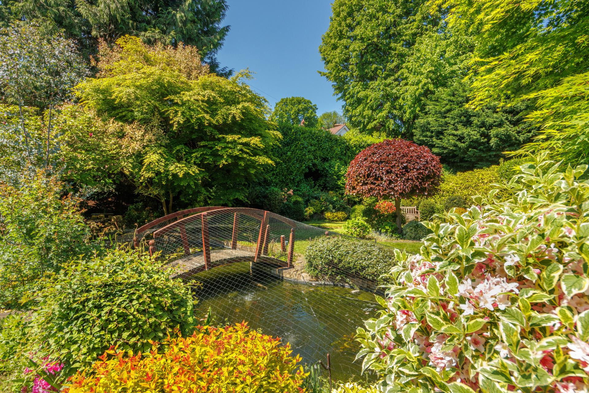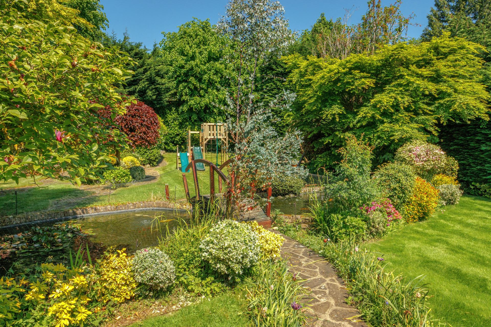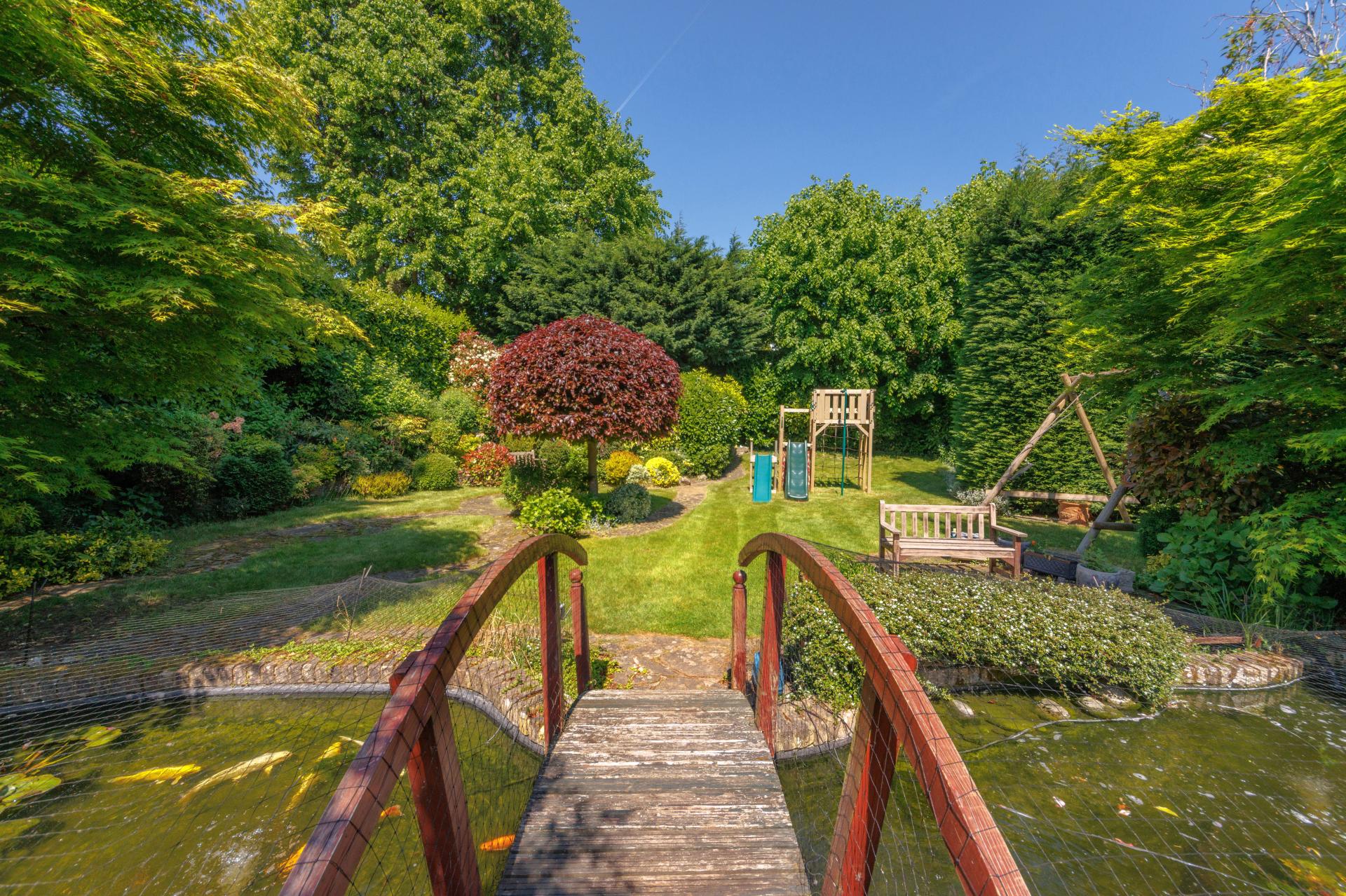 The true jewel of this property is the stunning landscaped garden, a serene oasis that seamlessly blends vibrant planting with mature trees and manicured lawns. A picturesque pond, complete with stepping stones and a charming wooden bridge, adds a tranquil focal point to the grounds. The expansive patio is perfect for al fresco dining or relaxing in the sun, all set within a wonderfully secluded and private setting.