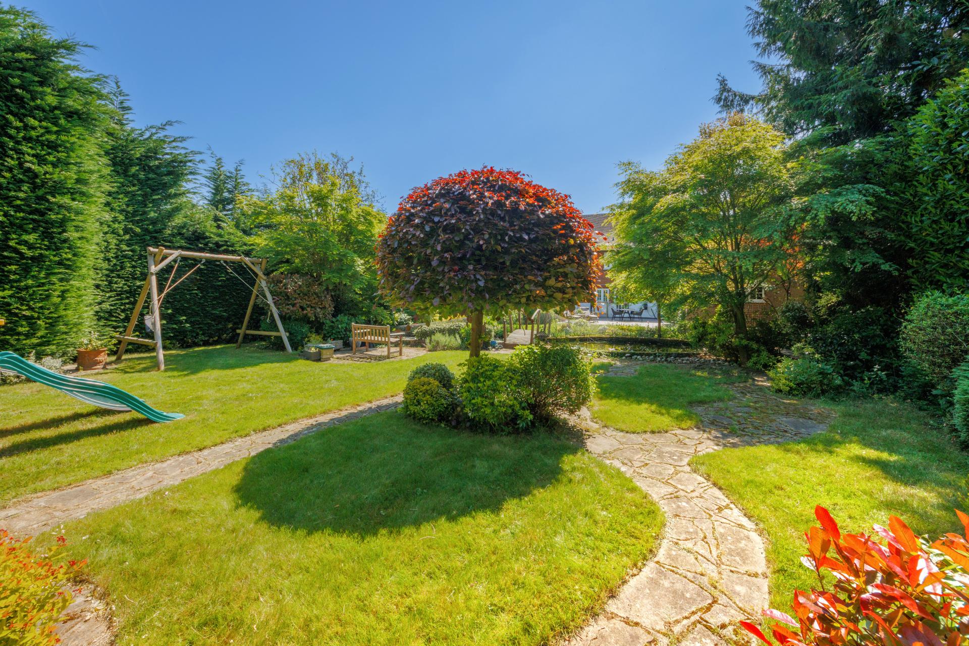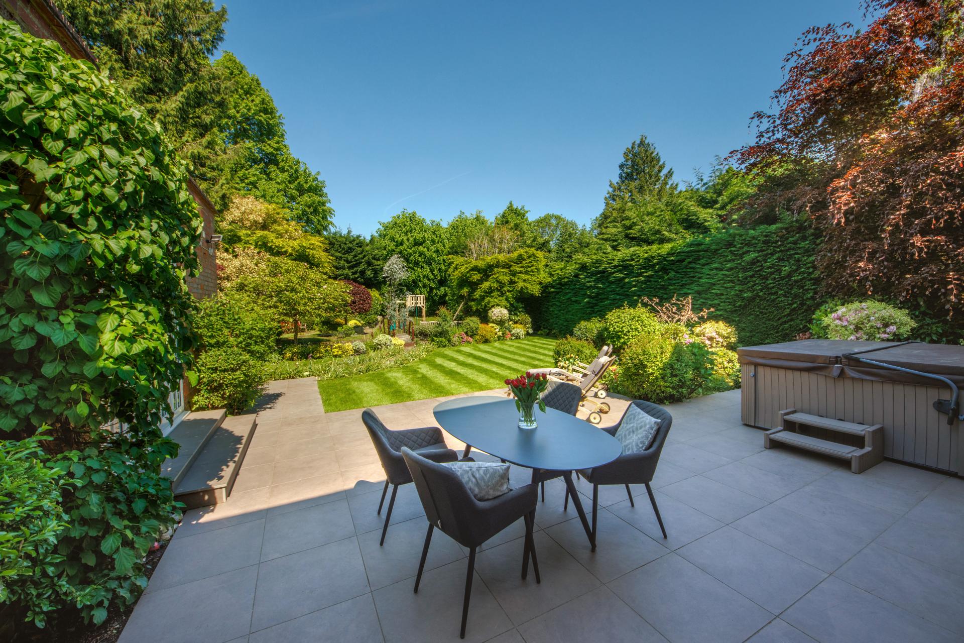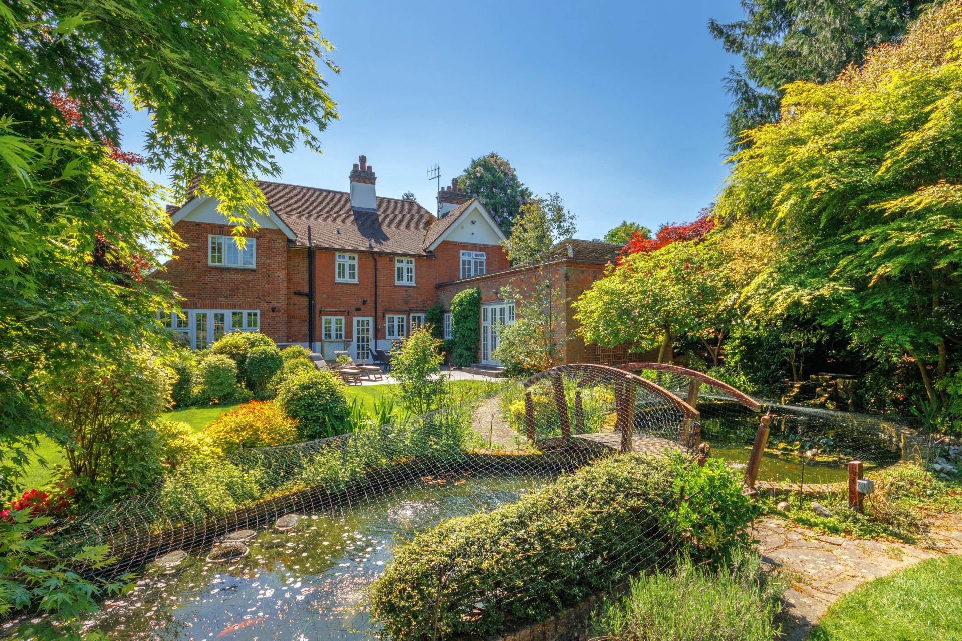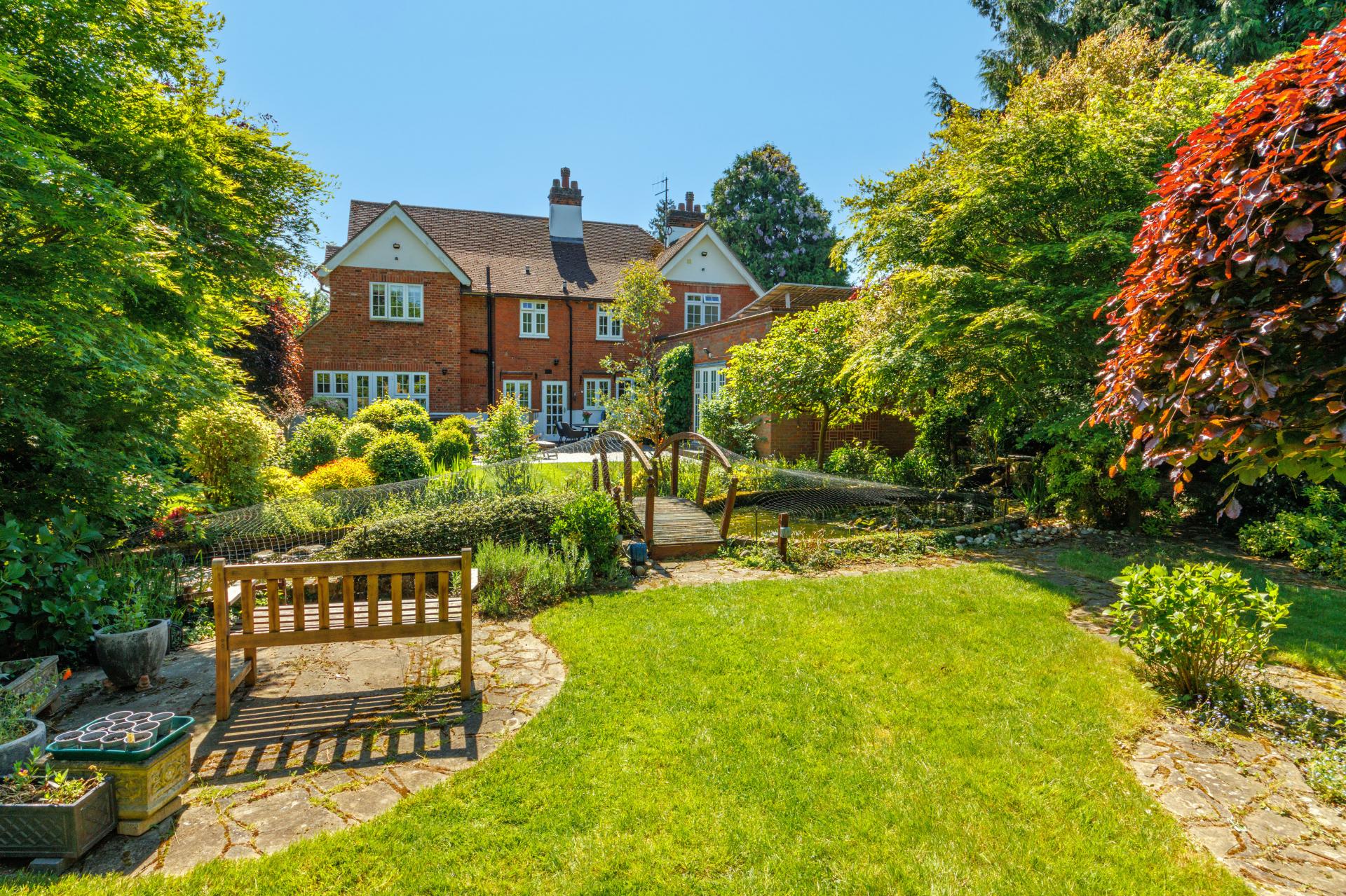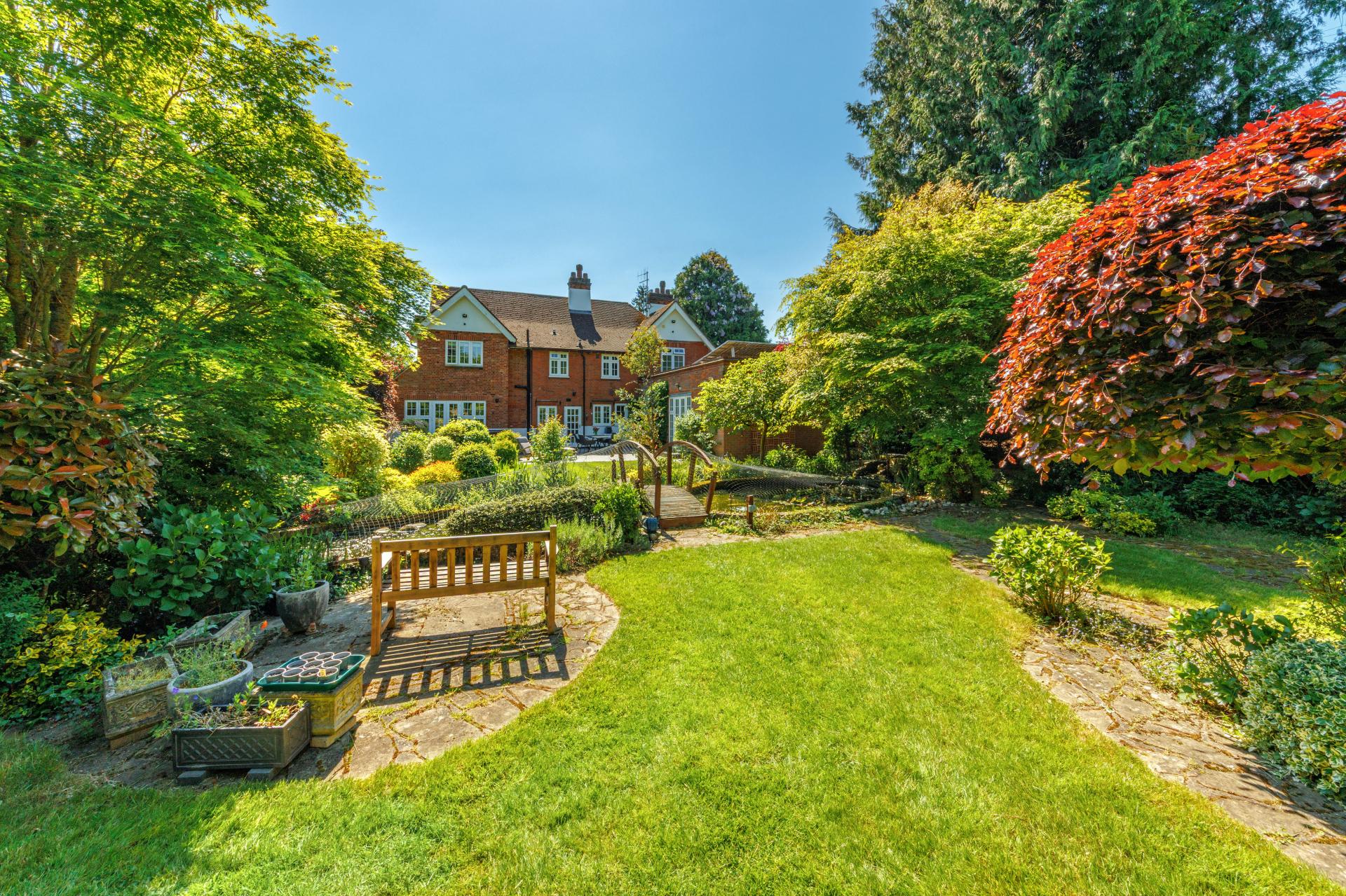 The true jewel of this property is the stunning landscaped garden, a serene oasis that seamlessly blends vibrant planting with mature trees and manicured lawns. A picturesque pond, complete with stepping stones and a charming wooden bridge, adds a tranquil focal point to the grounds. The expansive patio is perfect for al fresco dining or relaxing in the sun, all set within a wonderfully secluded and private setting.