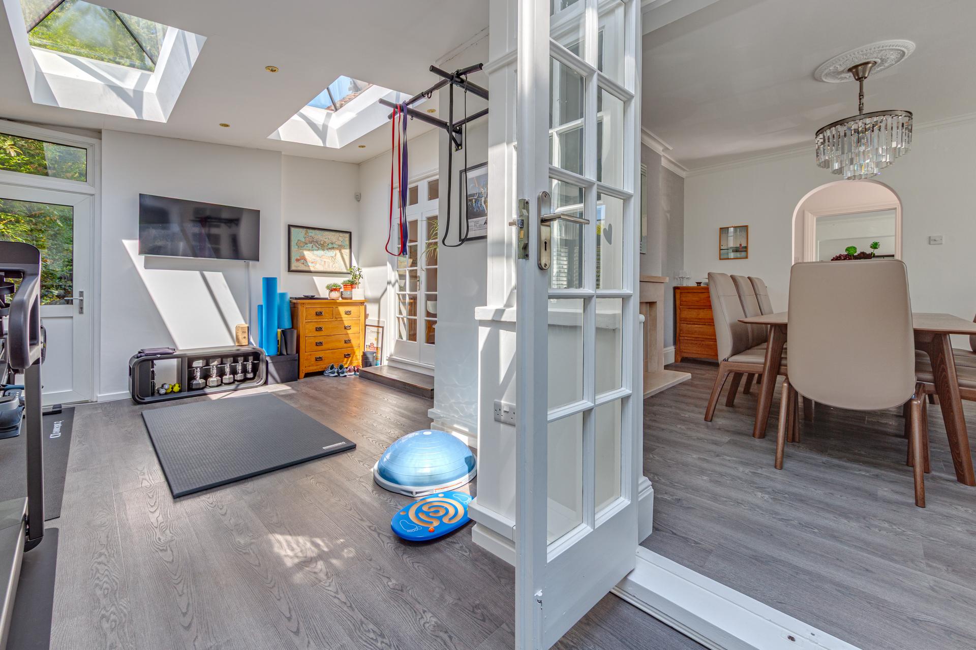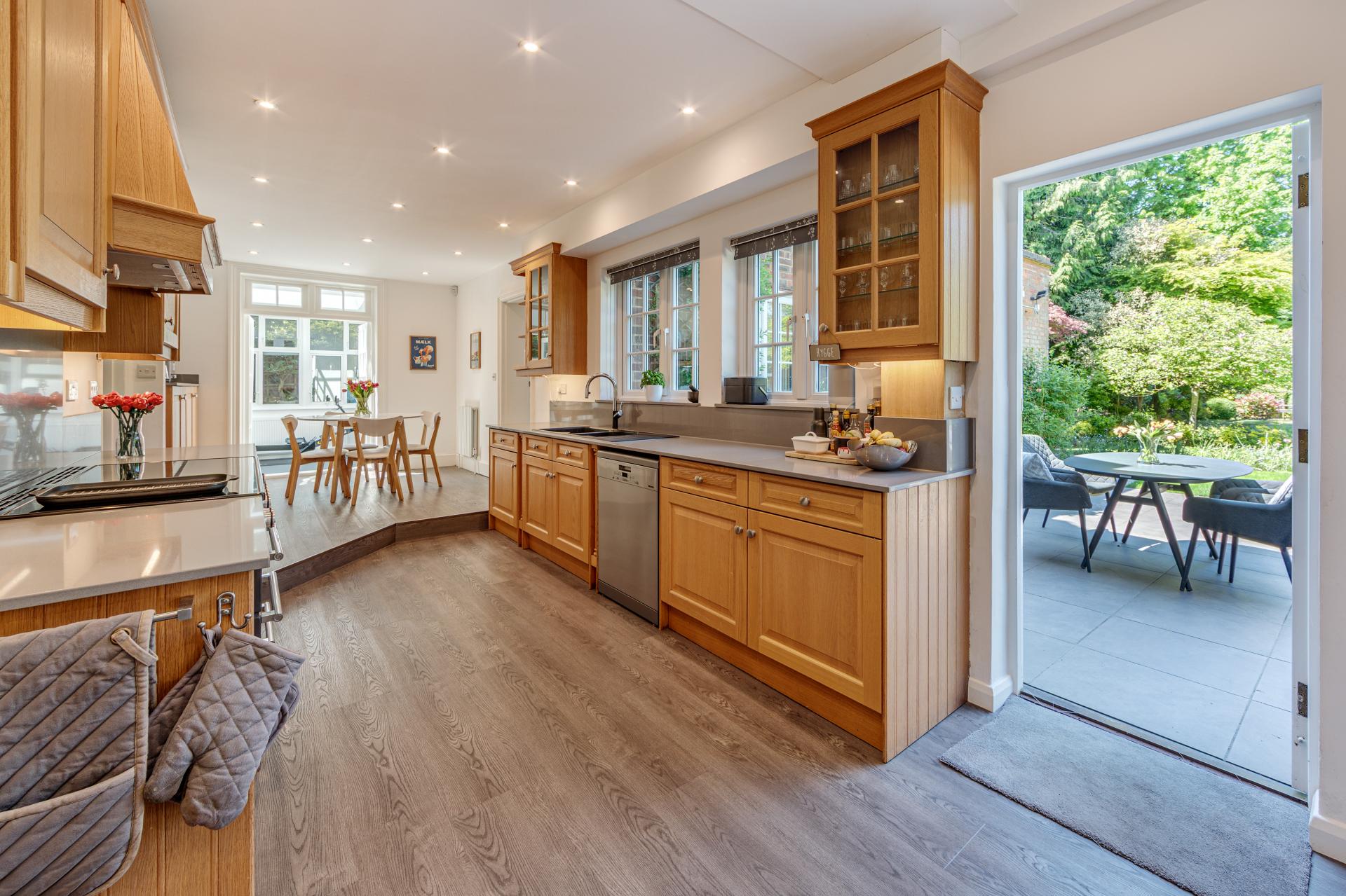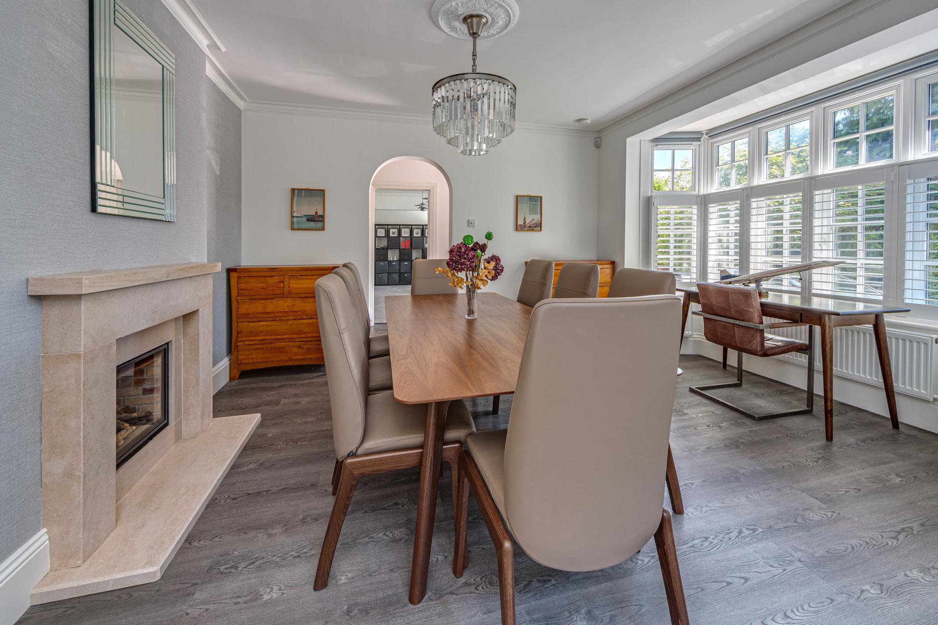 The ground floor welcomes you through a central hallway that leads to a generous kitchen/diner, forming the heart of the home with its expansive layout and seamless access to the rear garden. Adjacent to the kitchen is a bright and airy sun room/gym, a spacious sitting room and three formal reception rooms, each offering a distinct ambiance. Practical elements such as a utility room, pantry, shower room and internal garage enhance the home’s functionality, while the stylish flow between rooms adds to its charm.