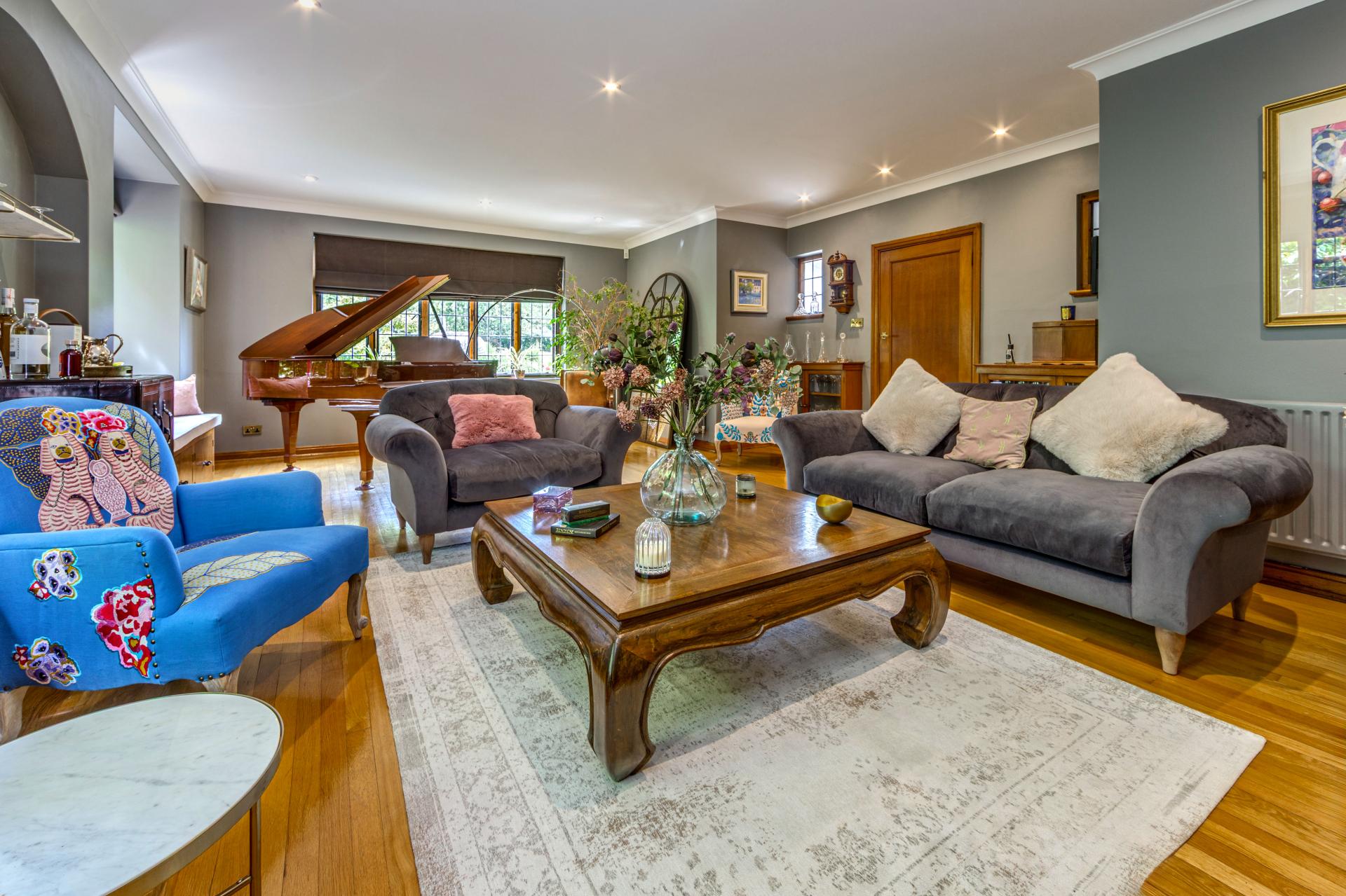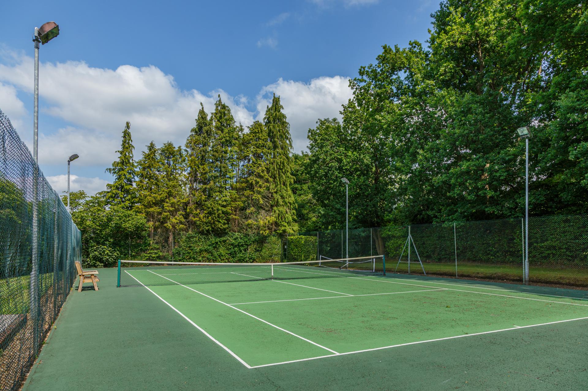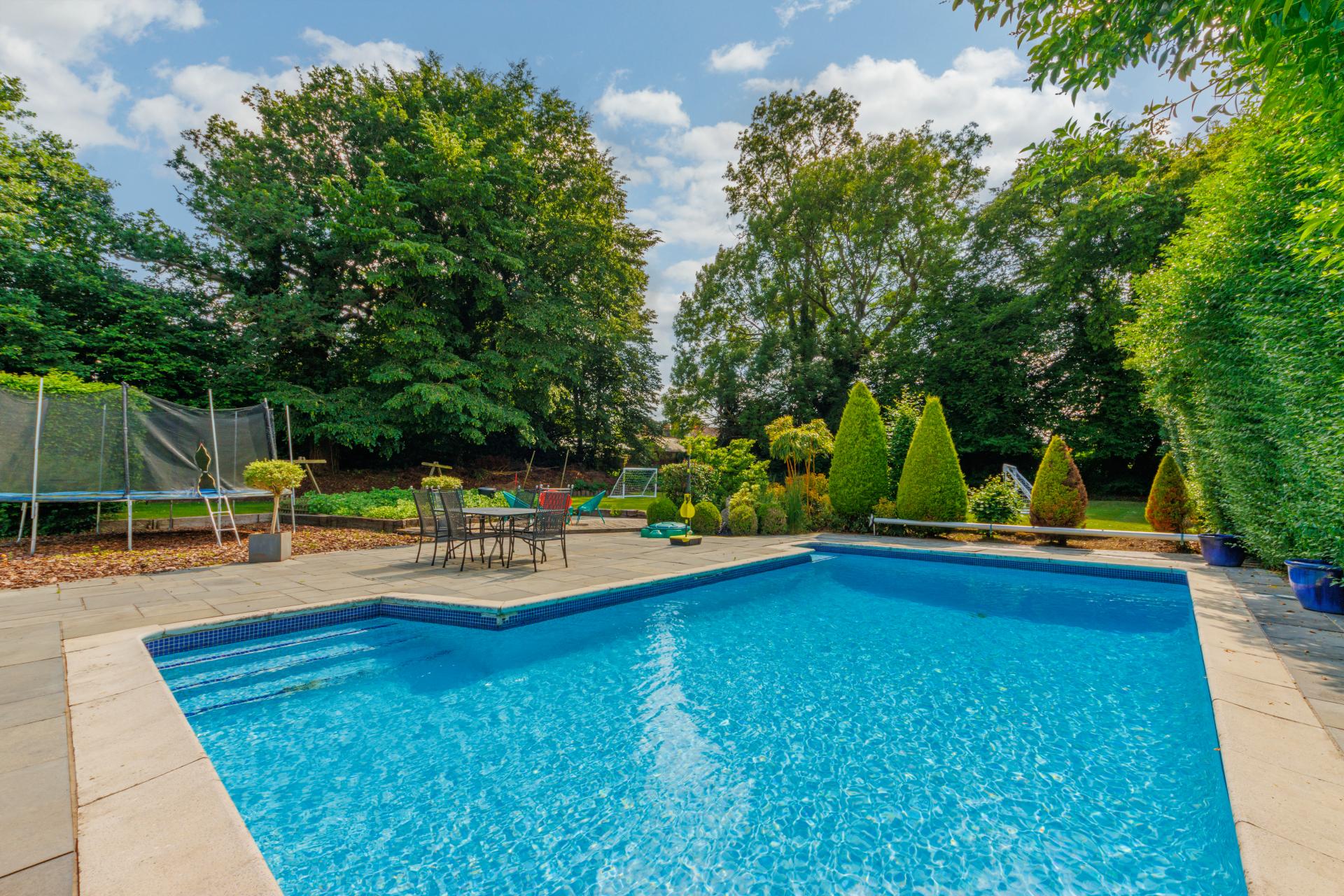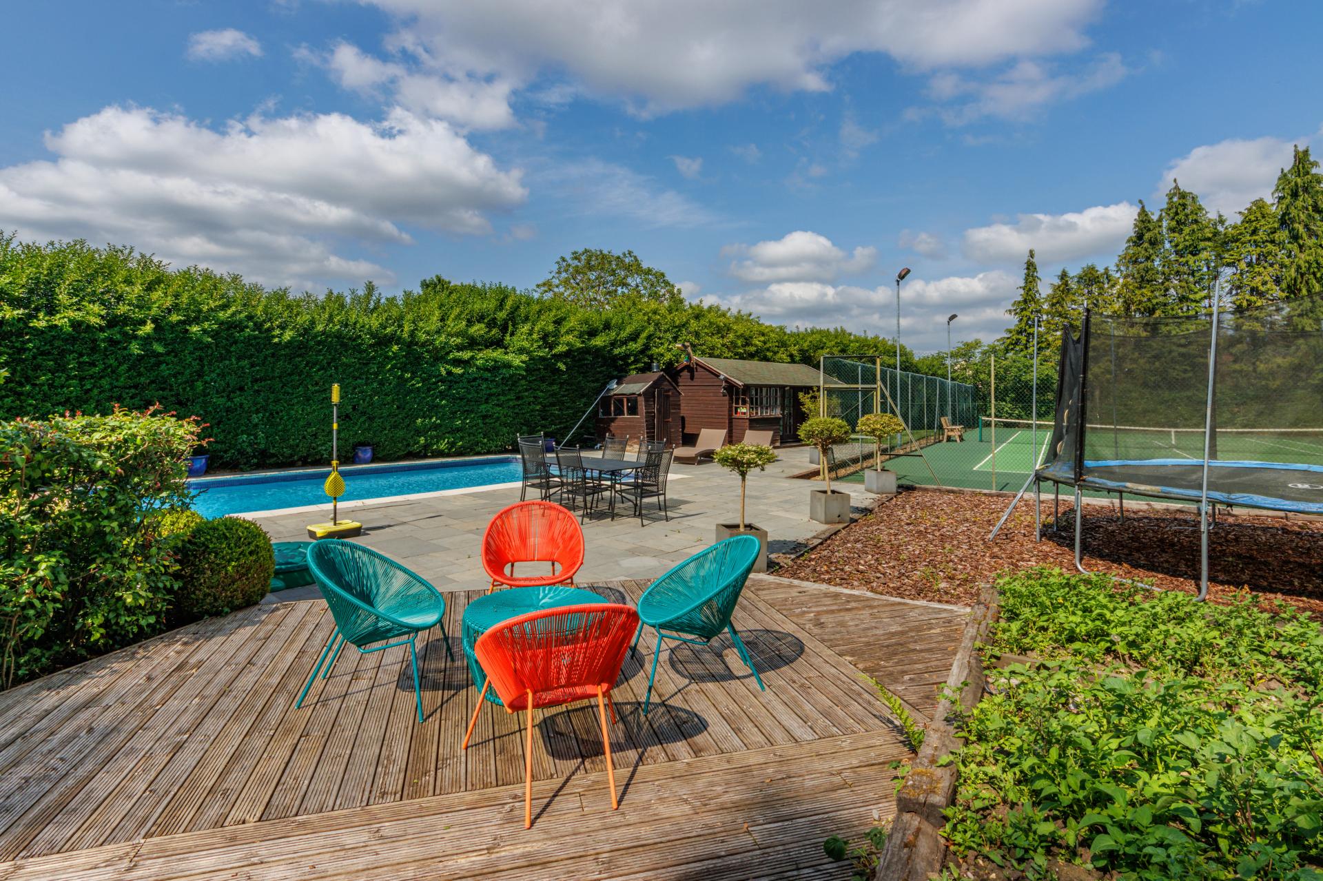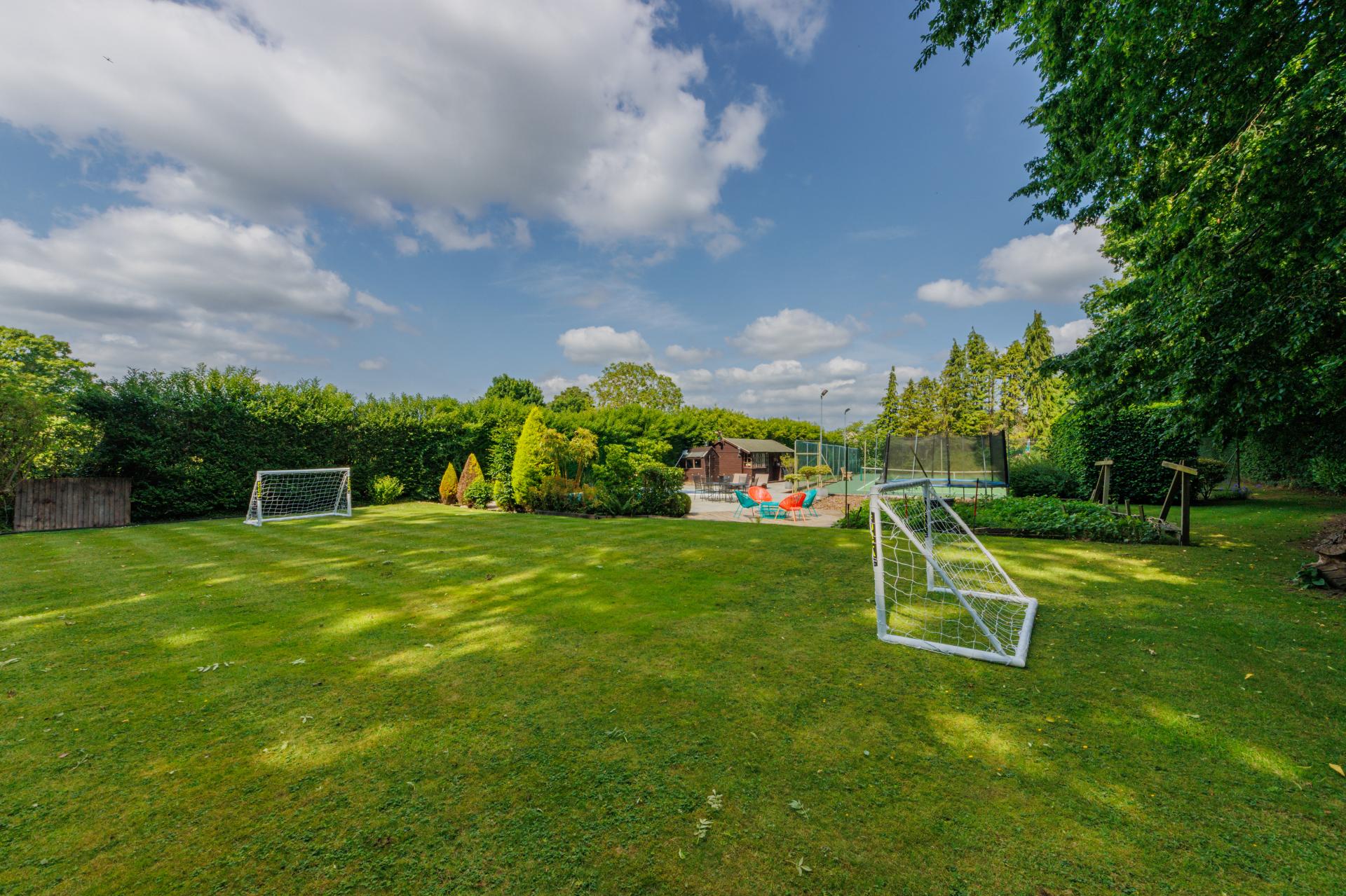 Externally, the grounds are equally impressive. A sweeping driveway offers ample parking, while the expansive gardens wrap around the home, incorporating a floodlit tennis court, swimming pool, and extensive lawns interspersed with mature trees, plants, and shrubs.
