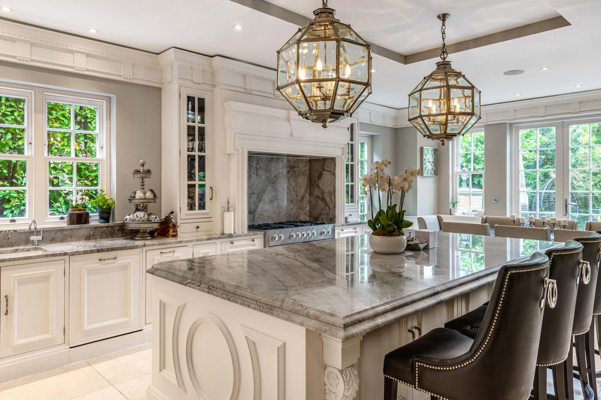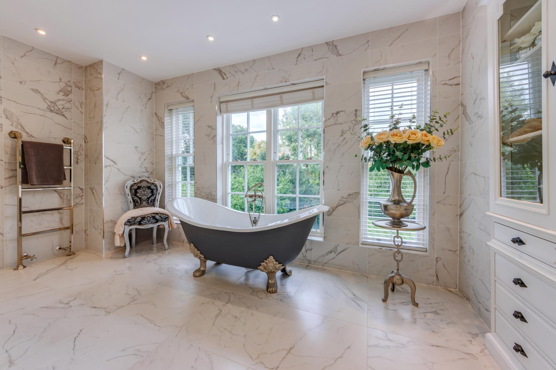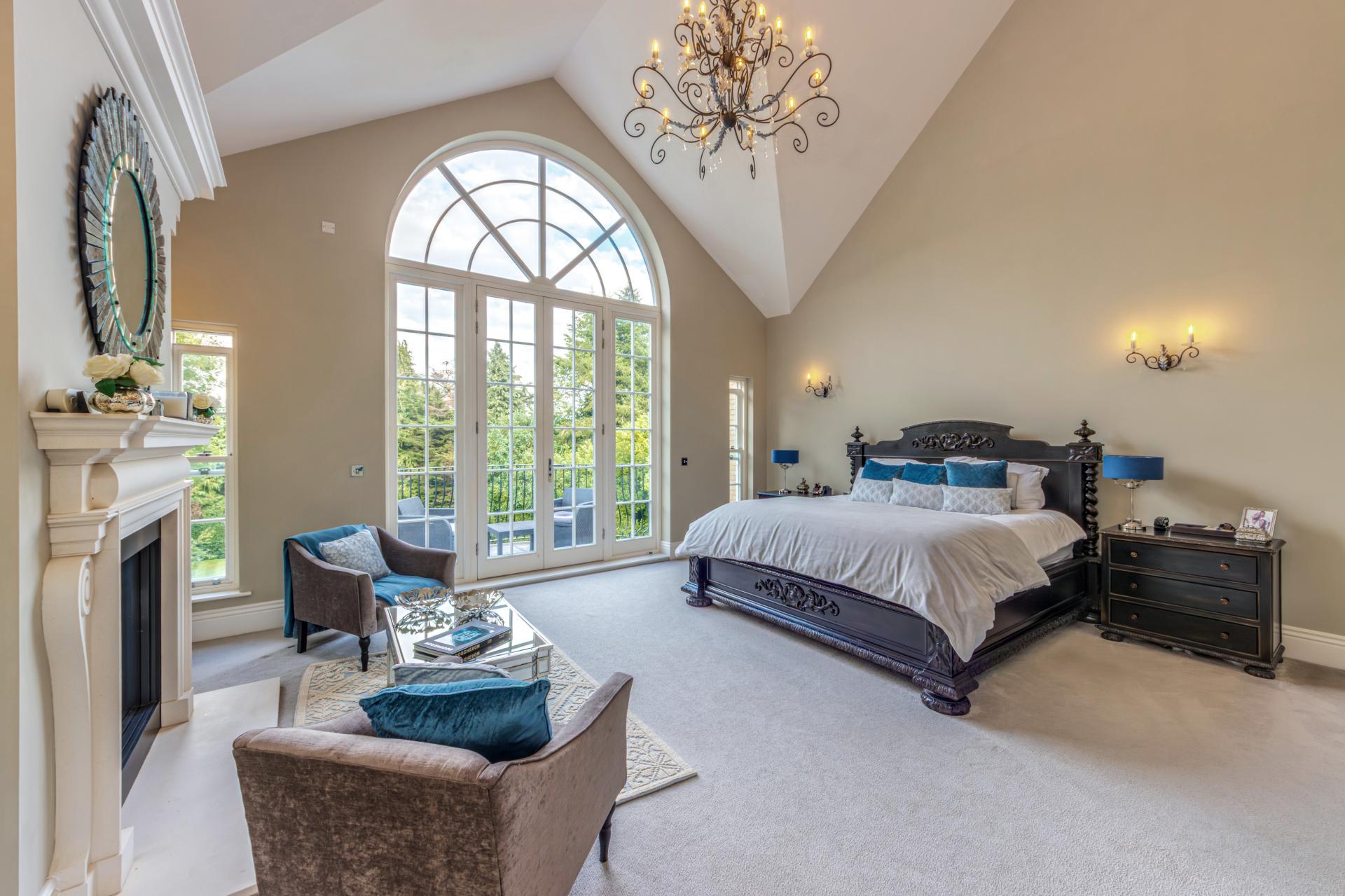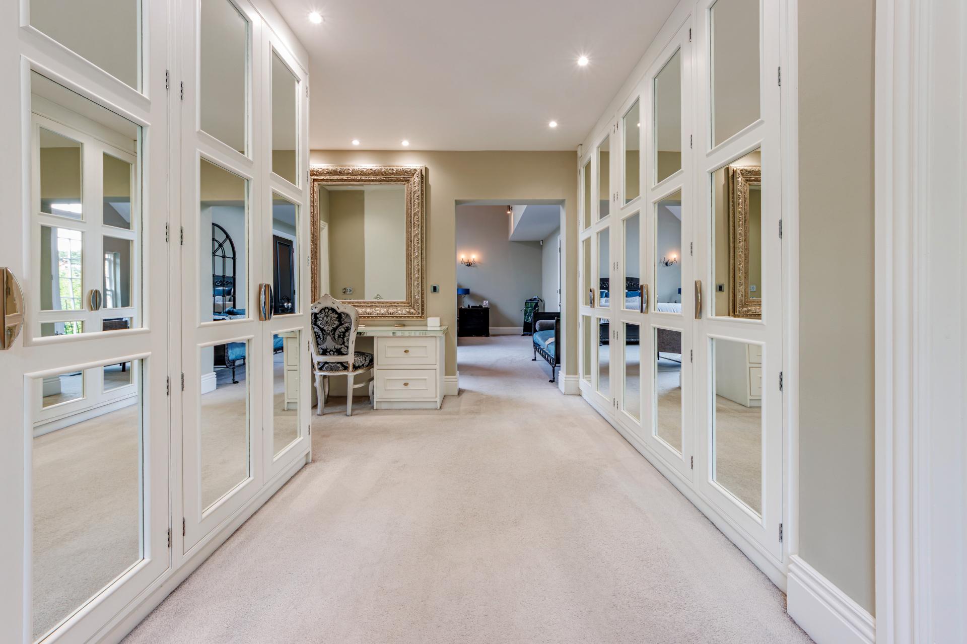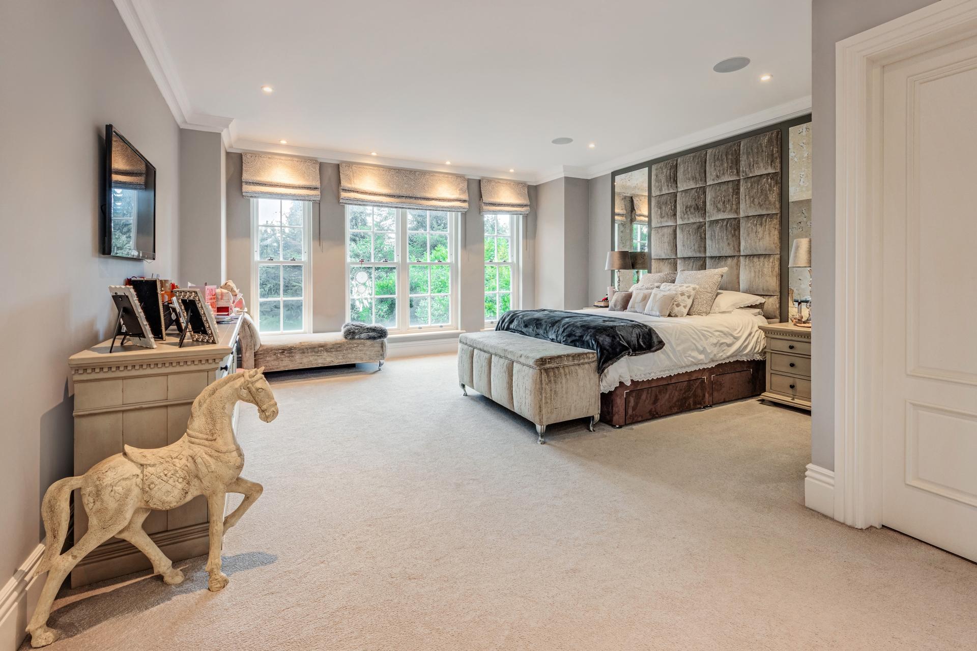 On the first floor, four generously proportioned double bedrooms each benefit from luxurious en-suite bathrooms. The magnificent principal suite is complemented by a bespoke dressing room. A self-contained annex to the side offers its own kitchen, living area, bedroom, and bathroom—ideal for an au pair or visiting guests.