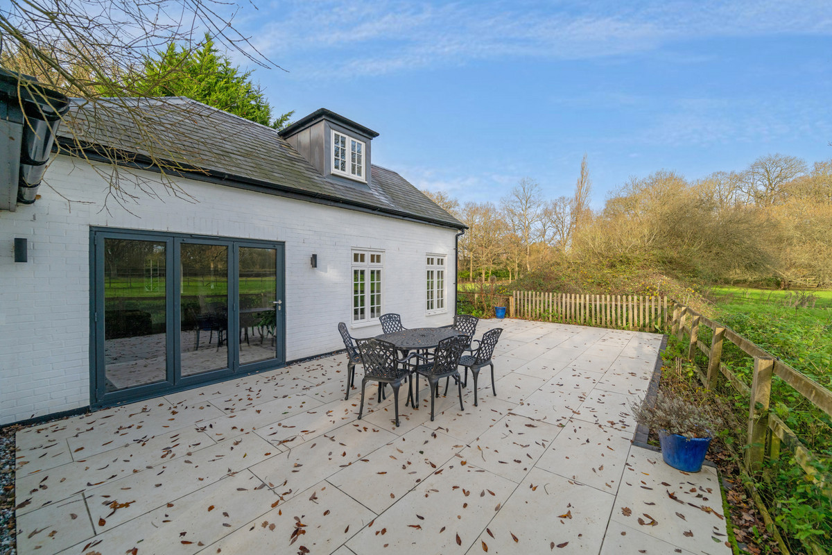 The ground floor also benefits from a beautifully renovated wing, offering a spacious 22-foot reception room with bi-fold doors opening onto a private courtyard with views of neighbouring equestrian fields.