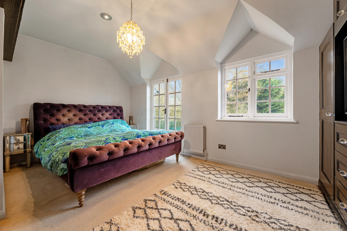 The first-floor principal bedroom features a Juliet balcony with stunning southerly views, a dressing area, and an en-suite bathroom.