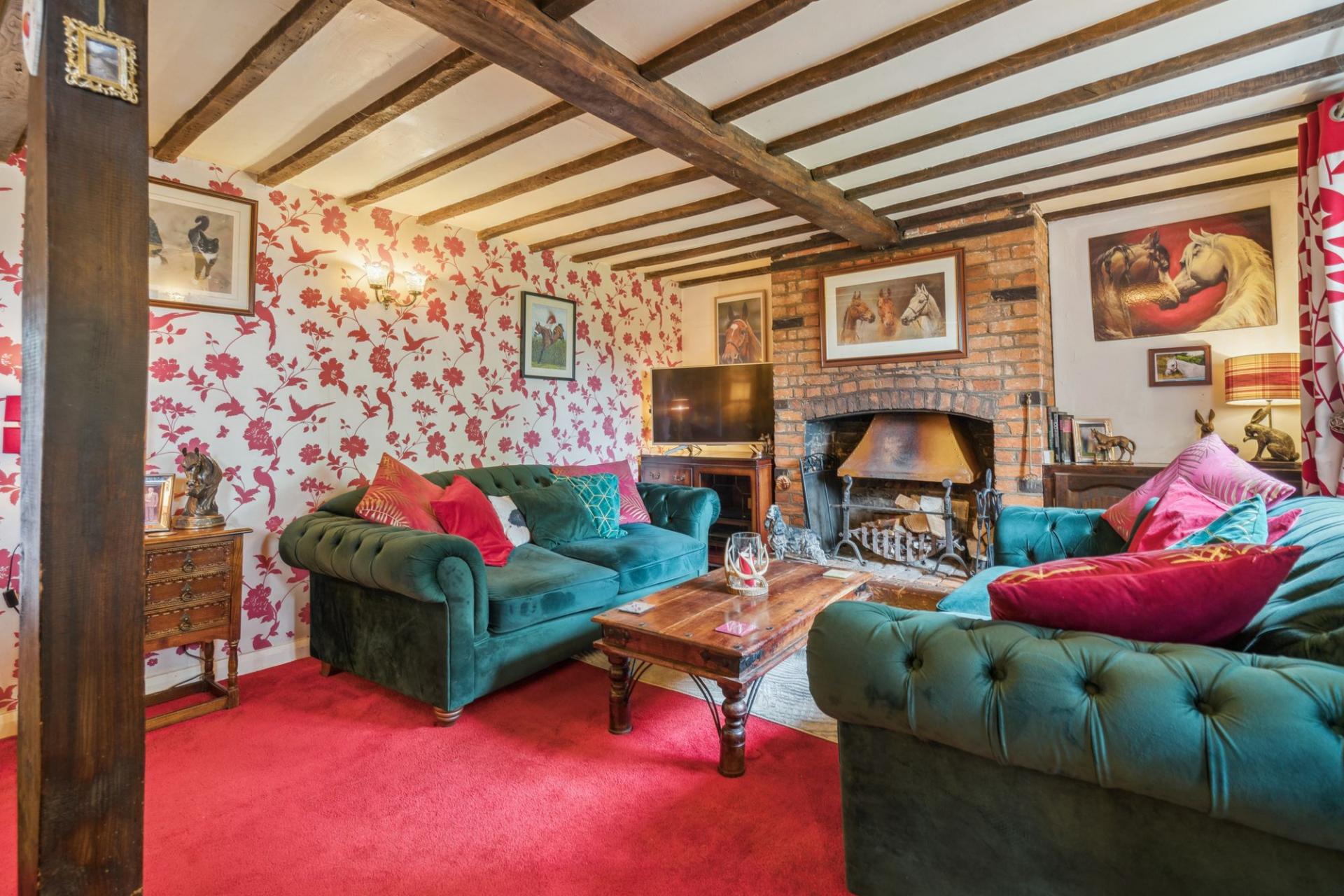 As you step inside, you’re instantly welcomed into the sitting/dining room that extends over 20ft. in length—the true heart of the home—a spacious, beautifully styled setting where exposed beams and a striking brick surround open fireplace combine to create a warm, character-filled atmosphere, perfect for relaxed evenings by the fire or entertaining family and friends in comfort.
