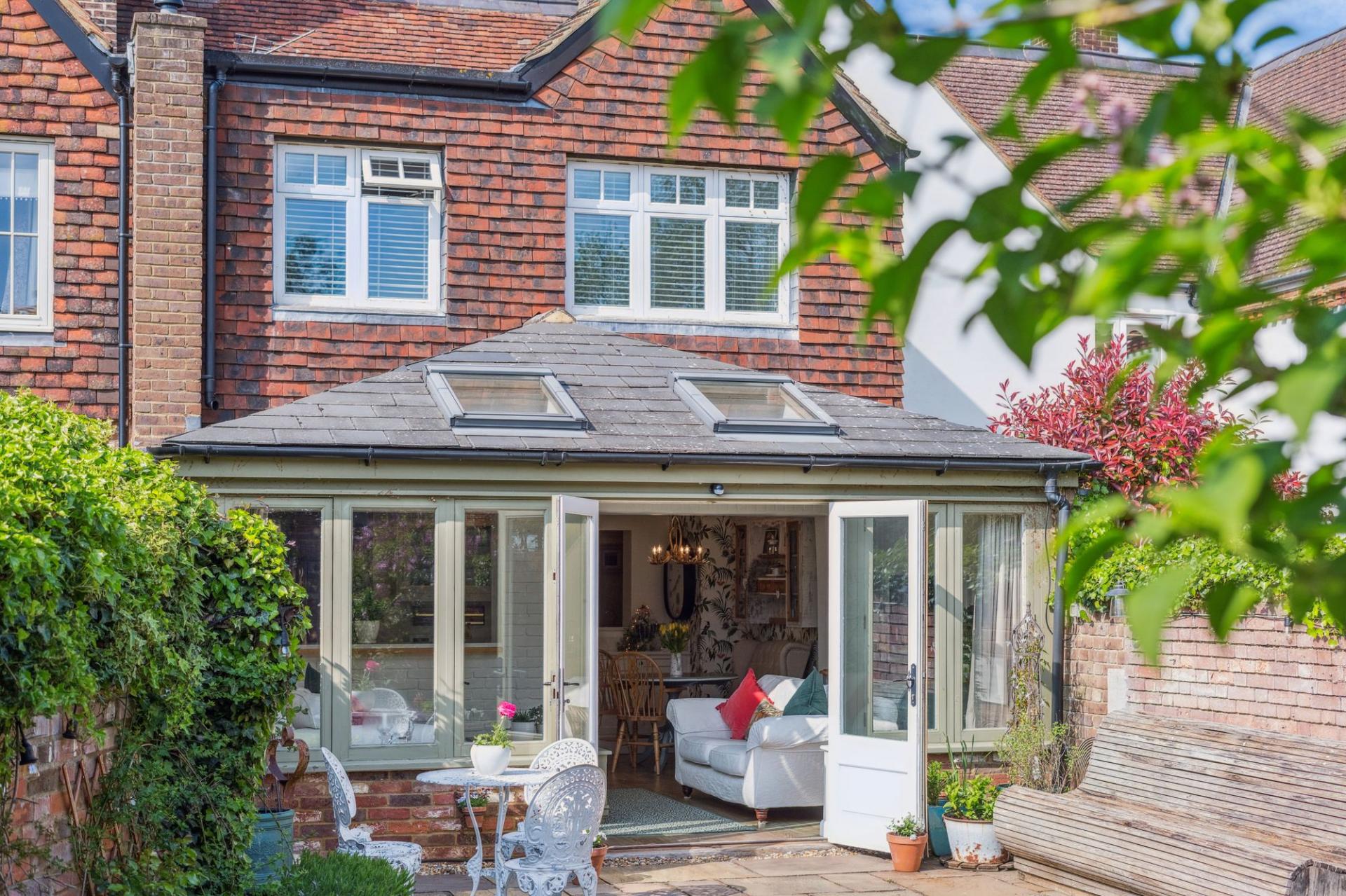 The soul of the home reveals itself in the breathtaking kitchen/breakfast room beyond. A flawless marriage of traditional design and modern comfort, the kitchen boasts elegant cream shaker cabinetry, space for a commanding range cooker, and underfloor heating beneath polished flooring. A natural gathering place, the kitchen extends into the garden room — a stunning vaulted space flooded with natural light from skylights above and framed by a wall of French doors that peel back to reveal the tranquil gardens beyond.