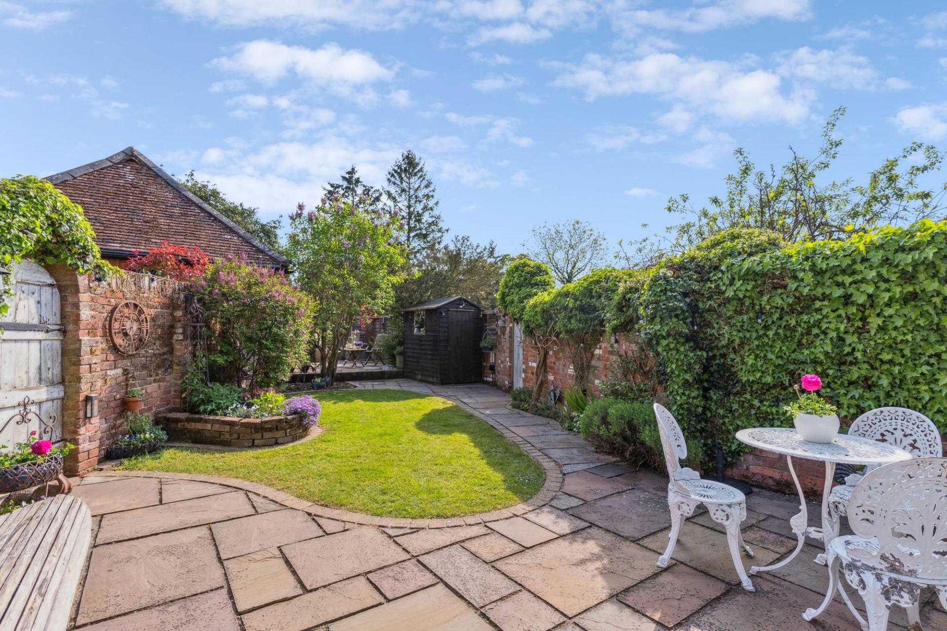 Outside, the south-facing garden is an enchanting tapestry of manicured lawns, colourful herbaceous borders, and a generous stone terrace — the perfect stage for outdoor dining, summer soirées, or peaceful morning coffees amidst birdsong. Mature planting provides privacy and a sense of seclusion rarely found, while a charming timber shed adds a practical yet picturesque touch. A meandering pathway leads you through this verdant retreat, drawing the eye towards a secret seating area at the garden’s far end - a magical, tucked-away spot providing an atmospheric setting for quiet moments or entertaining by firelight.