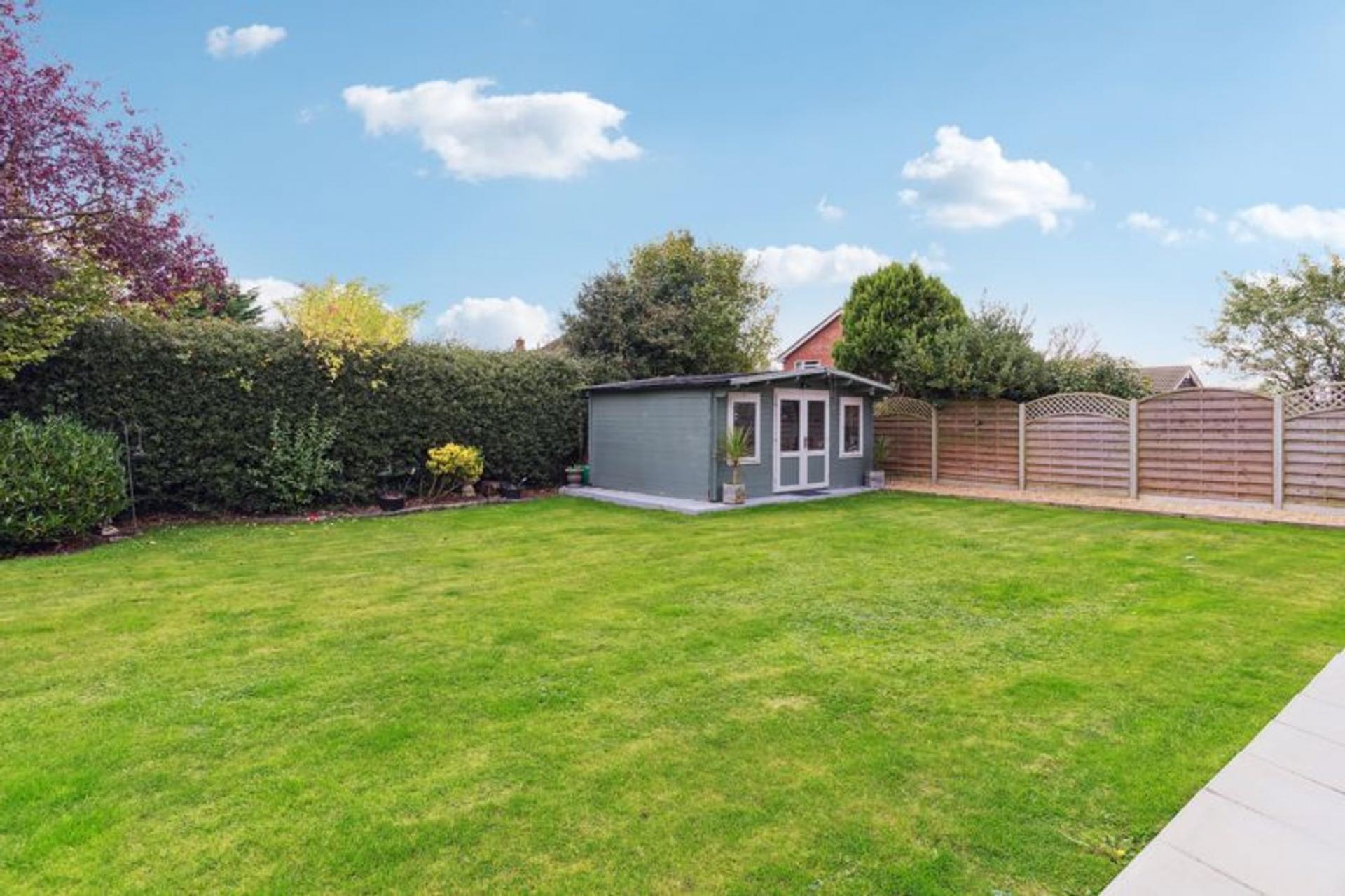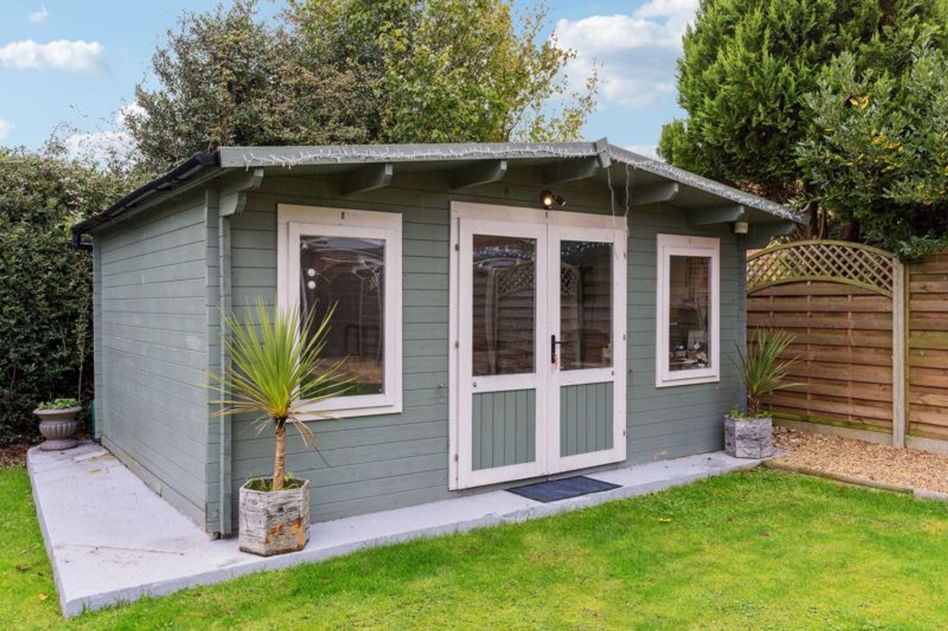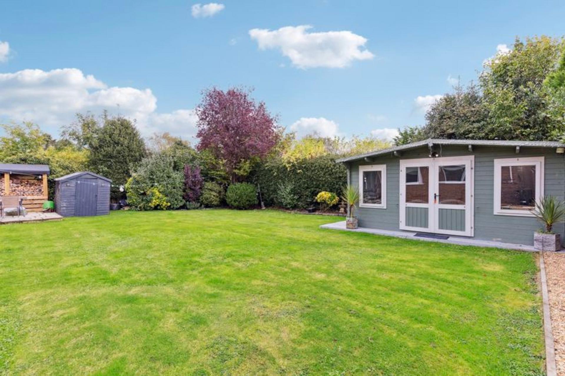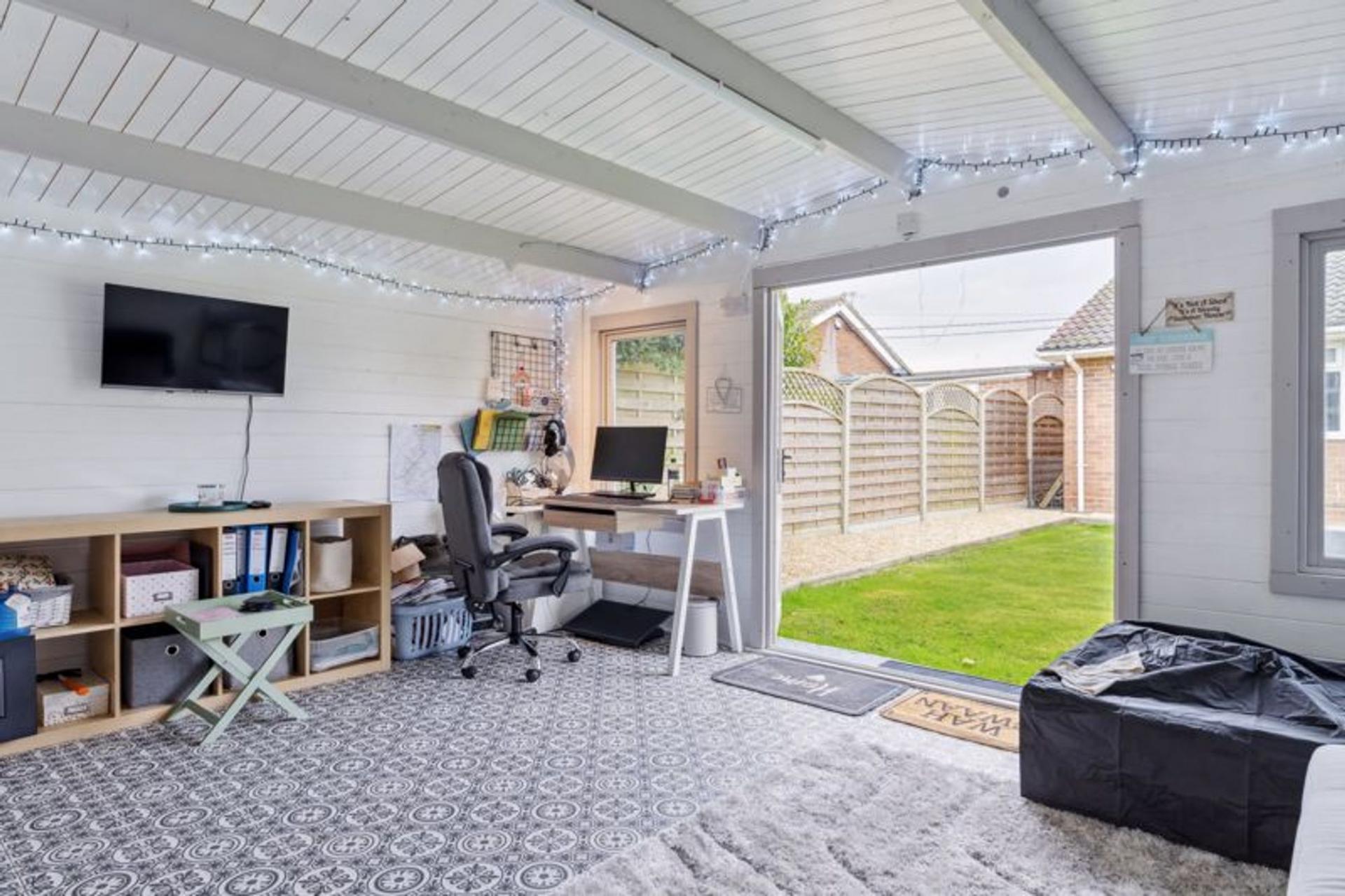 This stunning detached bungalow is accessed through electric gates with a telecom entry system, leading to an expansive driveway that offers ample off road parking for multiple vehicles and provides direct access to a generous double garage and the main entrance. The spacious double width garage extends over 22ft. and is equipped with power, lighting, and an electric rolling door for added convenience. At the rear of the garage, a practical utility area features additional storage and space for white goods, with direct access to the private rear garden. From the open plan living space, sliding patio doors seamlessly connect to a delightful patio area, perfect for al fresco dining and entertaining with friends and family while enjoying picturesque views of the south facing garden. The patio descends to a lush lawn bordered by mature hedges and fencing, ensuring a high degree of privacy and tranquility. Nestled at the rear of the garden, a spacious detached home office or summer house is equipped with power and lighting, creating an ideal space for working from home or unwinding in a serene environment. This versatile area is perfect for relaxation and entertaining, allowing you to fully immerse yourself in the peaceful surroundings.