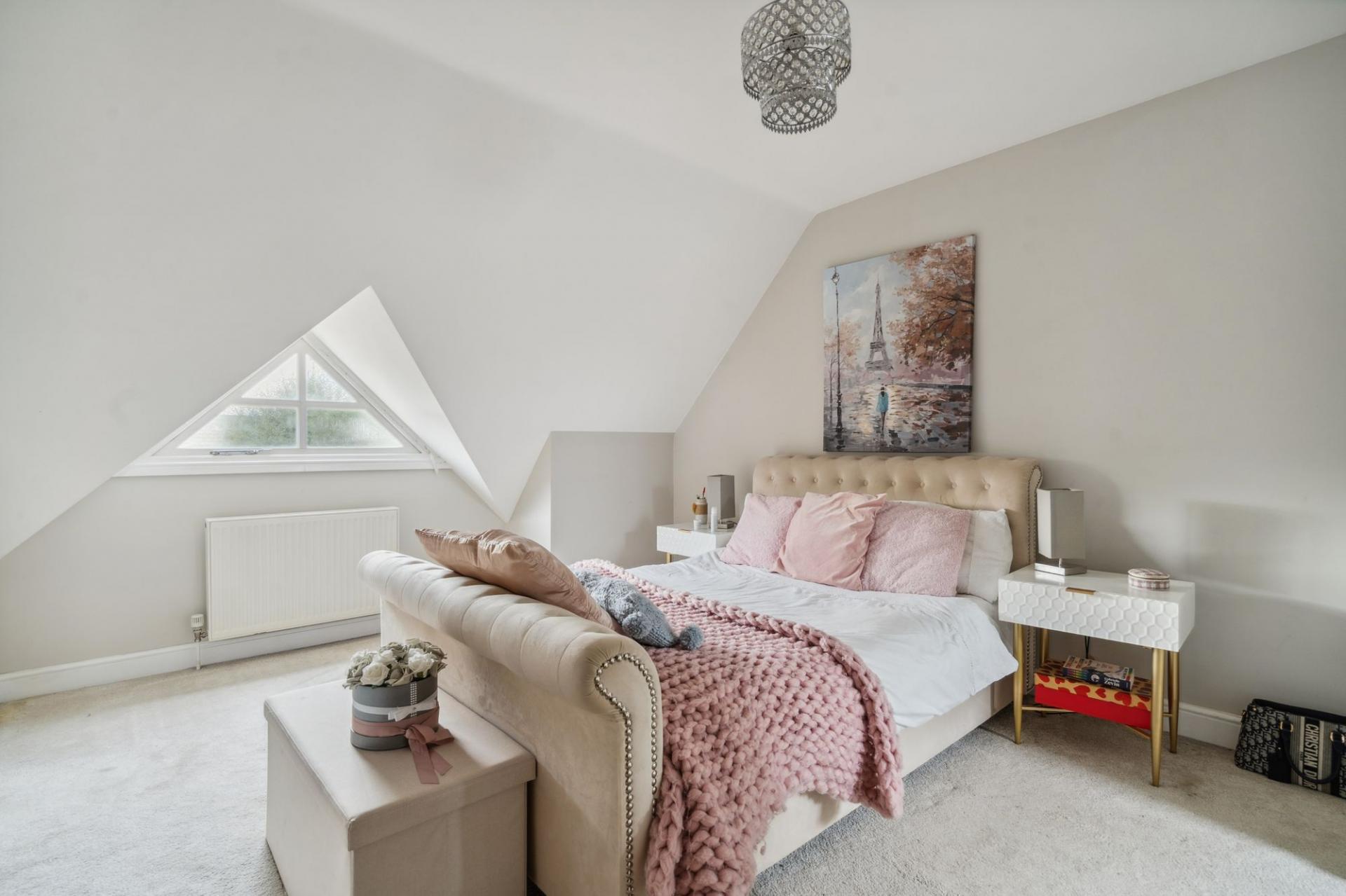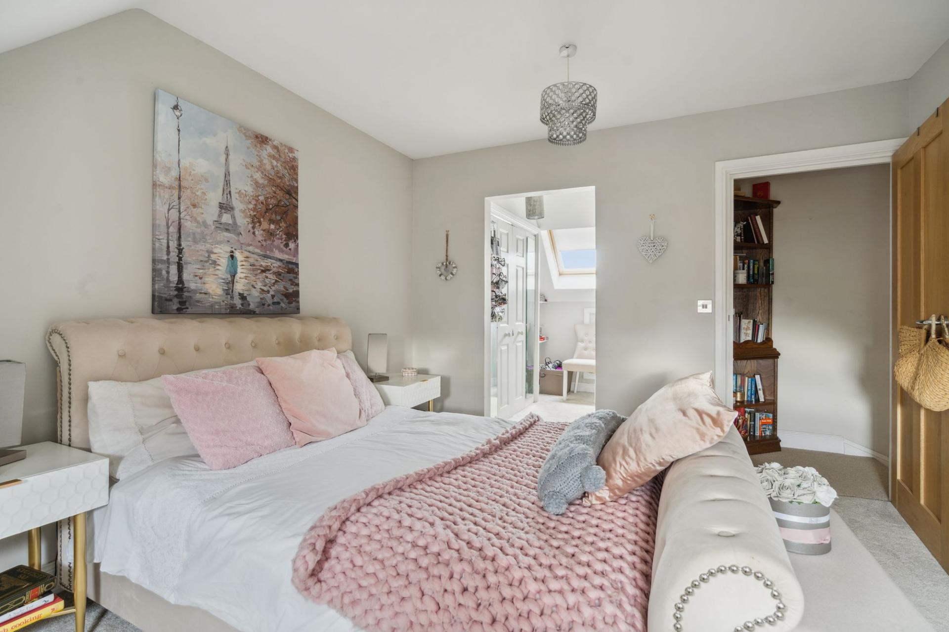 Stairs from the first-floor landing lead to the second floor, which is dedicated to the principal bedroom suite. This tranquil and private space features a large double bedroom area, a dressing area with fitted wardrobes, and a contemporary en suite shower room, also benefiting from underfloor heating. This top-floor retreat offers a peaceful escape from the rest of the home and is ideal for those seeking space and privacy.