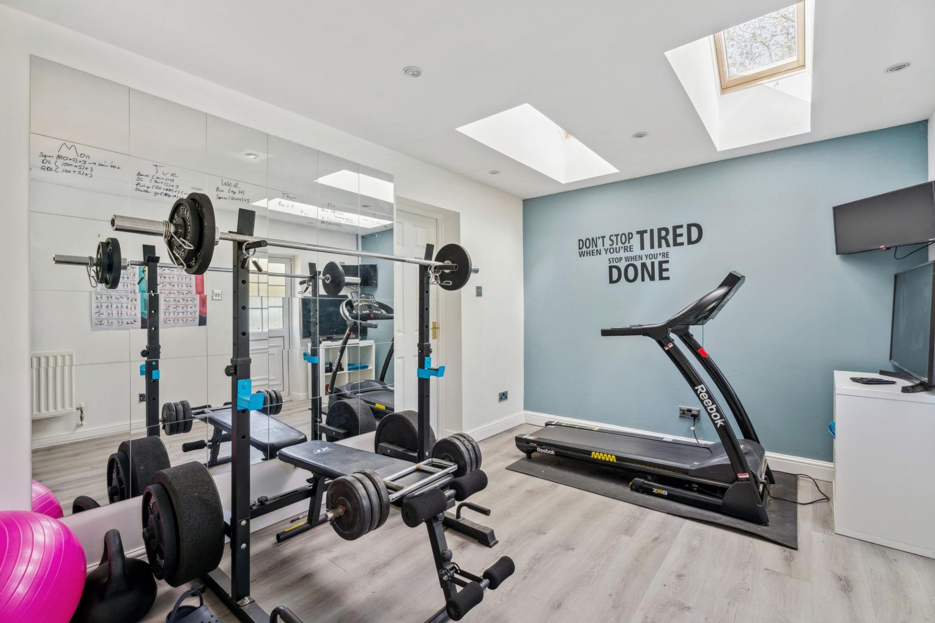 Stepping inside, you’re greeted by a welcoming entrance hall, complete with a downstairs cloakroom. From here, elegant double doors lead into the sophisticated dual aspect formal sitting room, where a charming feature fireplace and patio doors opening onto the private rear garden create an inviting space to relax and unwind. To the rear of the property lies the contemporary finished open plan kitchen/breakfast/family/garden room—designed with both everyday living and effortless entertaining in mind. The kitchen is appointed with an extensive range of sleek base and wall-mounted units, integrated dishwasher and fridge/freezer, space for a Rangemaster cooker, and a breakfast bar ideal for casual meals or morning coffee. A separate utility room, thoughtfully positioned just off the kitchen, offers additional storage and space for further appliances—perfect for keeping day-to-day life running smoothly. Flowing from the kitchen/breakfast area, a bright and airy garden room provides an elegant setting for more formal dining occasions, all while enjoying idyllic views over the beautifully landscaped, south/west-facing private garden. Off the main entrance hall, a dedicated home office offers a quiet retreat for work or study, equally suited as a playroom for younger family members. A connecting door leads through to a generous, dual aspect family room—ideal for movie nights or watching the big game in comfort—while beyond lies a fully equipped gym/studio, providing a haven for fitness enthusiasts. From the home office through to the gym and adjoining garage, this expansive and adaptable wing of the home presents an exciting opportunity for conversion into a self contained annexe—perfect for multi-generational living or guest accommodation, offering exceptional flexibility to suit the evolving needs of today’s families.