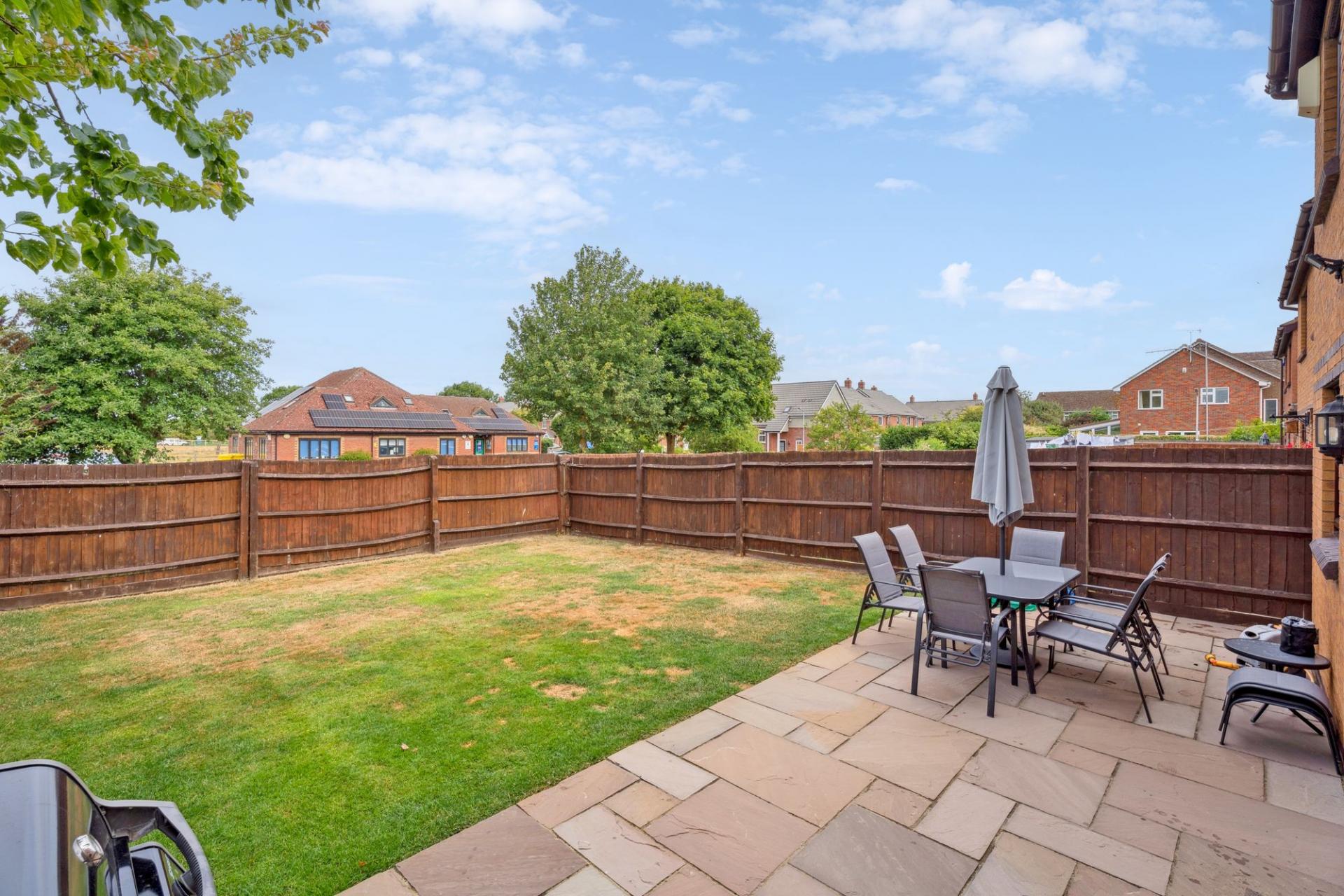 This modern family home is approached via a driveway, providing off-road parking for two vehicles and leading to a well-sized single garage and the main entrance. A neatly maintained lawned front garden borders the property, while gated side access offers a practical route to the rear garden. Stepping out from either the dining room or kitchen, you are welcomed onto a generous paved patio — an ideal setting for al fresco dining or entertaining in the warmer months. Beyond the patio, a mature lawn stretches out, offering ample space for children to play or for simply enjoying the outdoors in a peaceful and private setting. Enclosed by well-kept fencing, the garden enjoys a high degree of seclusion, creating a calm and inviting retreat.