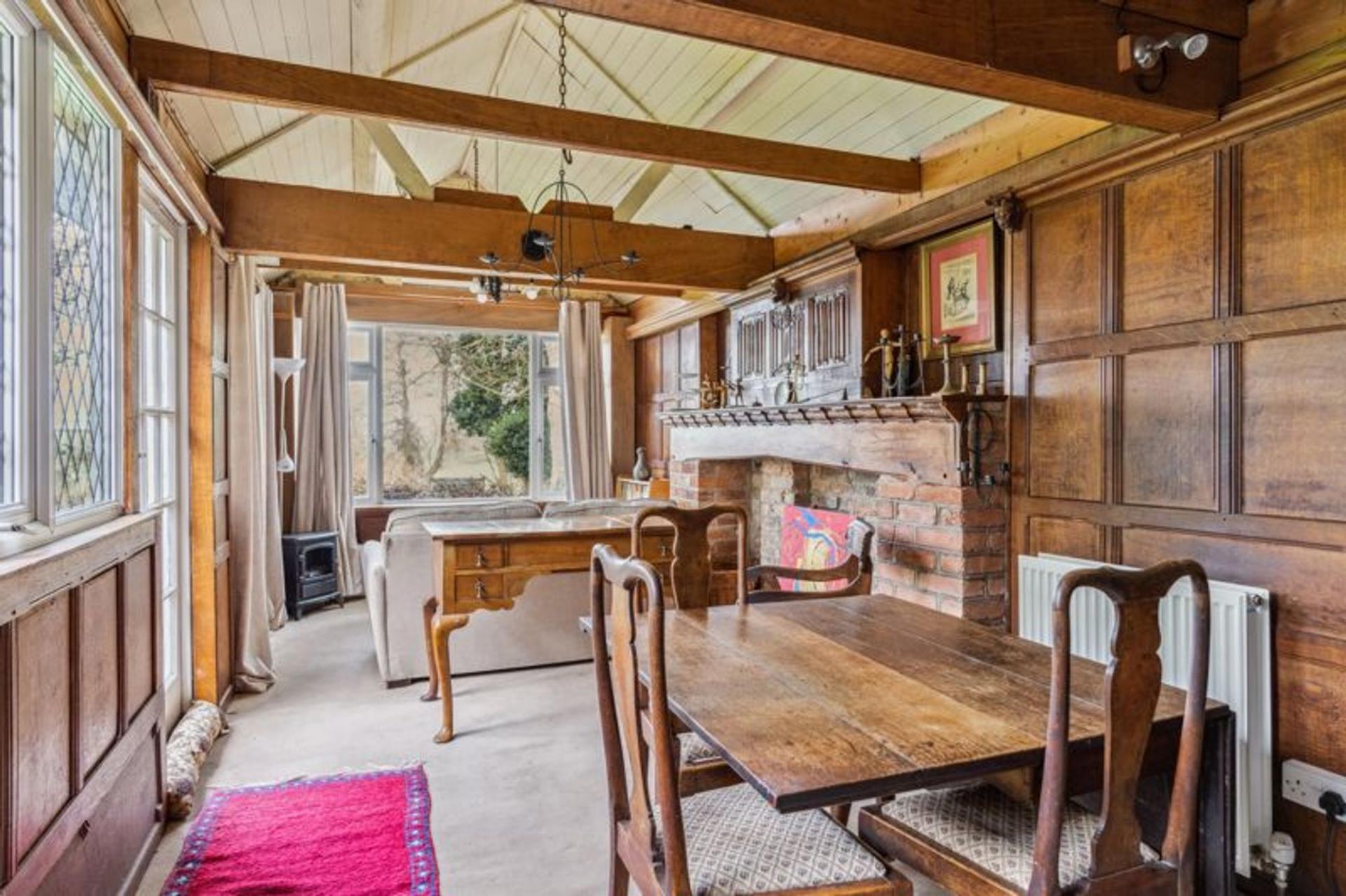 Upon entering this character home, a welcoming entrance hall connects to a delightful light and airy dual aspect formal sitting room to the front of the property with a feature inglenook open fireplace and views over formal grounds to the front. Adjacent to the sitting room, an inner door leads to a separate lounge, and is an ideal playroom for children or the perfect snug to cosy up and relax in front of the brick surround open fire place with loved ones. Double doors from the lounge open into a good sized kitchen/breakfast room with scenic views over the formal grounds and countryside beyond. The kitchen area is fitted with a range of of base and wall mounted units, integral double oven with an electric hob, and space for a dishwasher. From the entrance hall, a utility area is situated off the kitchen and provides space for white goods for convenience, and a downstairs cloakroom is situated adjacent to the utility. Beyond the entrance hall, a door leads down into an impressive family room finished with an 'Arts and Craft' style wood panelling, a brick surround fire place with wooden mantelpiece, and a vaulted ceiling. With a dual aspect taking full advantage of the grounds and breathtaking views across Bedfordshire countryside, the family room serves as the ideal space for entertaining with friends or family, as well as the perfect space as a hobby room or working from home.