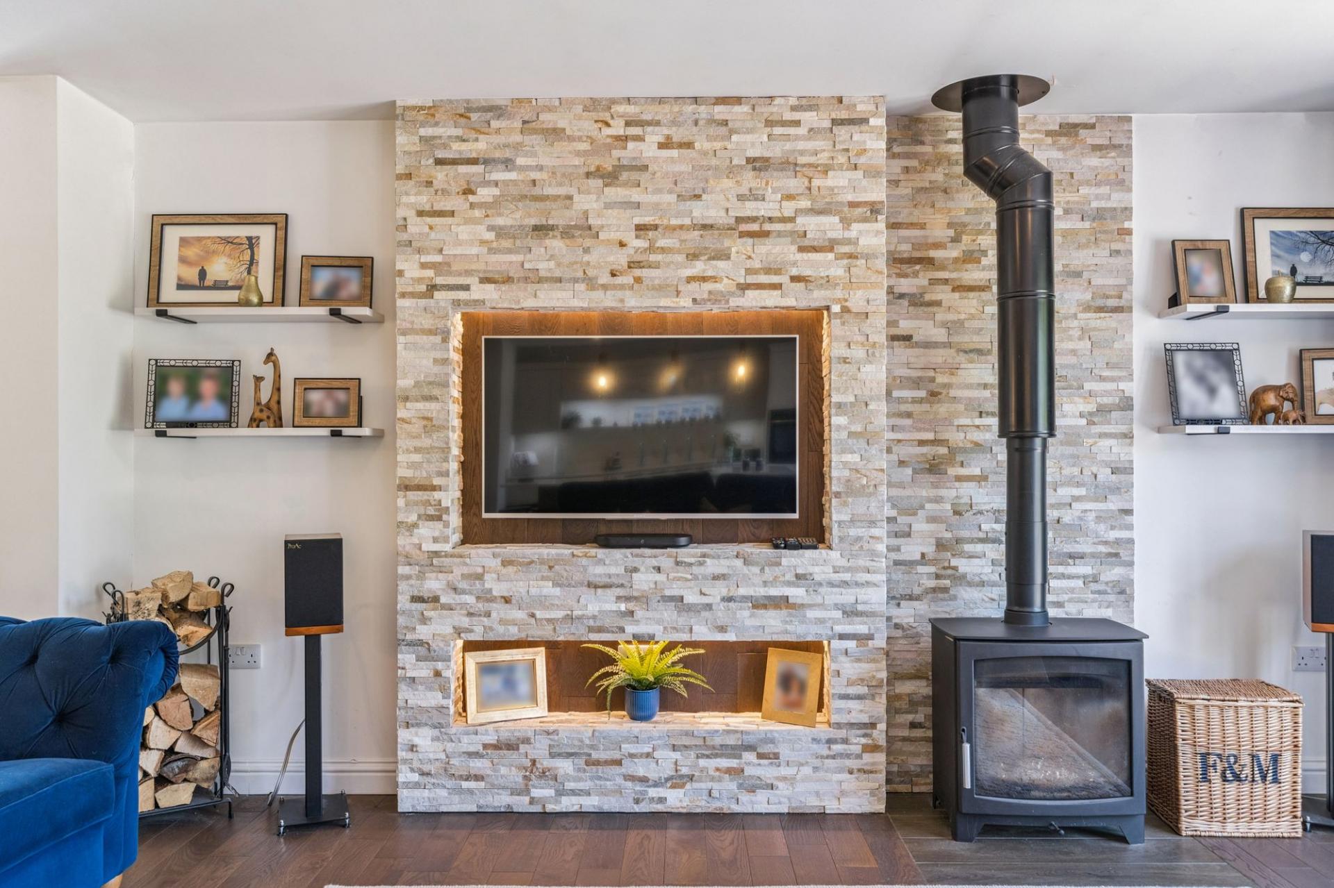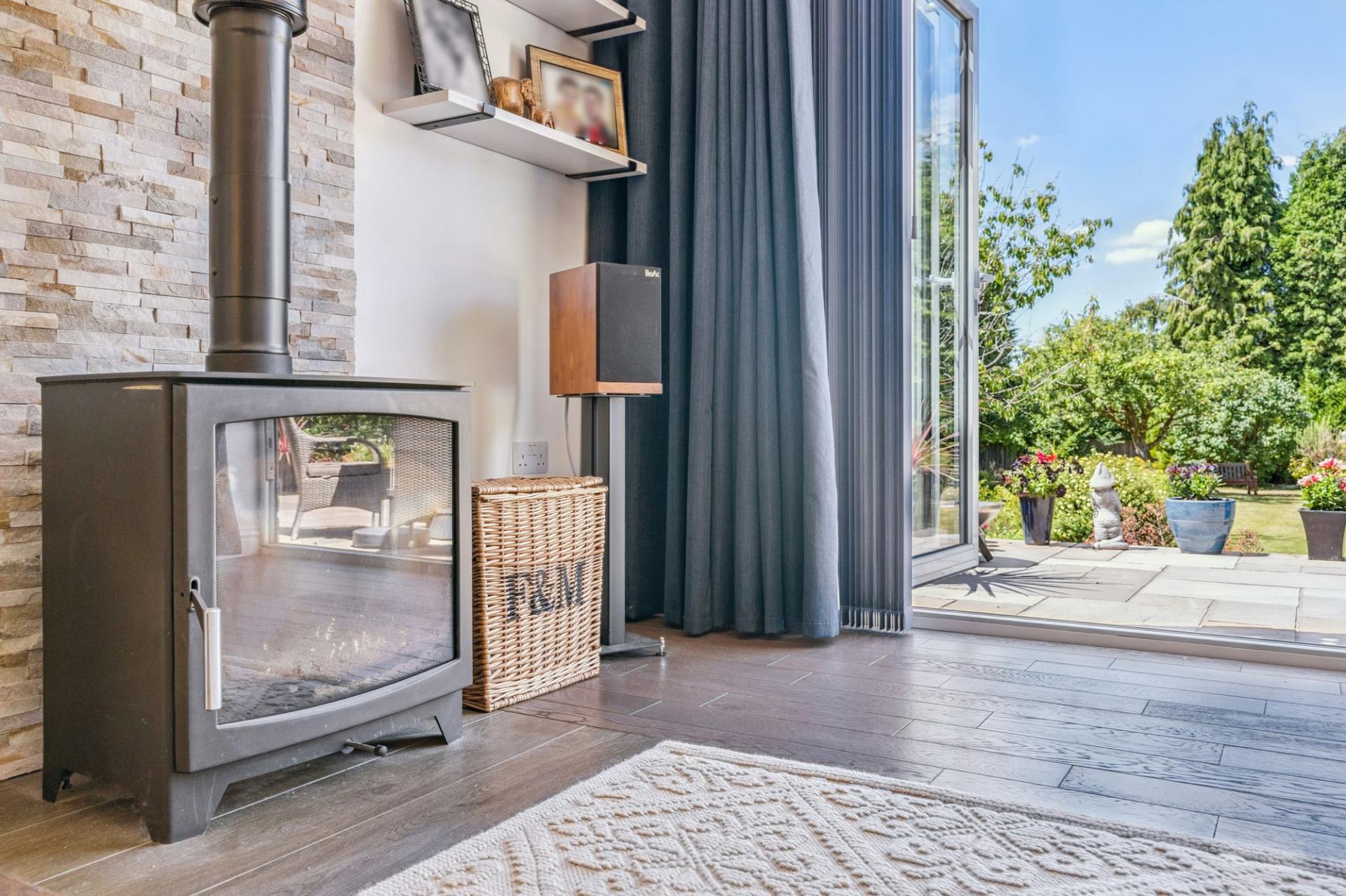 A working log burner in the living room adds a cosy touch, perfect for those colder evenings. It creates a warm, inviting atmosphere that complements the home’s modern style.