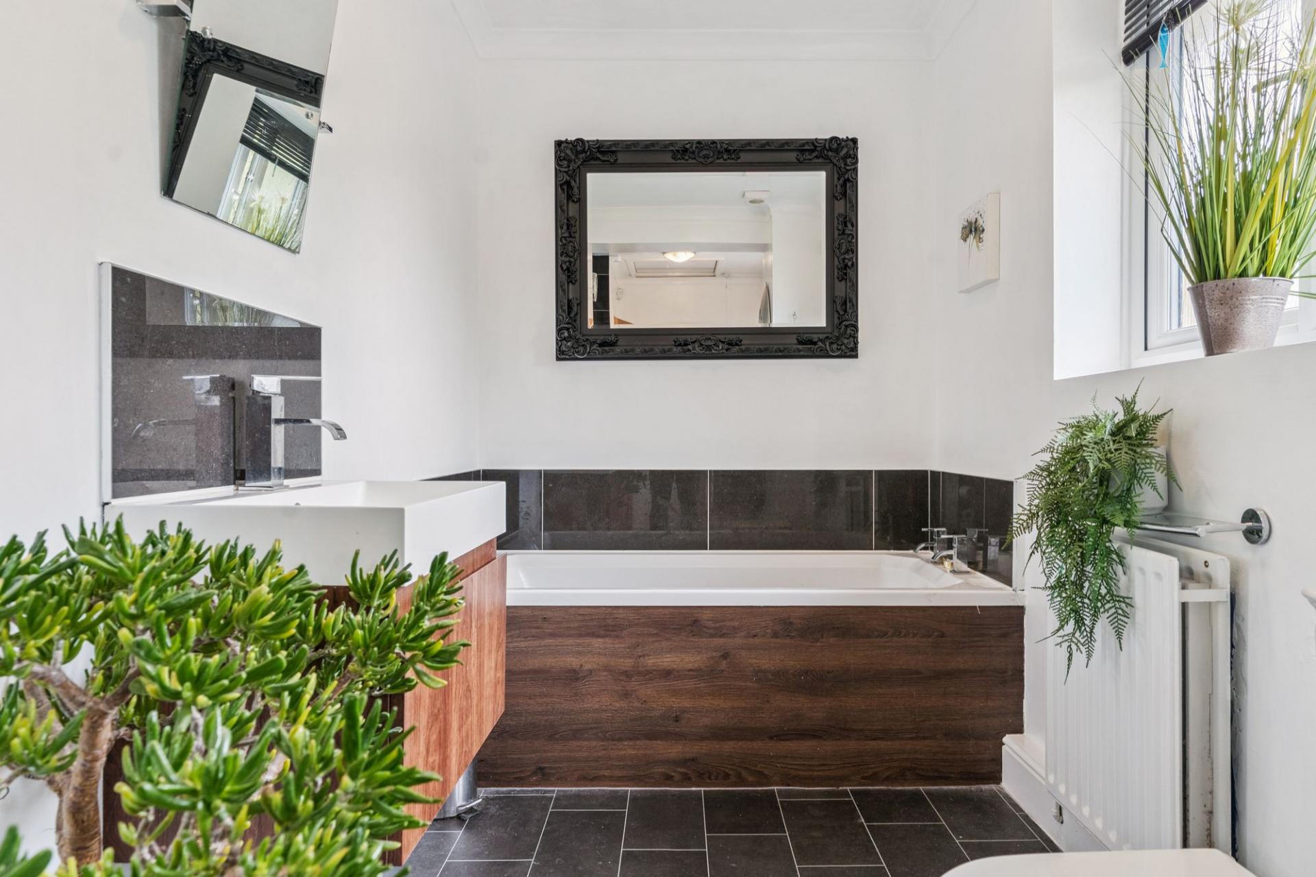 Serving the additional bedrooms and completing the first-floor accommodation is a beautifully appointed family bathroom. Contemporary in design, it features a low-level W.C., wall-mounted wash hand basin with storage beneath, a separate shower cubicle, and a panelled bath—offering both practicality for everyday family life and a touch of luxury for relaxation and unwinding.