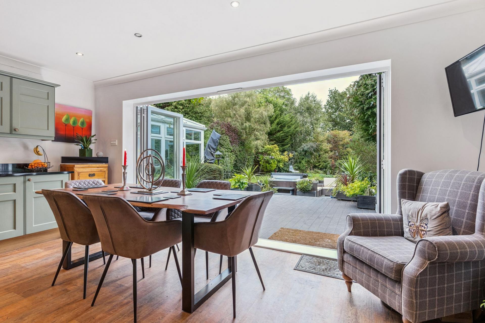 Upon entry, a welcoming hall complete with a downstairs cloakroom introduces the home and opens into the magnificent formal sitting room, an impressive space extending over 32 ft. in length. To the front, the sitting room is centred around a charming log burning stove, offering a warm and inviting atmosphere for everyday relaxation, while its scale makes it equally well suited to entertaining family and friends, or simply unwinding with family to enjoy a movie. To the rear, bi-folding doors lead seamlessly into a bright conservatory, perfectly positioned to enjoy uninterrupted views of the private rear garden.