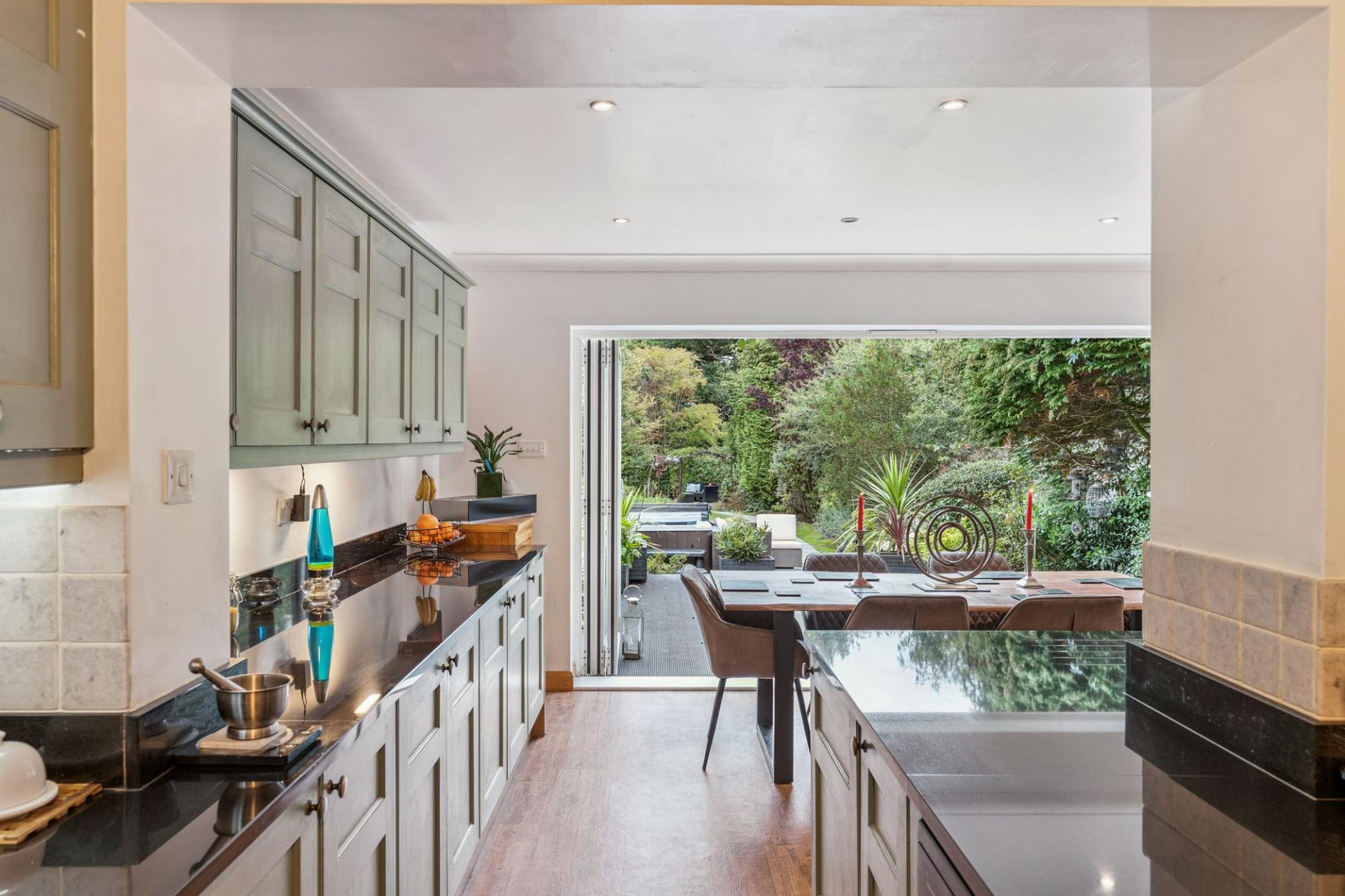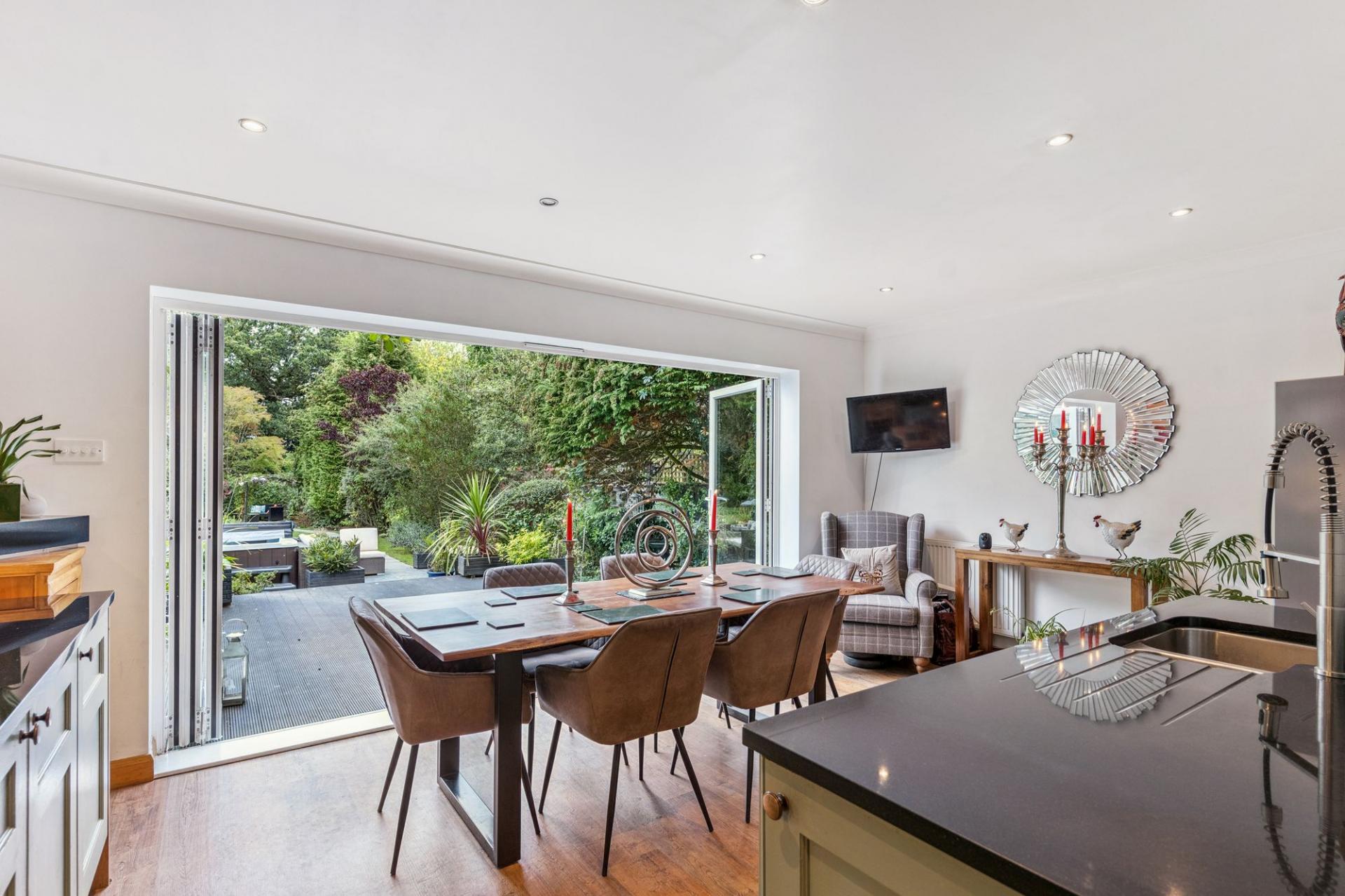 The extended kitchen/breakfast/dining room forms the true hub of the home, beautifully arranged around a central island, complete with a breakfast bar. Fitted with a range of stylish base and wall-mounted units topped with Quartz surfaces, the kitchen is as functional as it is attractive, incorporating a wine cooler, space for a Rangemaster cooker and a fridge/freezer. The kitchen effortlessly flows into the dining area, where bi-folding doors open directly onto the secluded rear garden, creating the perfect setting for both relaxed family living and more formal entertaining.