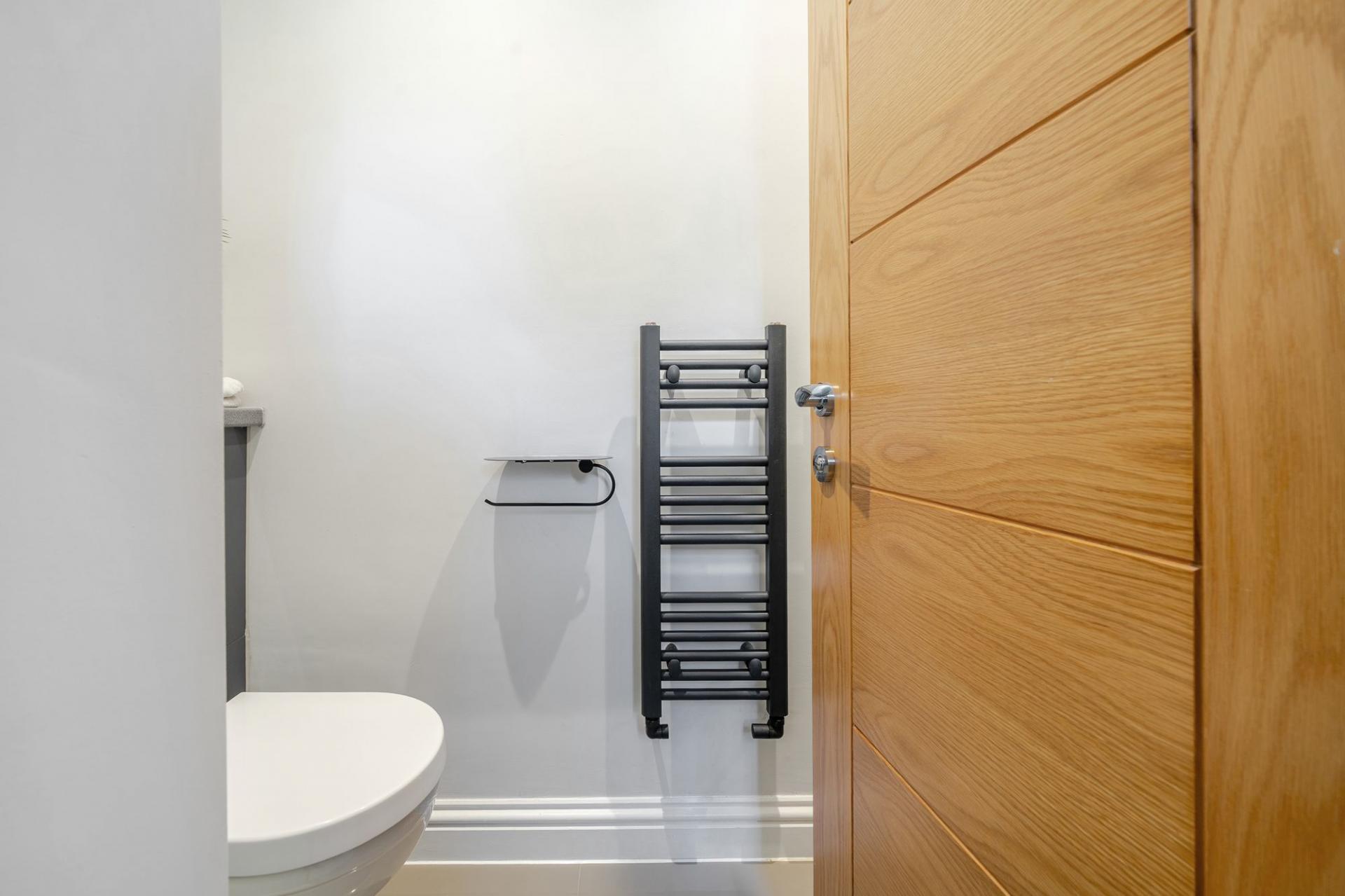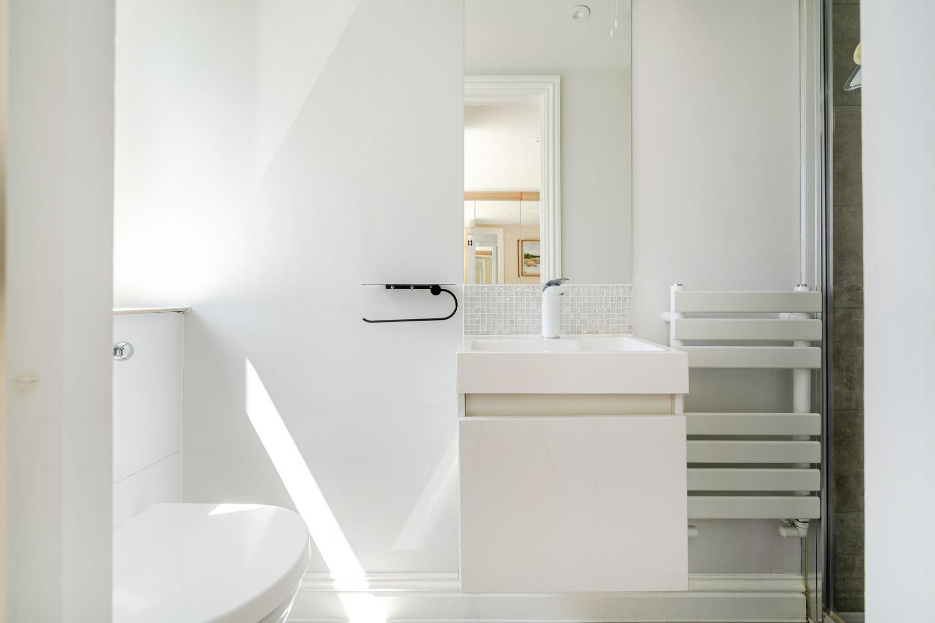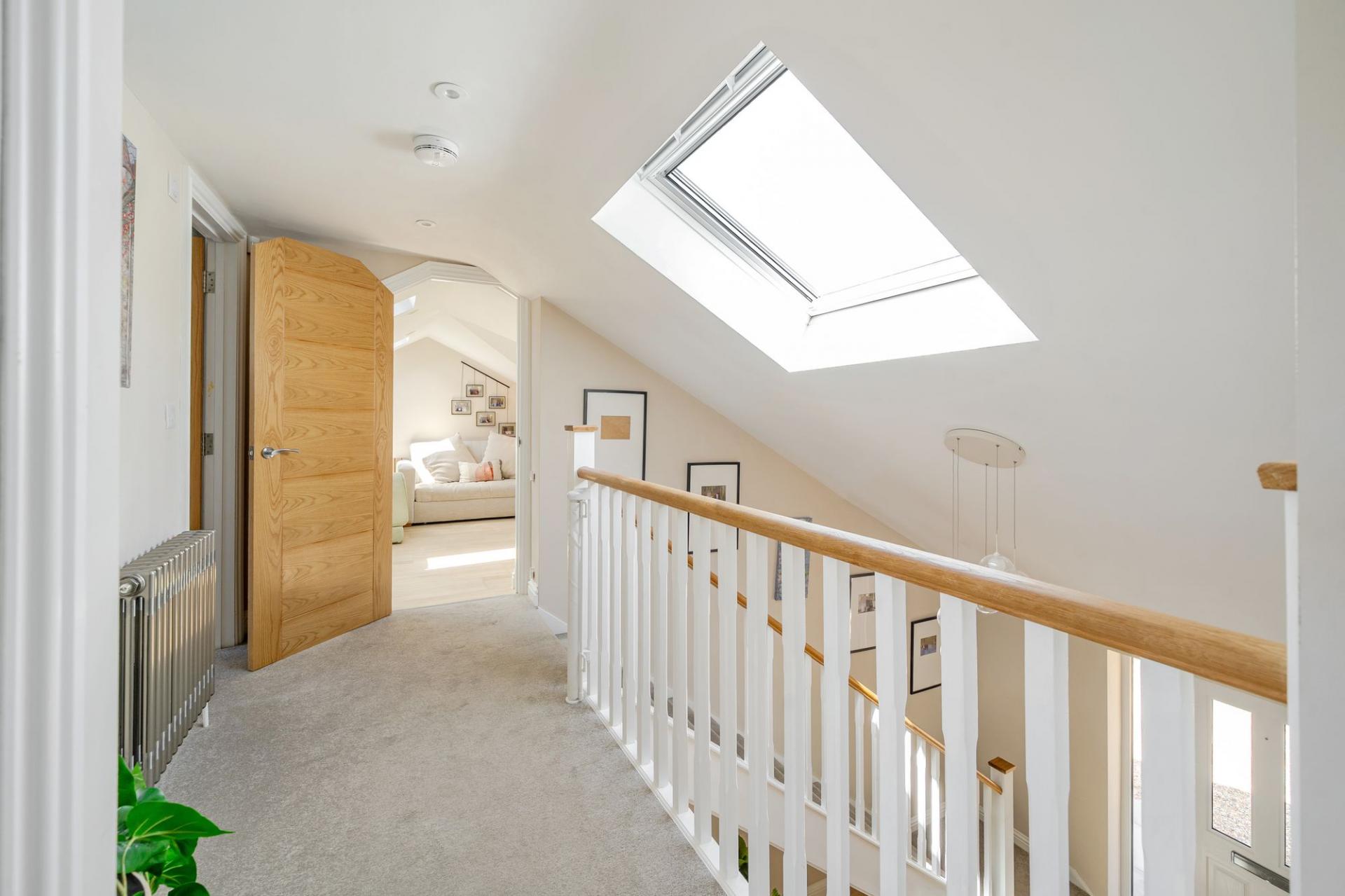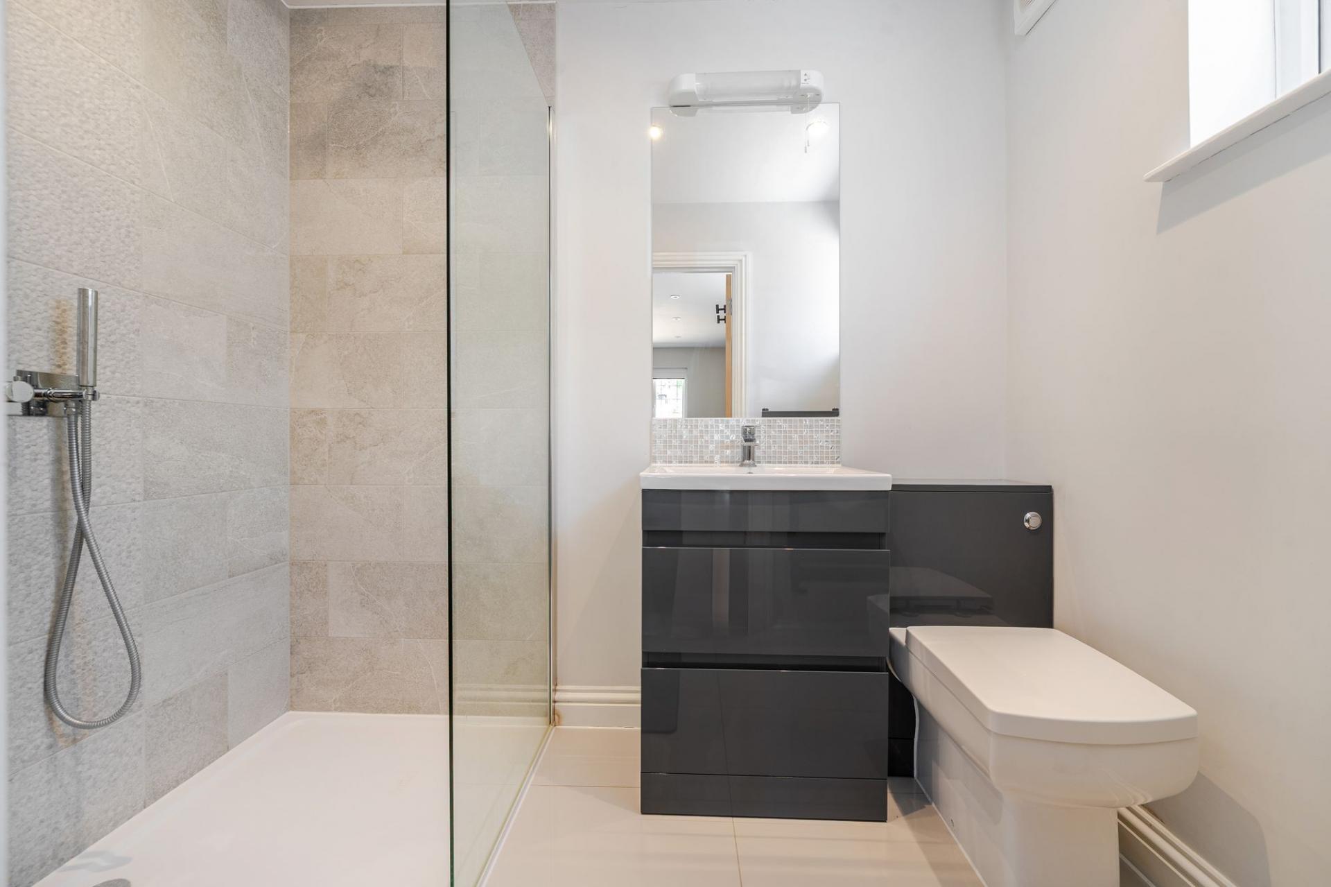 Upstairs, the principal suite is a true retreat, complete with its own dressing area, sleek en suite shower room, and a Juliet balcony overlooking the garden. Both the principal bedroom and a spacious second upstairs bedroom benefit from integrated air conditioning for year-round comfort. A further flexible room currently used as a study/bedroom also enjoys its own modern en suite shower room, making it ideal for home working or additional accommodation. A beautifully appointed family bathroom and convenient eaves storage complete the first floor.