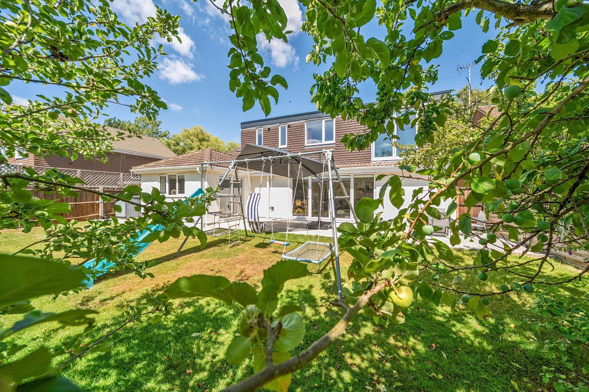 Outside, the property is approached via a large private gravel driveway offering ample off-road parking for residents and guests. The south-facing rear garden provides a tranquil setting, with a generous patio area perfect for entertaining, a manicured lawn, and mature fruit trees—including apple, pear, and plum—creating a serene, sun-filled retreat.