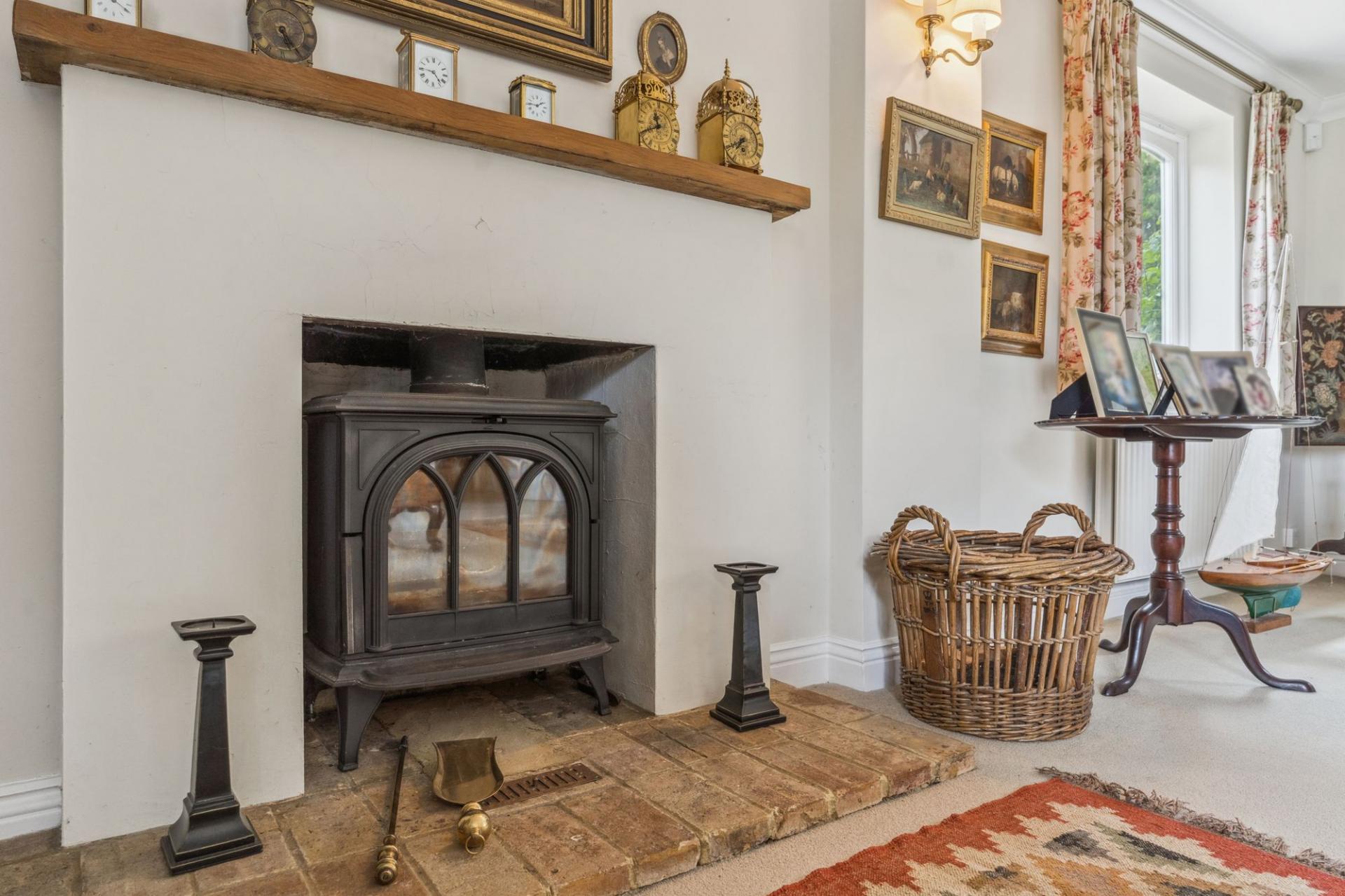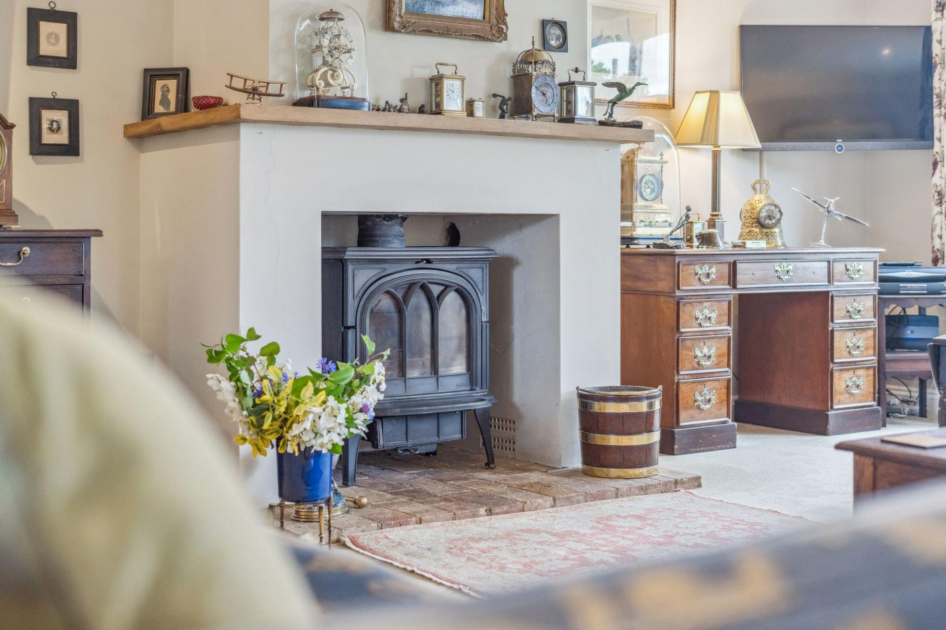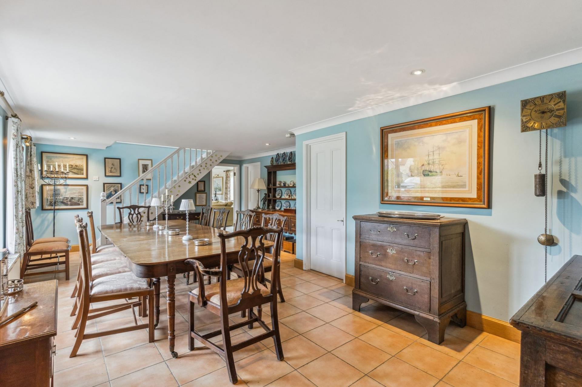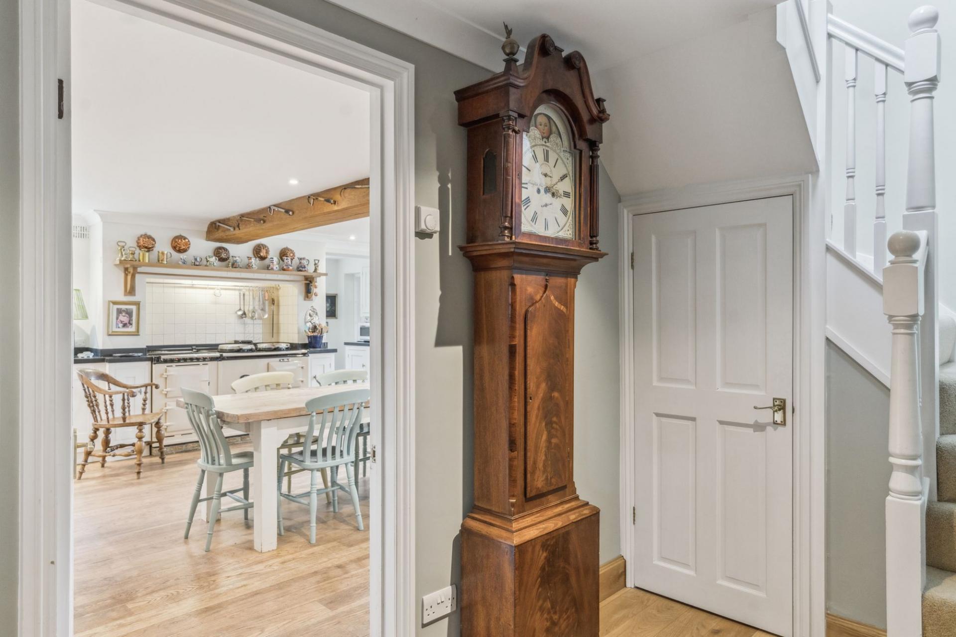 The main house is approached via electric gates leading to a spacious gravel driveway and formal entrance porch. Inside, the reception hall leads to five characterful reception rooms, each with its own sense of space and charm. The triple-aspect sitting room, complete with a wood-burning stove and garden views, flows into a beautifully glazed garden room that captures the changing light throughout the day. A second triple-aspect family room also enjoys a wood-burning stove, while the formal dining room—connected to the kitchen and family room—offers a flexible entertaining space for formal gatherings. The heart of the home is a character-rich kitchen/breakfast room with farmhouse cabinetry, a fitted Aga, double butler sink, granite worktops, and a large walk-in pantry with oak shelving. A stable door opens to the gardens, further connecting the interior with the stunning outdoor landscape. A cloakroom and utility room complete the ground floor accommodation.
